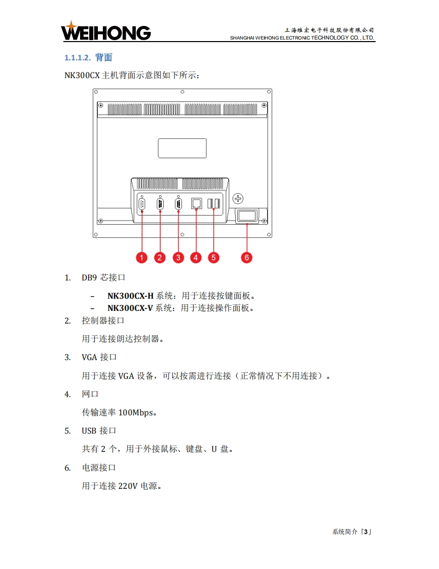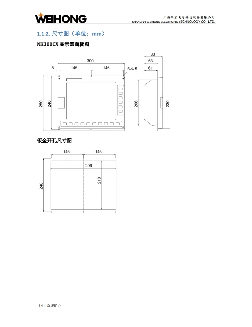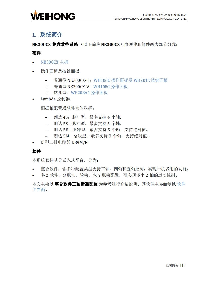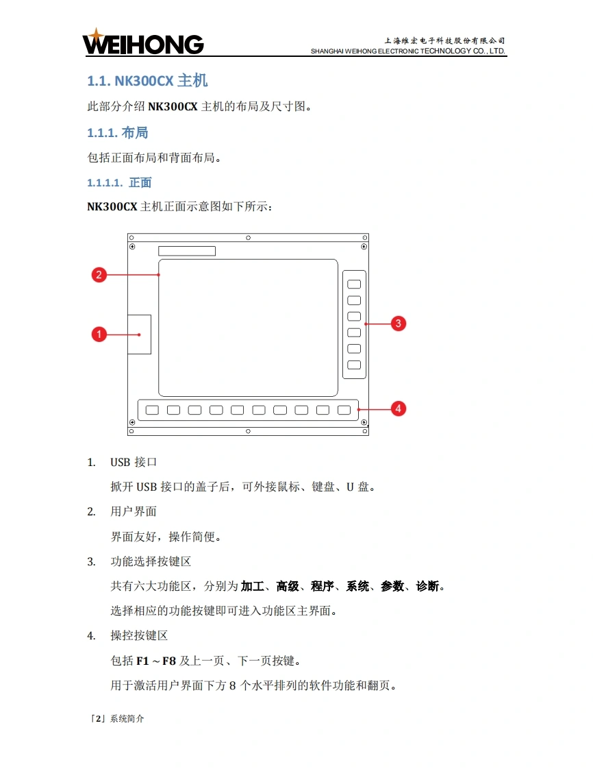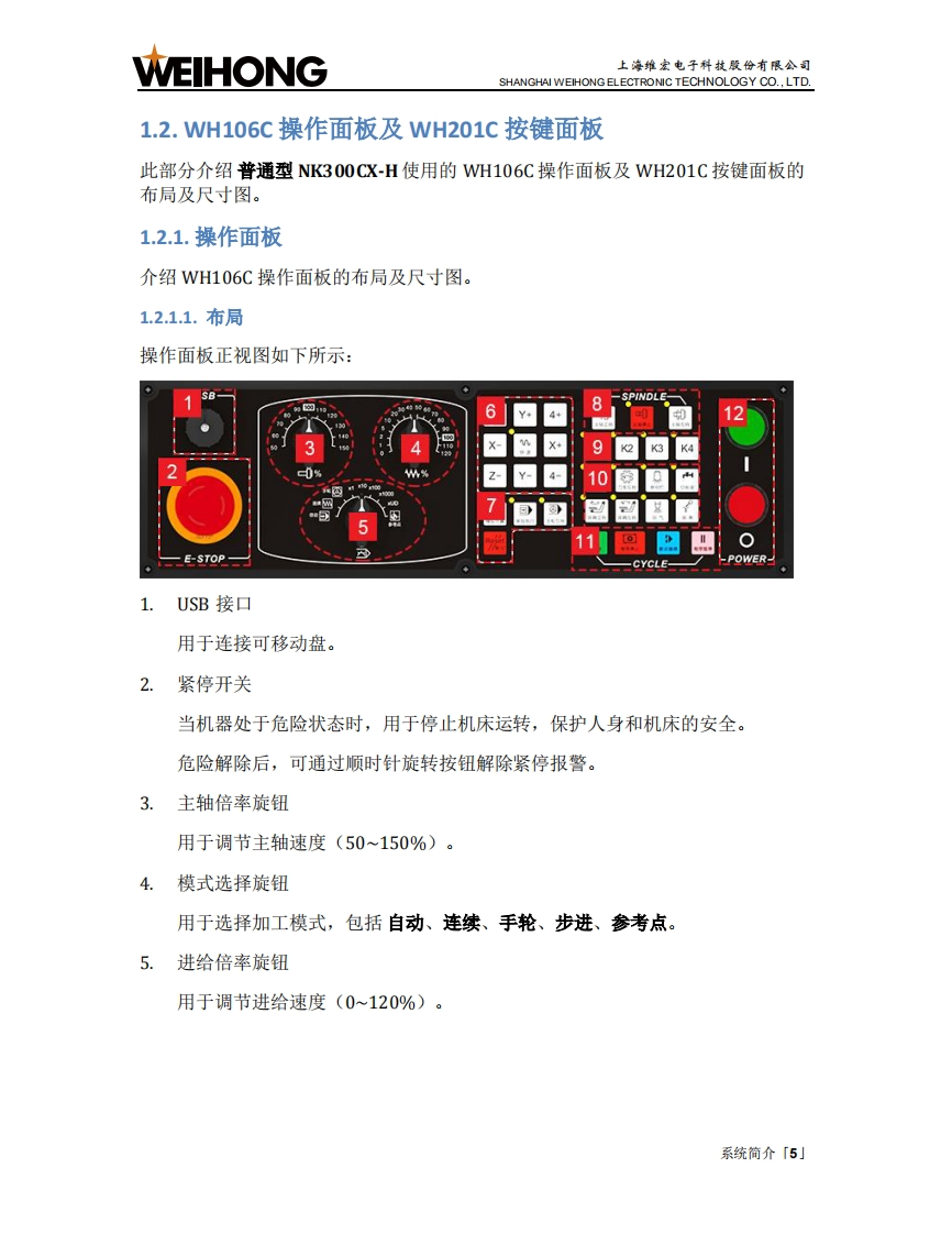 WEIHONG上海维宏电子科技股份有限公司SHANGHAI WEIHONG ELECTRONIC TECHNOLOGY CO.,LTD.目录1.系统简介1.1.NK300CX主机.21.2.WH106C操作面板及WH201C按键面板.51.3.WH108C操作面板...91.4.WH208A1操作面板.111.5.软件主界面.152.快速开始..162.1.管理程序文件.162.2.对刀212.3.调整工件坐标系,252.4.确定工件原点.…272.5.选刀加工.292.6.选行加工。312.7.开始加工333.常见问题333.1.注册失败。333.2.对刀超程报警。343.3.Z轴超程保护。..34目录「1小