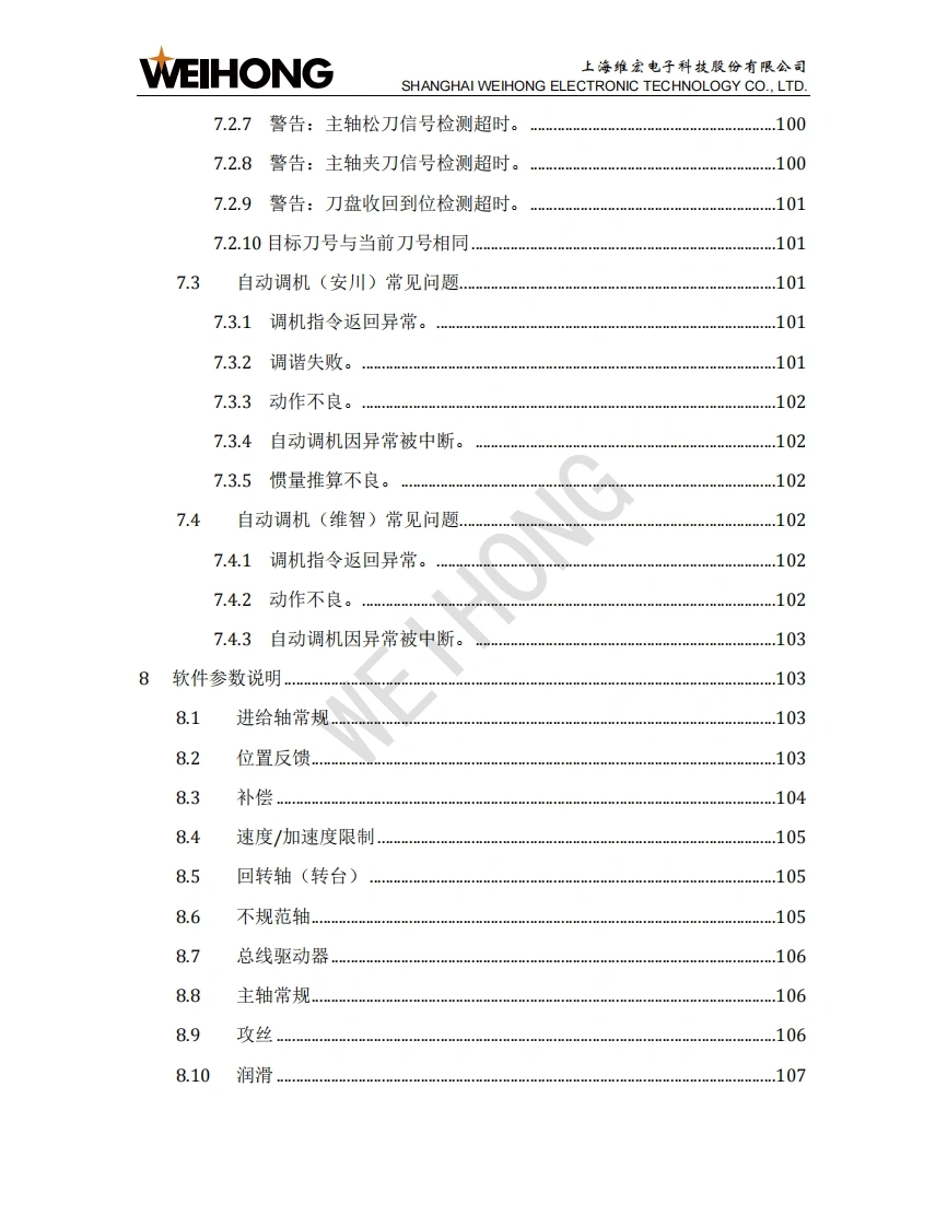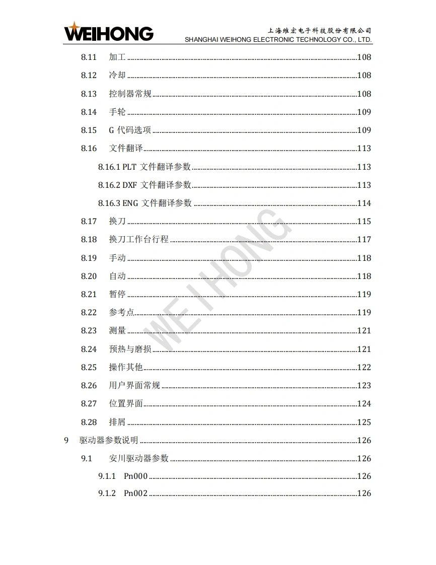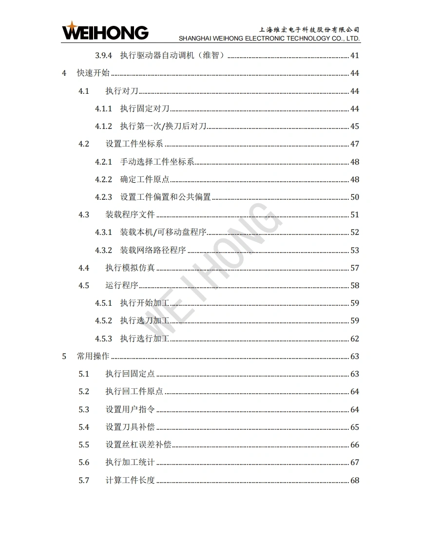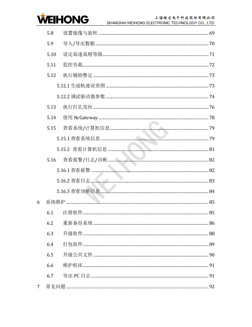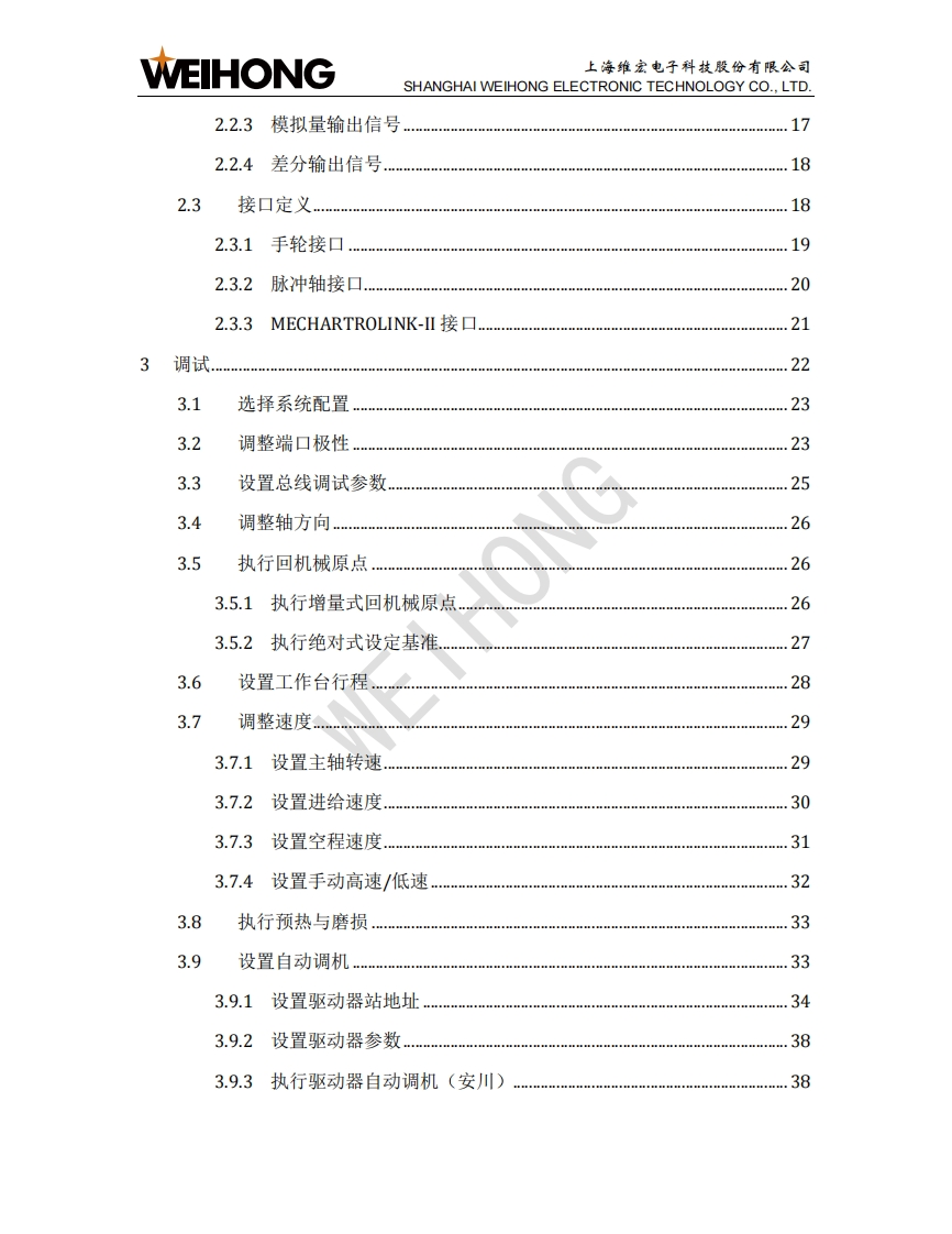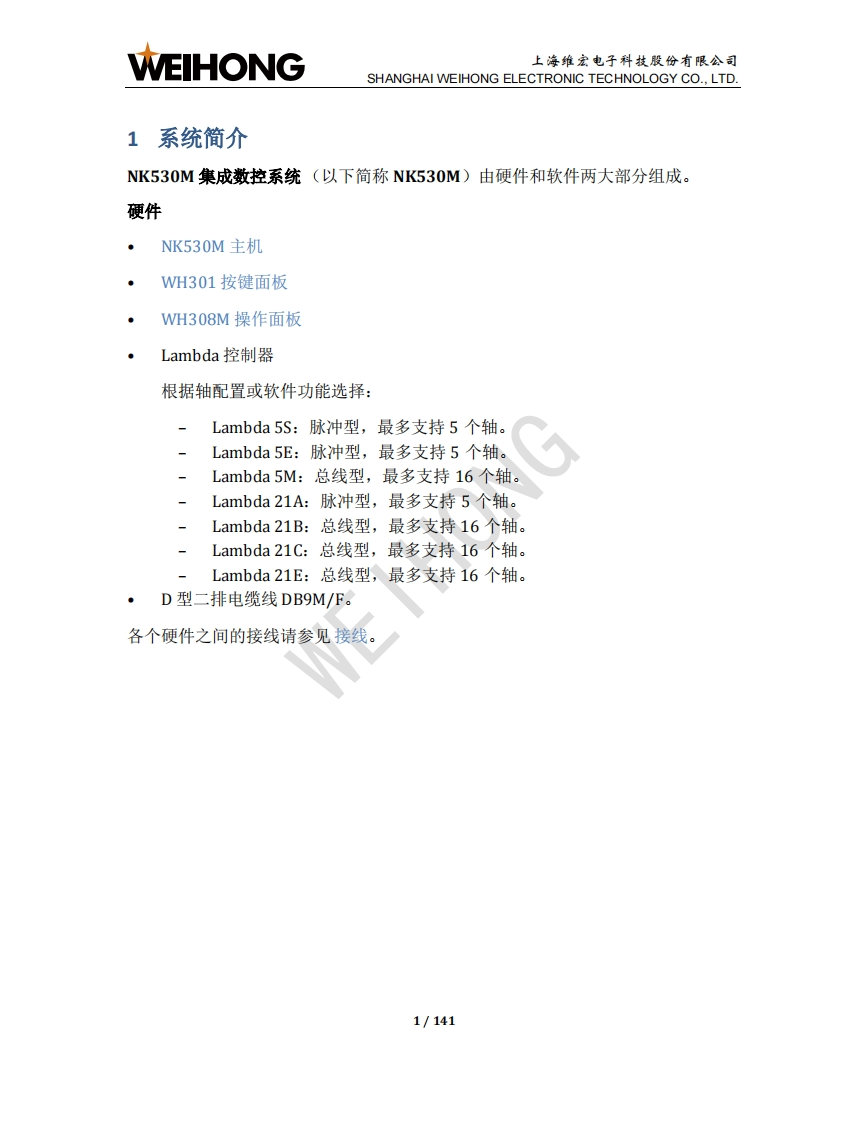 WEIHONG上海维宏电子科技股份有限公司SHANGHAI WEIHONG ELECTRONIC TECHNOLOGY CO.,LTD.NK530M集成数控系统厂商手册版次:2020年4月3日第1版作者:产品支持部上海维宏电子科技股份有限公司版权所有目录1系统简介1.1NK530M主机..31.1.1正面..31.1.2背面1.2WH301按键面板..51.2.1正面…..51.2.2背面.71.3WH308M操作面板81.3.1正面81.3.2背面.111.4软件主界面….122接线132.1示意图.132.1.1尺寸图(单位:mm).132.1.2连接示意图…142.1.3电源开关电气原理图..152.2信号类型.162.2.1开关量输入信号..162.2.2继电器输出信号.17