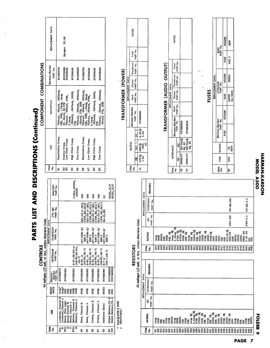 HARMAN-KARDON爱虽PHOTOFACT°FolderMODEL A500MODEL A500HARMAN-KARDONTRADE NAMEHarman-Kardon Model A500MANUFACTURERHarman-Kardon,Inc.,Ames Court,Plain View L.I.,N.Y.TYPE SETAC Operated 9 Tube Stereo AmplifierPOWER SUPPLY105 -125 Volta AC,60 CyclesRATING 120 Watts,1.2 Amp.117 Volts ACSET 579HOWARD W.SAMS CO.,INC.Indianapolls 6,IndianaThe listing of any available replacement part herein doesthe particular type of replacement part listed.Repro-ase a rn,Wduction or use.without express permission,of editorial orE热plctorlal content,in any manner,and suitability of such replacement part.The numbers ofabitysasued withreeett。品oheteause of the informa-FOLDER 9these parts have been compiled from information furnishedtion contained herein.1962 Howard W.Sams Co.,Ine.rd.Samo Ine.by the manufacturera ofIndianapolis 6,Indiana.Printed in U.S.of AmericaDATE 5-62SET 579FOLDER9