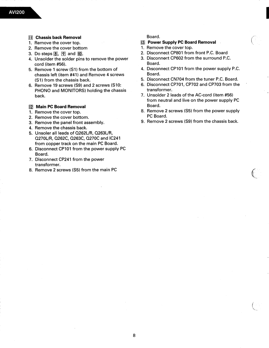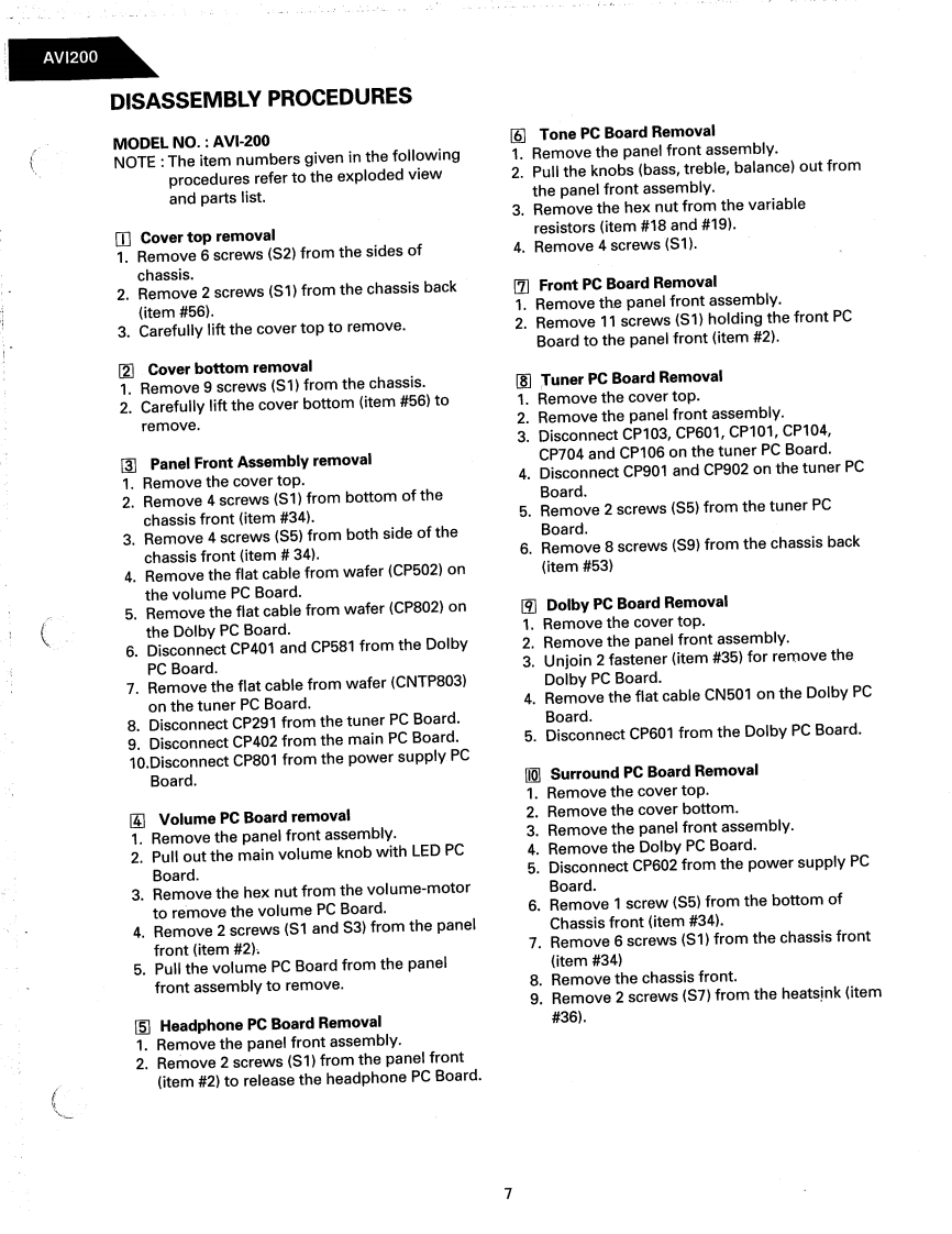 The Harman KardonModel AV1200Manual 188AAUDIO AND VIDEO AMPLIFIERTechnical Manual■CONTENTSSPECIFICATIONS..................…2GENERAL UNIT PARTS LIST ..................22LEAKAGE TESTGENERAL UNIT…23CONTROLS AND FUNCTIONSPRINTED CIRCUIT BOARDS…25DISASSEMBLY PROCEDURES........................7ELECTRICAL PARTS LIST....................31CIRCUIT DESCRIPTION…9ICS LEAD IDENTIFICATION............40BLOCK DIAGRAM…15SCHEMATIC DIAGRAMS.............................49WIRING DIAGRAM........................7TRANSISTORSTROUBLESHOOTING4…4…19LEAD IDENTIFICATION .............55harman/kardonParts and Service Office240 Crossways Park West,Woodbury,N.Y.117971112-0330A152 G9212 1500 Printed in Korea