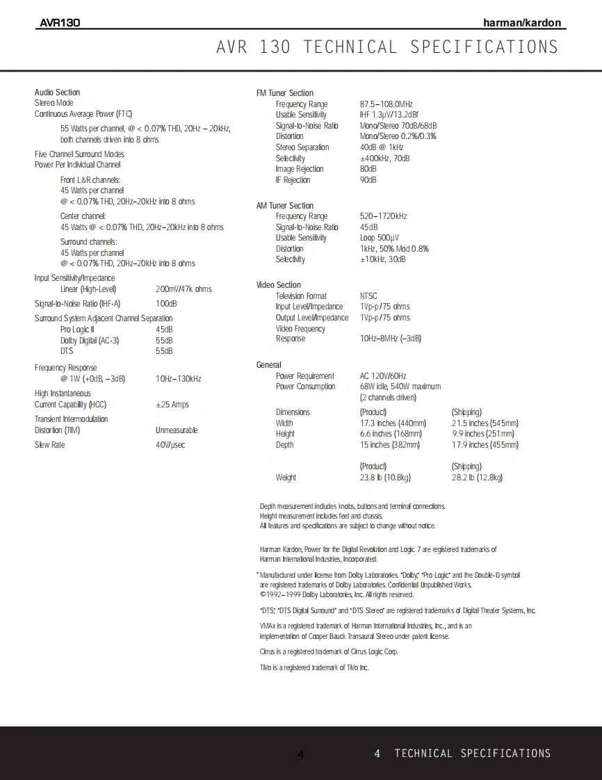 harman/kardonAVR1305X 45W 5.1 CHANNEL AV RECEIVERSERVICE MANUALAR国互DVD/C0AX1四田四D0 LBY DIGITAL四ow起可可可⊙司回回回harman/kardon●o⊙⊙CONTENTSESD WARNING........2UNIT EXPLODED VIEW...................17LEAKAGE TESTING.........3BLOCK DIAGRAM..............18BASIC SPECIFICATIONS...FRONT PANEL CONTROLS....4AMP BIAS ADJUSTMENT...................195PCB DRAWINGS...........20REAR PANEL CONNECTIONS.7ELECTRICAL PARTS LIST..................26REMOTE CONTROL FUNCTIONS............9SEMICONDUCTOR PINOUTS..............55TROUBLESHOOTING GUIDE................13SCHEMATICS.......................97PROCESSOR RESET....13WIRING DIAGRAM..113DISASSEMBLY......14PACKAGING....114BU儿LETIN HK2003-10......15harman/kardon,Inc.250 Crossways Park Dr.Woodbury,New York 11797Rev111/2004