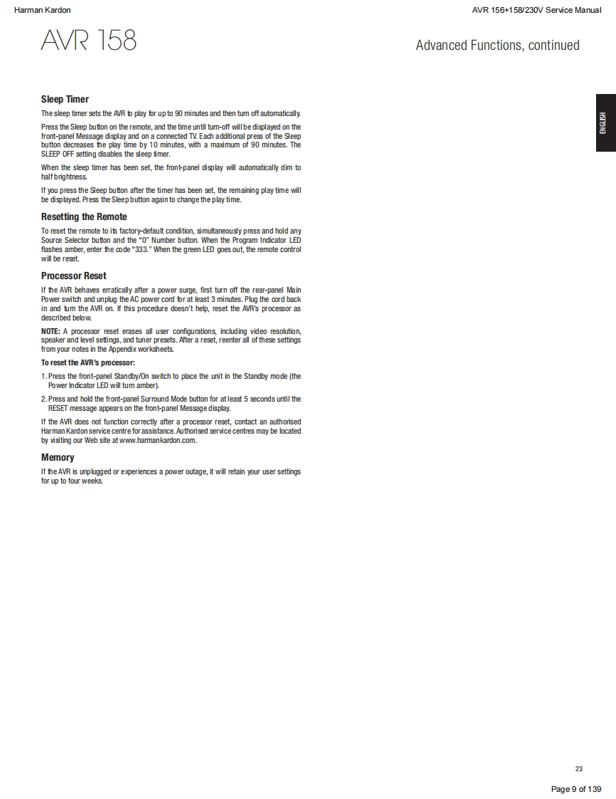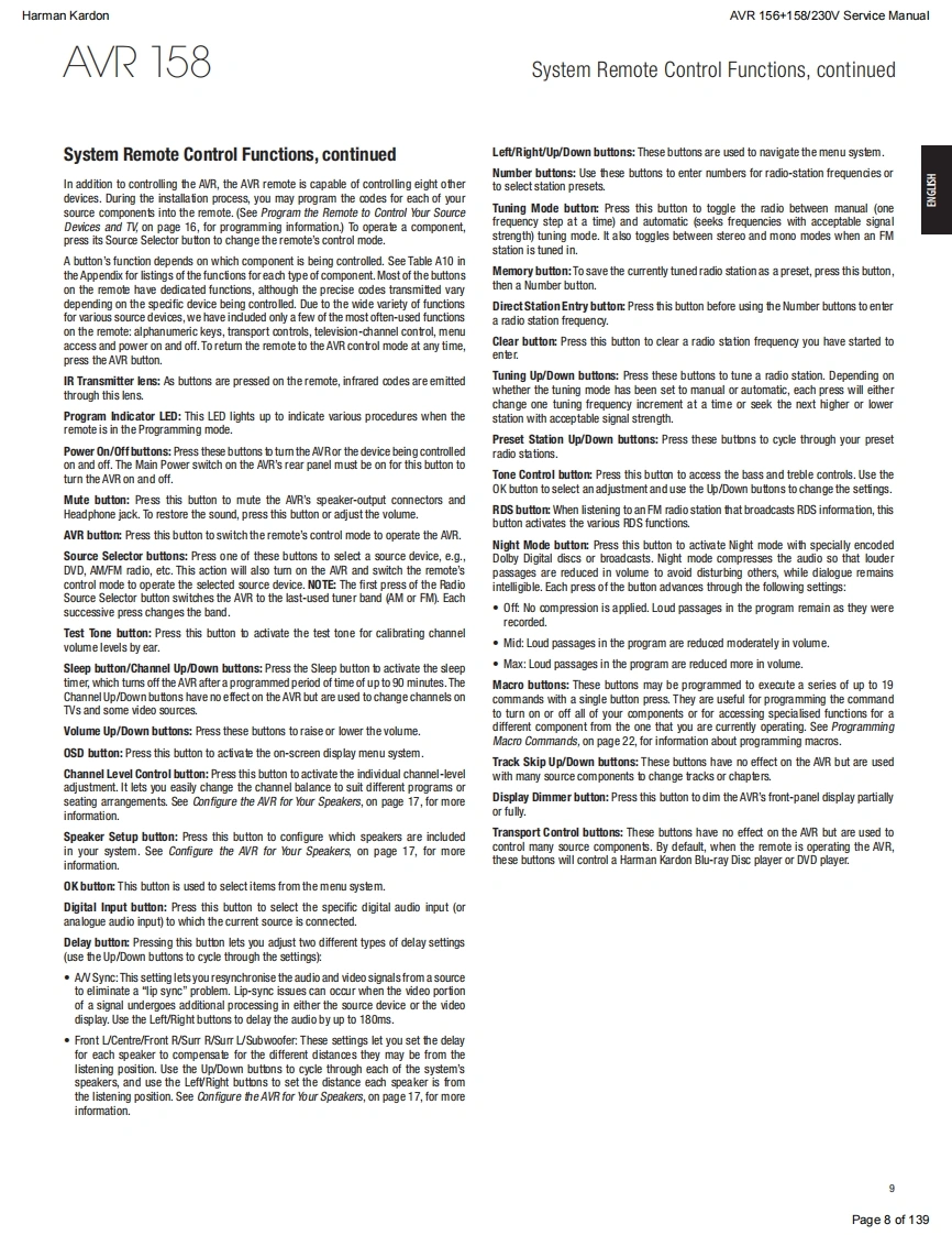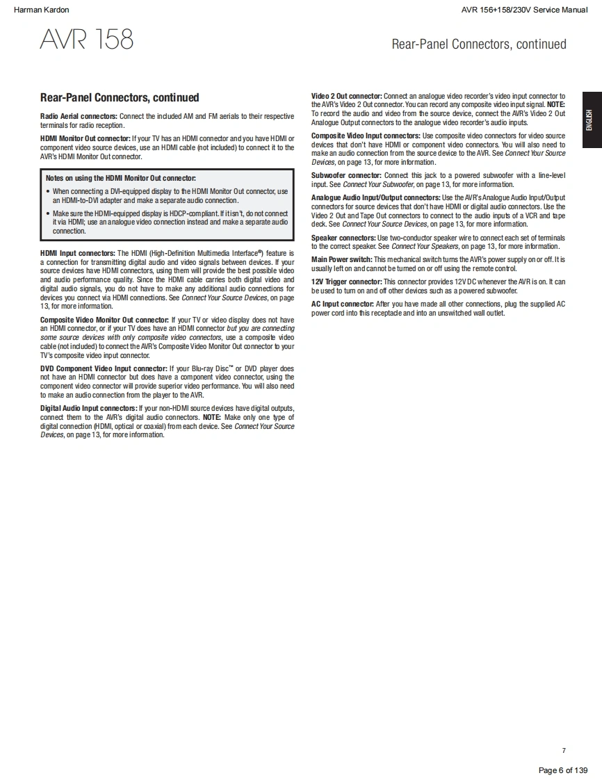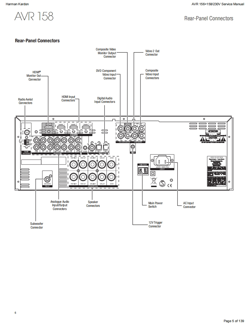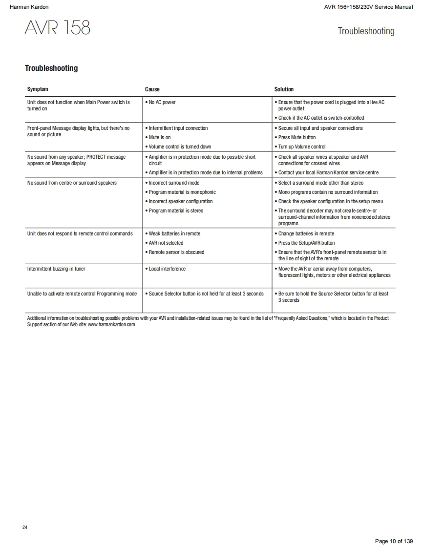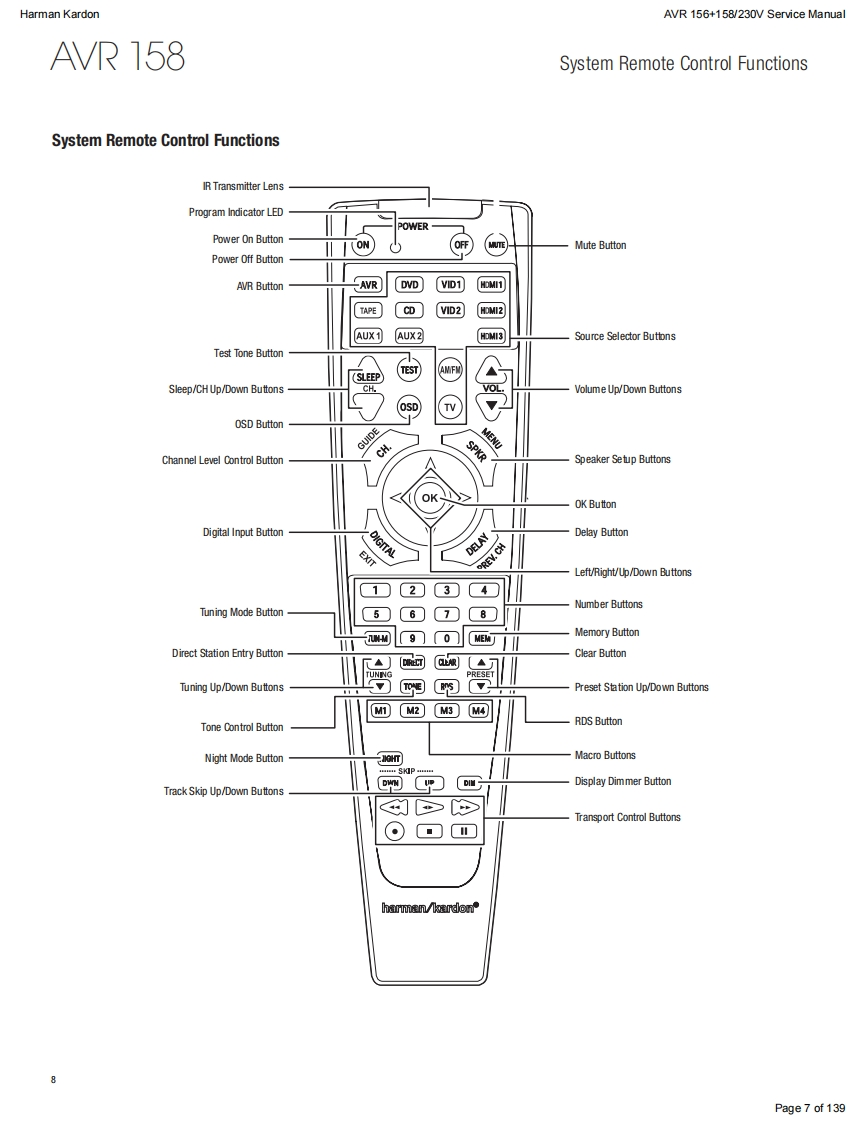 Harman KardonAVR 156+158/230V Service ManualHarman KardonService ManualAVR156/230+AVR158/2305.1 CHANNEL AN RECEIVERSW圆DUDLOGIC 7 MOVIEharman/kardonCONTENTSESD WARNINGEXPLODED VIEW AND PARTS,AVR 156 15FRONT AND REAR PANELSEXPLODED VIEW AND PARTS,AVR 158 16REMOTE CONTROL237ELECTRICAL PARTS LIST,AVR 15617RESET REMOTE AND PROCESSORELECTRICAL PARTS LIST,AVR 15845TROUBLESHOOTING GUIDE10SEMICONDUCTOR PINOUTS73BASIC SPECIFICATIONS11PCB DRAWINGS115PACKAGE LISTS AND PARTS,AVR 15612BLOCK DIAGRAMS125PACKAGE LISTS AND PARTS,AVR 15813WIRING DIAGRAM127DISASSEMBLY14AMP BIAS ADJUSTMENT128SCHEMATIC DIAGRAMS129-139Released EU2011Harman Consumer Group,Inc.Rev0,10/20118500 Balboa BoulevardNorthridge,California 91329Page 1 of 139