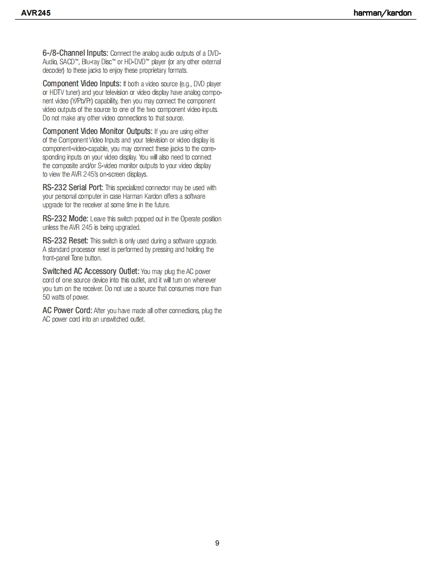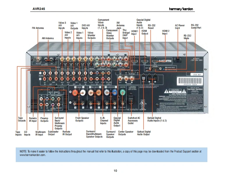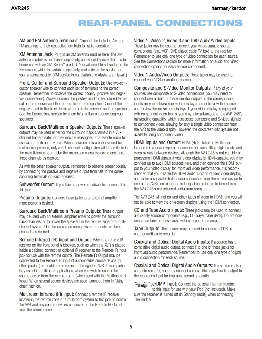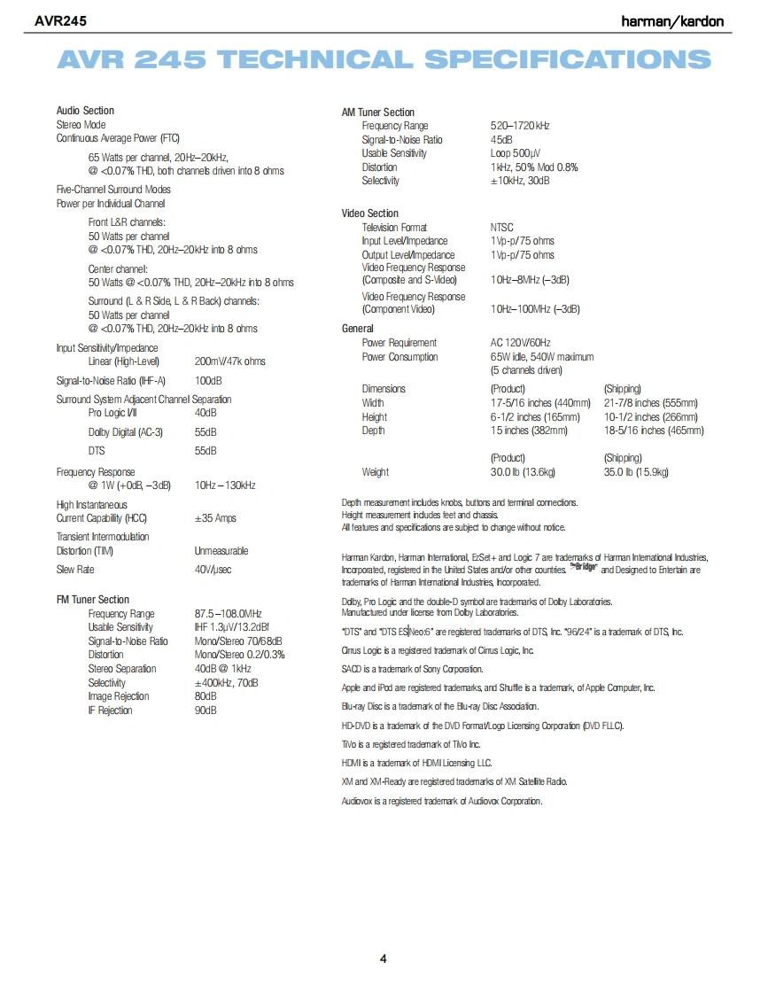 harman/kardonAVR2457X 50W 7.1 CHANNEL AV RECEIVERSERVICE MANUALR图·面脑?IVD/C0AX1四吕mL0Gic77CHUB日66666666harman/kardon⊙⊙⊙CONTENTSESD WARNING..........2DISASSEMBLY............34LEAKAGE TESTING...3UNIT EXPLODED VIEW.........38BASIC SPECIFICATIONS..............4EXPLODED VIEW PARTS LIST..............39PACKAGING.......5AMP BIAS ADJUSTMENT.....................40FRONT PANEL CONTROLS.................6BLOCK DIAGRAM.........................41REAR PANEL CONNECTIONS................8PCB DRAWINGS......................42REMOTE CONTROL FUNCTIONS..........11ELECTRICAL PARTS LIST............53CONNECTIONS/INSTALLATION.............14SEMICONDUCTOR PINOUTS...............97OPERATION.25SCHEMATICS....220TROUBLESHOOTING GUIDE.................32WIRING DIAGRAM.......................228REMOTE PROCESSOR RESETS..........33hamman/kardon,Inc.250 Crossways Park Dr.Woodbury,New York 11797Rev01/2007
