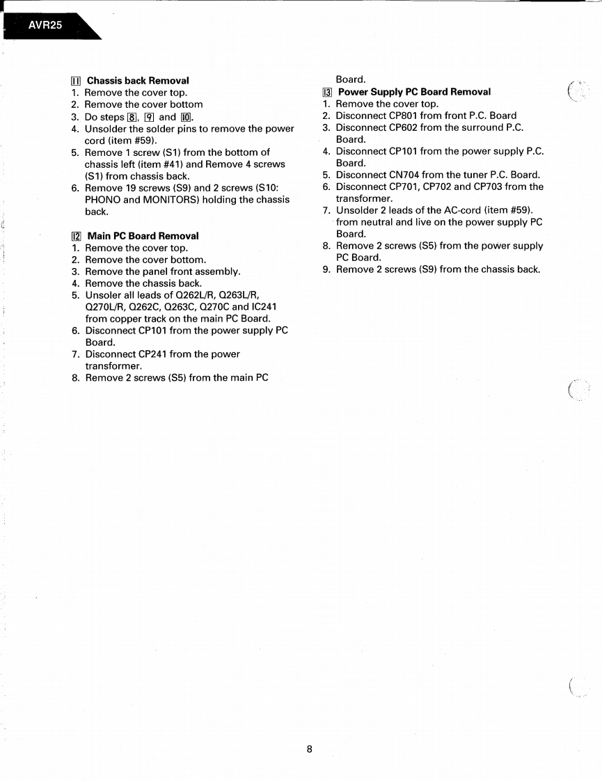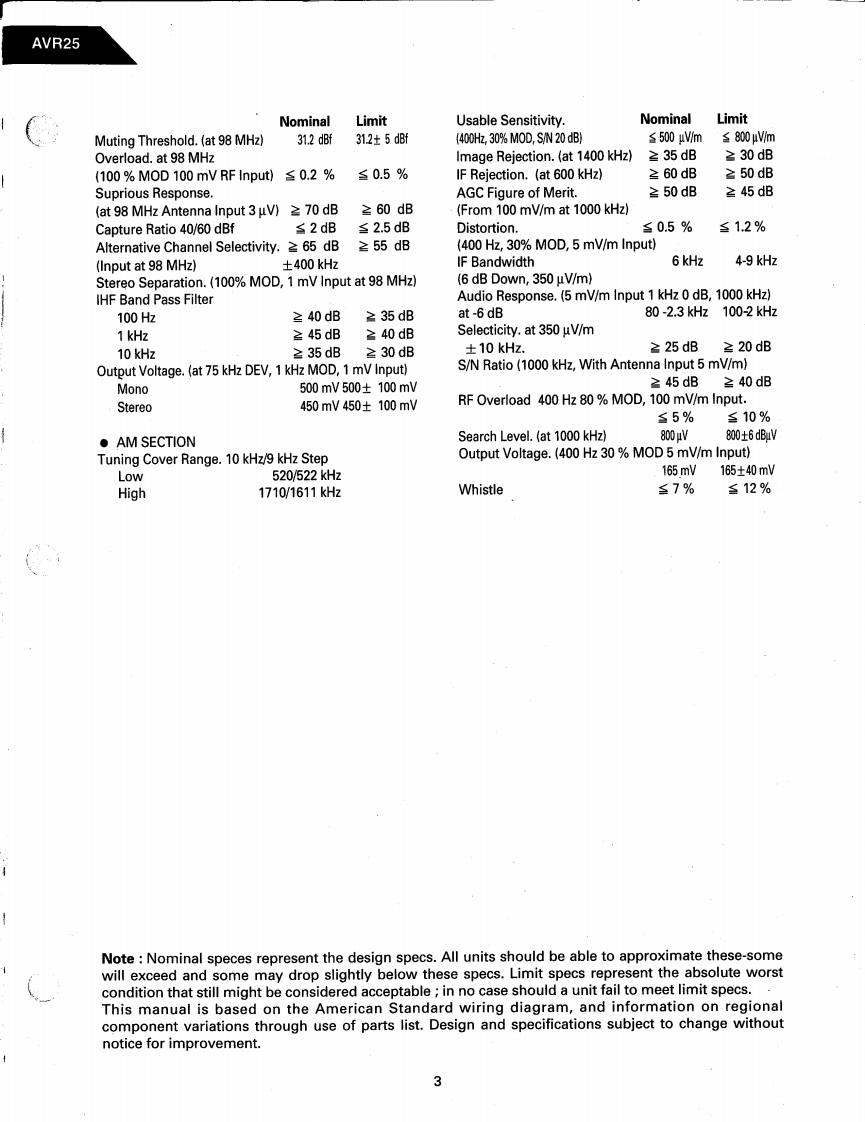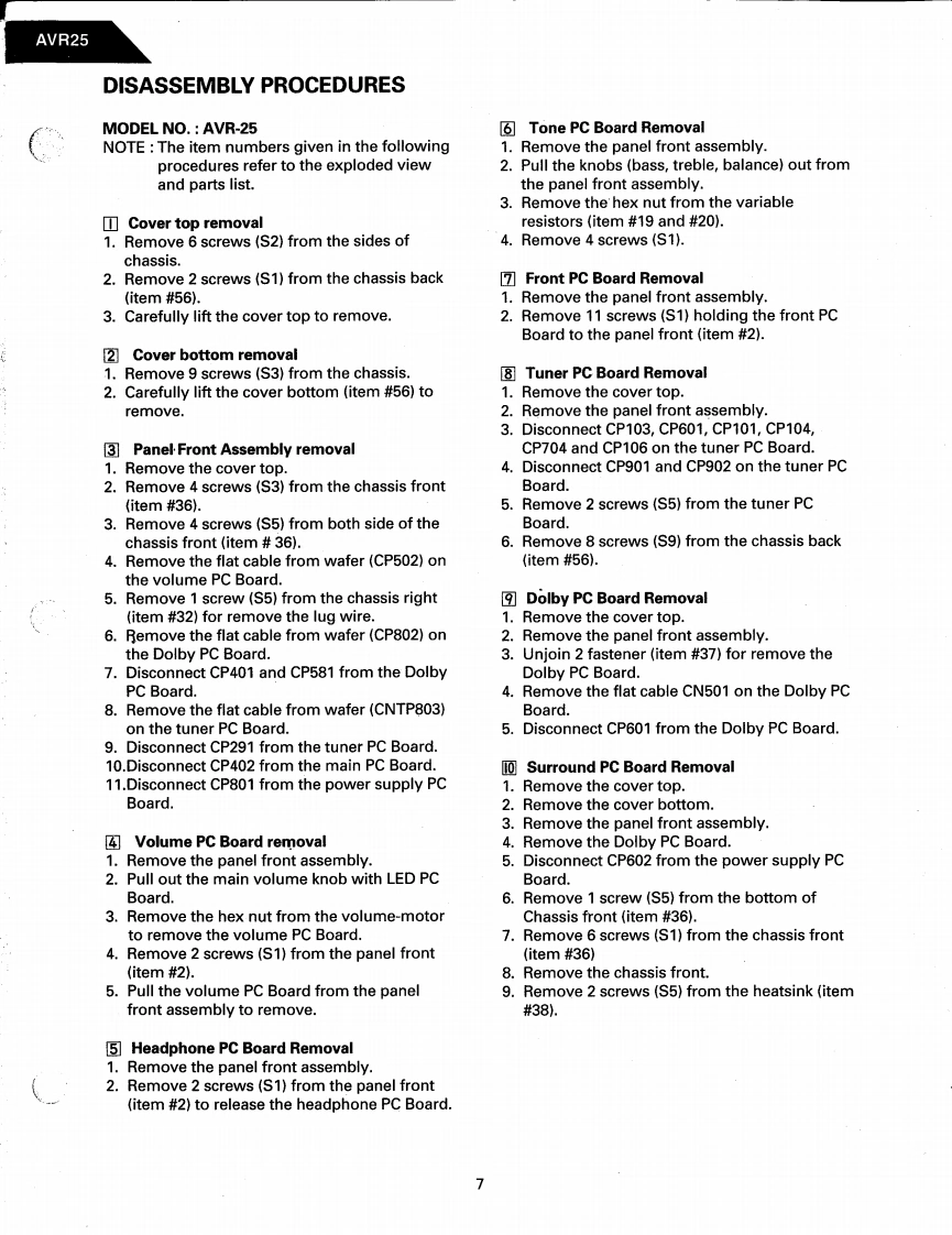 CThe Harman KardonModel AVR25Manual 188AAUDIO AND VIDEO RECEIVERTechnical Manual0oO■CONTENTSSPECIFICATIONS…2GENERAL UNIT PARTS LIST................28LEAKAGE TESTGENERAL UNIT…29CONTROLS AND FUNCTIONS4…5PRINTED CIRCUIT BOARDS…31DISASSEMBLY PROCEDURES.................7ELECTRICAL PARTS LIST...........37ALIGNMENT PROCEDURES......9ICS LEAD IDENTIFICATION.....46CIRCUIT DESCRIPTION…12SCHEMATIC DIAGRAMS55BLOCK DIAGRAM..…21TRANSISTORS…61WIRING DIAGRAM…23LEAD IDENTIFICATIONTROUBLE SHOOTING.25harman/kardonParts and Service Office240 Crossways Park West,Woodbury,N.Y.117971112-0330A152 G9212 1500 Printed in Korea