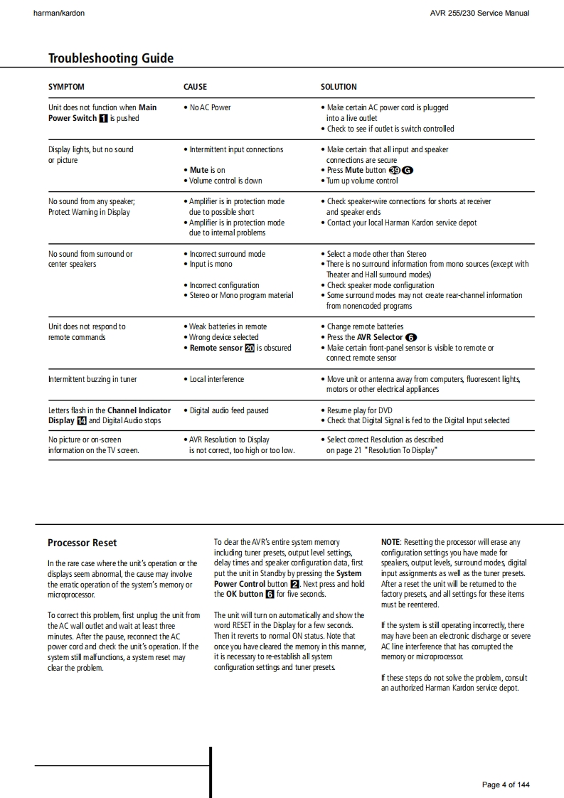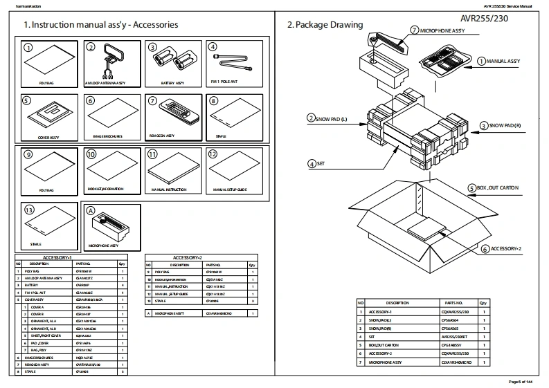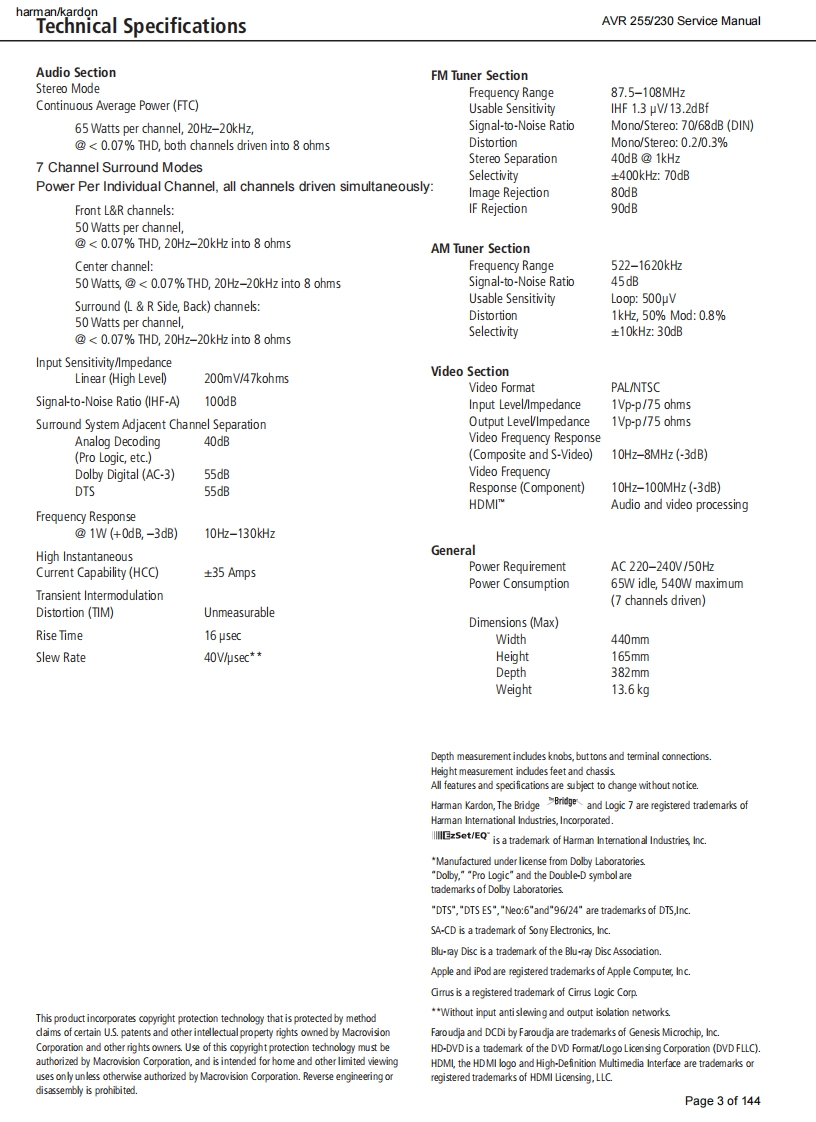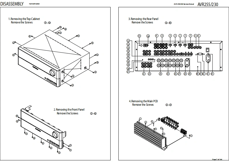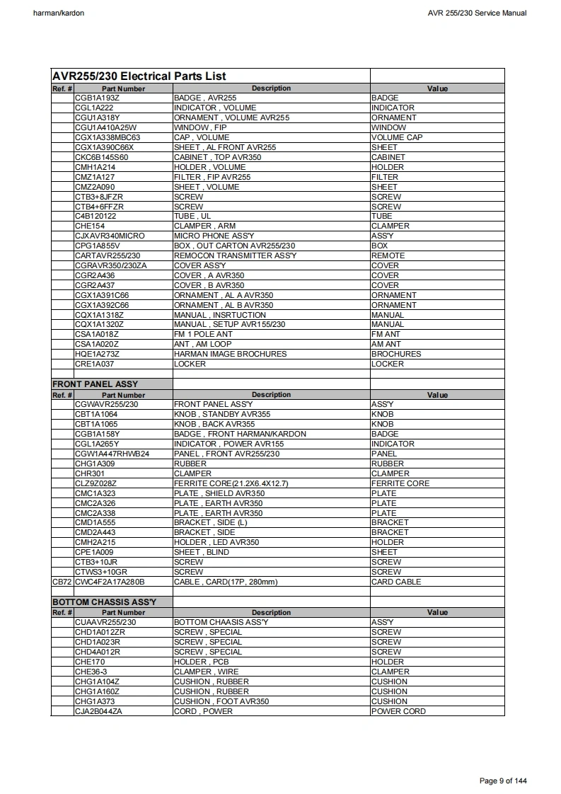 harman/kardonAVR 255/230 Service Manualharman/kardonService ManualAVR255/2307 x 50W 7.1 CHANNEL A/V RECEIVERR图DUD/HDMI 1DOLBY TRUE HDharman/kardonCONTENTSESD WARNINGELECTRICAL PARTS LISTBASIC SPECIFICATIONS23SEMICONDUCTOR PINOUTS50TROUBLESHOOTING GUIDE4PCB DRAWINGS121PROCESSOR RESET4BLOCK DIAGRAM129REMOTE RESET5WIRING DIAGRAM130PACKAGE LIST AND PARTS6AMP BIAS ADJUSTMENT131DISASSEMBLY7SCHEMATIC DIAGRAMS132EXPLODED VIEW AND PARTS8Released EU2008harman/kardon,Inc.Rev0,072008250 Crossways Park Dr.Woodbury,New York,11797Page 1 of 144