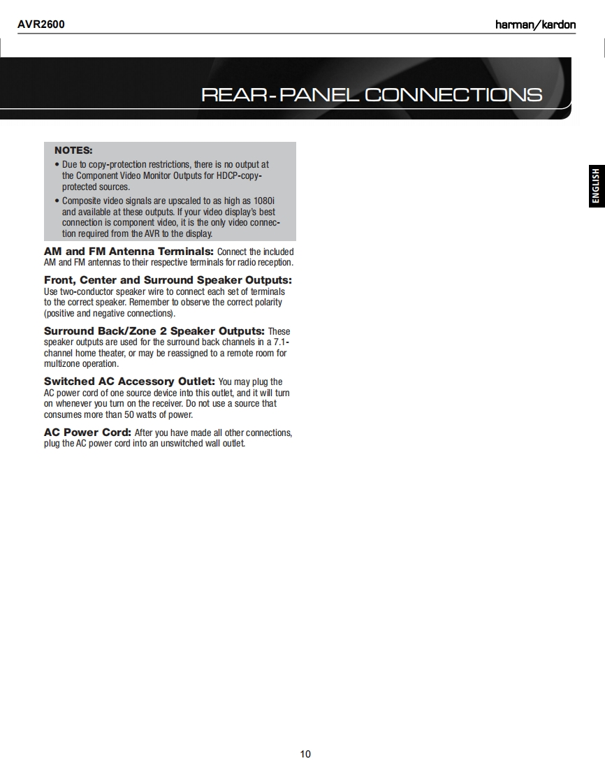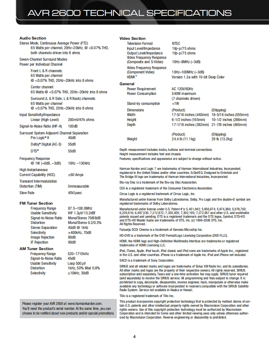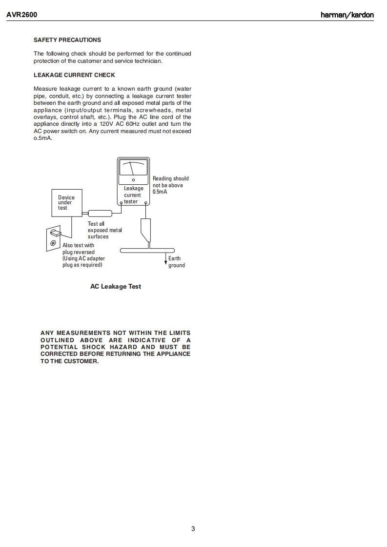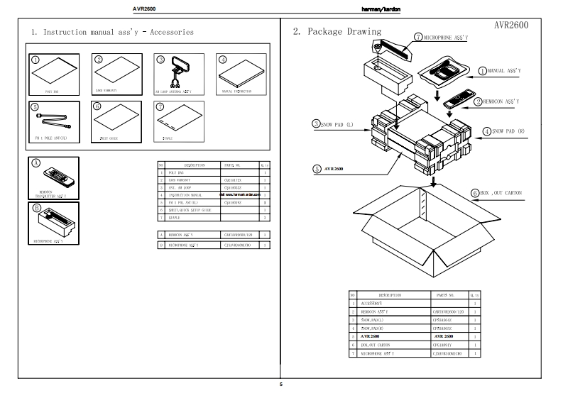 harman/kardonAVR 26007 X 65W 7.1 CHANNEL AN RECEIVERSERVICE MANUALAWR题BLU-RAY DIS℃DOLBY TRUEHDharman/kardonCONTENTSESD WARNINGREMOTE PROCESSOR RESETS..........27LEAKAGE TESTING..................3DISASSEMBLY.28BASIC SPECIFICATIONS.................4UNIT EXPLODED VIEW.............29PACKAGING...........5EXPLODED VIEW PARTS LIST...............30FRONT PANEL CONTROLS.............6AMP BIAS ADJUSTMENT....................31REAR PANEL CONNECTIONS............8BLOCK DIAGRAM..................32REMOTE CONTROL FUNCTIONS..........11PCB DRAWINGS....................33CONNECTIONS/INSTALLATION.............14ELECTRICAL PARTS LIST..........40INITIAL SETUP..............17SEMICONDUCTOR PINOUTS.............81OPERATION.......21SCHEMATICS...........203TROUBLESHOOTING GUIDE................27MRING DIAGRAM.....….215harman/kardon,Inc.8500 Balboa Blvd.Released 2009Northridge,CA.91329Rev010/2009Discontinued XXXX