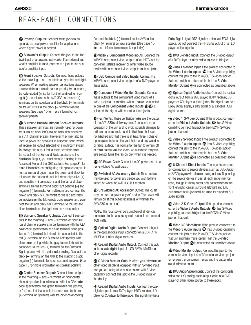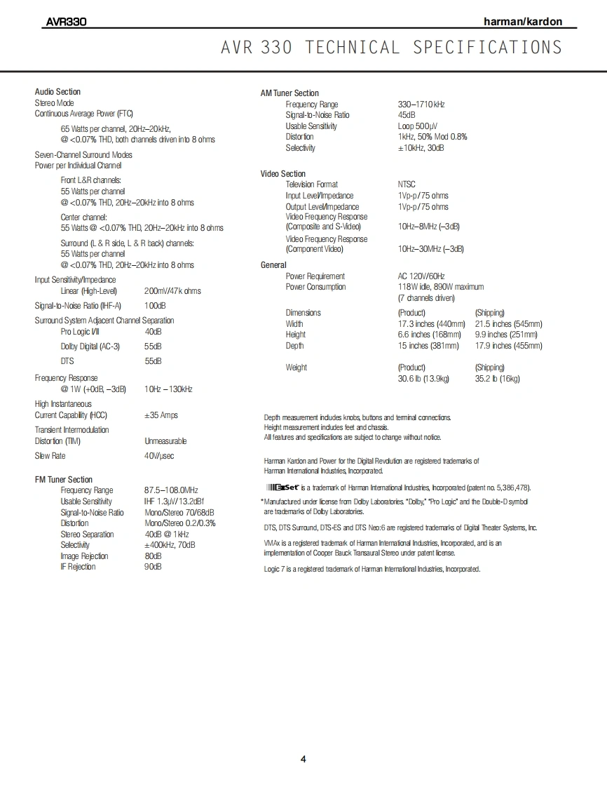 harman/kardonAVR3307 X 55W 7.1 CHANNEL AN RECEIVERSERVICE MANUALAVR 330互DVD/C0AX1四田四國DOLBY D EX四o四n6⊙o司回回回harman/kardon画⊙⊙0CONTENTSESD WARNING..........2TECH TIP HKTT2003-01......................22LEAKAGE TESTING..3UNIT EXPLODED VIEW.....................23BASIC SPECIFICATIONS.....................4BLOCK DIAGRAM.....2FRONT PANEL CONTROLS........5AMP BIAS ADJUSTMENT....................25REAR PANEL CONNECTIONS.........7PCB DRAWINGS..............27REMOTE CONTROL FUNCTIONS..........10ELECTRICAL PARTS LIST...................32TROUBLESHOOTING GUIDE.14SEMICONDUCTOR PINOUTS.72PROCESSOR RESET........14SCHEMATICS.113DISASSEMBLY........15WIRING DIAGRAM..........................129BULLETIN HK2003-10.........................16PACKAGING...........130TECH TIP HKTT2004-03..........18harman/kardon,Inc.250 Crossways Park Dr.Woodbury,New York 11797Rev172005