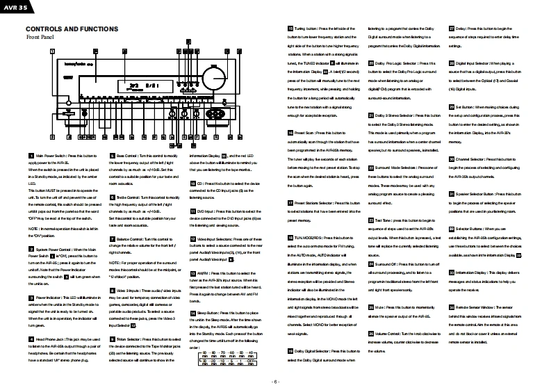 AVR 35The Harman KardonModel AVR 35Manual AAUDIO AND VIDEO DIGITAL RECEIVERTechnical Manualharman/kardon AVR 35混DKD3/21666哈8兰@O回The following marks found in the parts list of the manualidentify the models as follows.E AVR 35North America area model Black versionAVR 35 RDS Europe area model Black versionA3 AVR 35 SNG:Asia area model Black versionCONTENTSSPECIFICATIONS2GENERAL UNIT EXPLODED VIEWELECTROSTATICALLY SENSITIVE(ES)DEVICE4PC.BOARDS21LEAKAGE TESTELECTRICAL PARTS LISTCONTROLS AND FUNCTIONS6IC BLOCK DIAGRAMS41SERVICE PROCEDURE9CPU PIN CONFIGURATION54TEST EQUIPMENT REQUIRED9FLT PIN CONFIGURATION60ALIGNMENT PROCEDURES9SCHEMATIC DIAGRAMS EALIGNMENT AND TEST POINTSSCHEMATIC DIAGRAMS OB69CIRCUIT DESCRIPTION1SCHEMATIC DIAGRAMS A76BLOCK DIAGRAMPIN CONNECTION DIAGRAM78DISASSEMBLY PROCEDURES17WIRING DIAGRAMGENERAL UNIT PARTS LISTPACKING MATERIAL AND PARTS LIST80harman/kardonParts and Service Office250 Crossways Park Dr.,Woodbury,N.Y.117971112-AVR35 1200 Printed in KOREA-1-