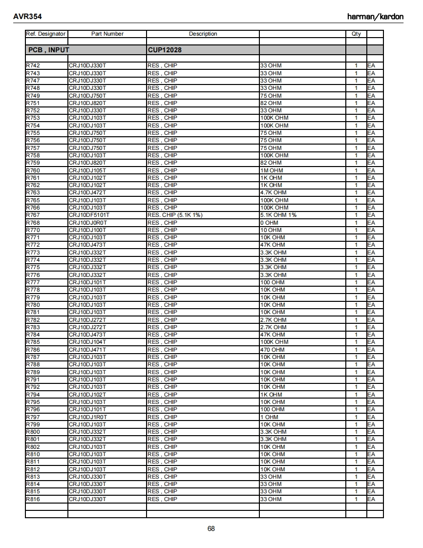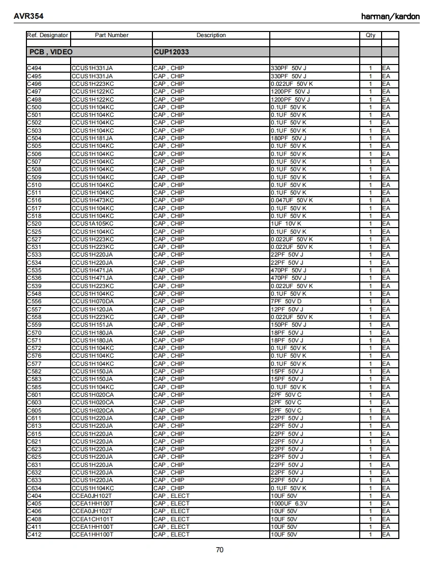 AVR354harman/kardonRef.DesignatorPart NumberDescriptionQtyPCB,INPUTCUP12028C731CCUS1H104KCCAP CHIP0.1UF 50V KEAC733CCUS1H104KCCAP.CHIP0.1UF 50VK1EAC734CCUS1H104KCCAP CHIP0.1UF 50V KAC738CCUS1A105KCCAP CHIP1UF 10VKC739CCUS1H103KCCAP.CHIP0.01UF50WKEAC741CCUS1H104KCCAP CHIP0.1UF 50V K1EAC742CCUS1H180JACAP CHIP18PF 50V JC743CCUS1H104KCCAP CHIP0.1UF 50V KEAC744CCUS1H180JACAP.CHIP18PF 50V JEAC745CCUS1H104KCCAP.CHIP0.1UF 50VKEAC746CCUS1H104KCCAP,CHIP0.1UF 50VKEAC747CCUS1H104KCCAP.CHIP0.1UF 50VKEAC748CCUS1H104KCCAP CHIP0.1UF 50V KEAC751CCUS1H104KCCAP.CHIP0.1UF 50VKEAC754CCUS1H104KCCAP.CHIP0.1UF 50VKEAC756CCUS1H104KCCAP.CHIP0.1UF 50VKEAC758CCUS1H104KCCAP CHIP0.1UF 50VKEAC759CCUS1H104KCCAP.CHIP0.1UF 50VK1EAC760CCUS1H104KCCAP.CHIP0.1UF 50VK1EAC761CCUS1H104KCCAP CHIP0.1UF 50VK1EAC762CCUS1H104KCCAP CHIP0.1UF 50VK1EAC763CCUS1H104KCCAP.CHIP0.1UF 50VKEAC765CCUS1H104KCCAP CHIP0.1UF 50VKEAC768CCUS1H104KCCAP CHIP0.1UF 50VKEAC769CCUS1H104KCCAP CHIP0.1UF 50VK1EAC770CCUS1H104KCCAP CHIP0.1UF 50VKEAC771CCUS1H104KCCAP.CHIP0.1UF 50VKEAC772CCUS1H104KCCAP CHIP0.1UF 50V K1EAC773CCUS1H104KCCAP CHIP0.1UF 50VK1EAC775CCUS1H104KCCAP.CHIP0.1UF 50VKEAC780CCUS1H102KCCAP.CHIP1000PF50WK1EAC781CCUS1H223KCCAP.CHIP0.022UF50VK1EAC782CCUS1H103KCCAP CHIP0.01UF50WKEAC783CCUS1H103KCCAP CHIP0.01UF50WK1EAC784CCUS1H103KCCAP.CHIP0.01UF50WK1EAC787CCUS1H103KCCAP.CHIP0.01UF 50VK1EAC789CCUS1H103KCCAP CHIP0.01UF50WKC790CCUS1H103KCCAP CHIP0.01UF50WKEAC791CCUS1H104KCCAP CHIP0.1UF 50V K1EAC793CCUS1H101JACAP,CHIP100PF 50V J1EAC794CCUS1H181JACAP,CHIP180PF 50V JC795CCUS1H181JACAP.CHIP180PF 50V JEAC796CCUS1H104KCCAP CHIP0.1UF 50VK1EAC797CCUS1H104KCCAP.CHIP0.1UF 50VKEAC798CCUS1H104KCCAP.CHIP0.1UF 50VK1EAC820CCUS1H104KCCAP.CHIP0.1UF 50VKEAC261CCEA1EH470TCAP,ELECT47UF 25VEAC262CCEA1EH470TCAP.ELECT47UF 25VAC263CCEA1日H470TCAP.ELECT47UF 25V1EAC264CCEA1EH470TCAP.ELECT47UF 25V1EAC265CCEA1EH470TCAP,ELECT47UF 25V1EAC266CCEA1EH470TCAP,ELECT47UF 25VEAC267CCEA1EH470TCAP.ELECT47UF 25VEAC268CCEA1EH470TCAP.ELECT47UF 25VEAC270CCEA1HH100TCAP.ELECT10UF 50VEAC271CCEA1HH100TCAP.ELECT10UF 50V1EAC272CCEA1HH100TCAP ELECT10UF 50VEAC273CCEA1HH100TCAP,ELECT10UF 50VEAC275CCEA1HH100TCAP,ELECT10UF 50V1EAC276CCEA1HH100TCAP.ELECT10UF 50V1C281CCEA1HH100TCAP ELECT10UF 50V1EA61