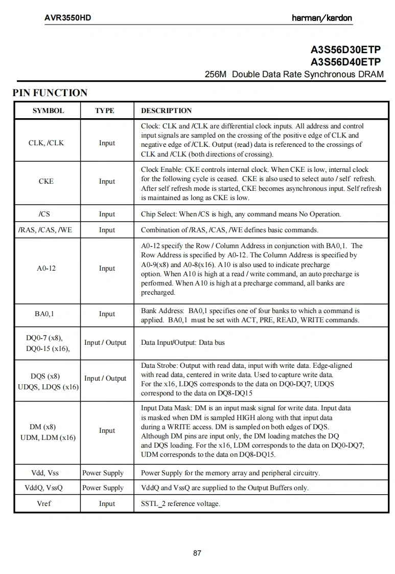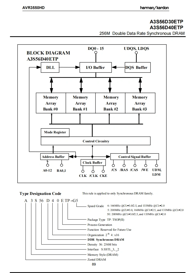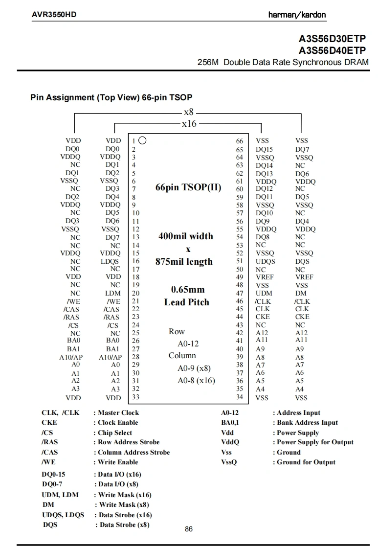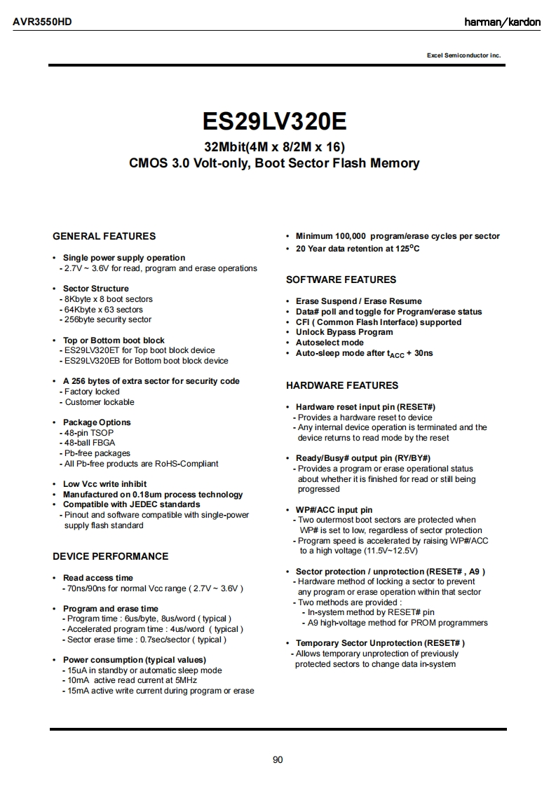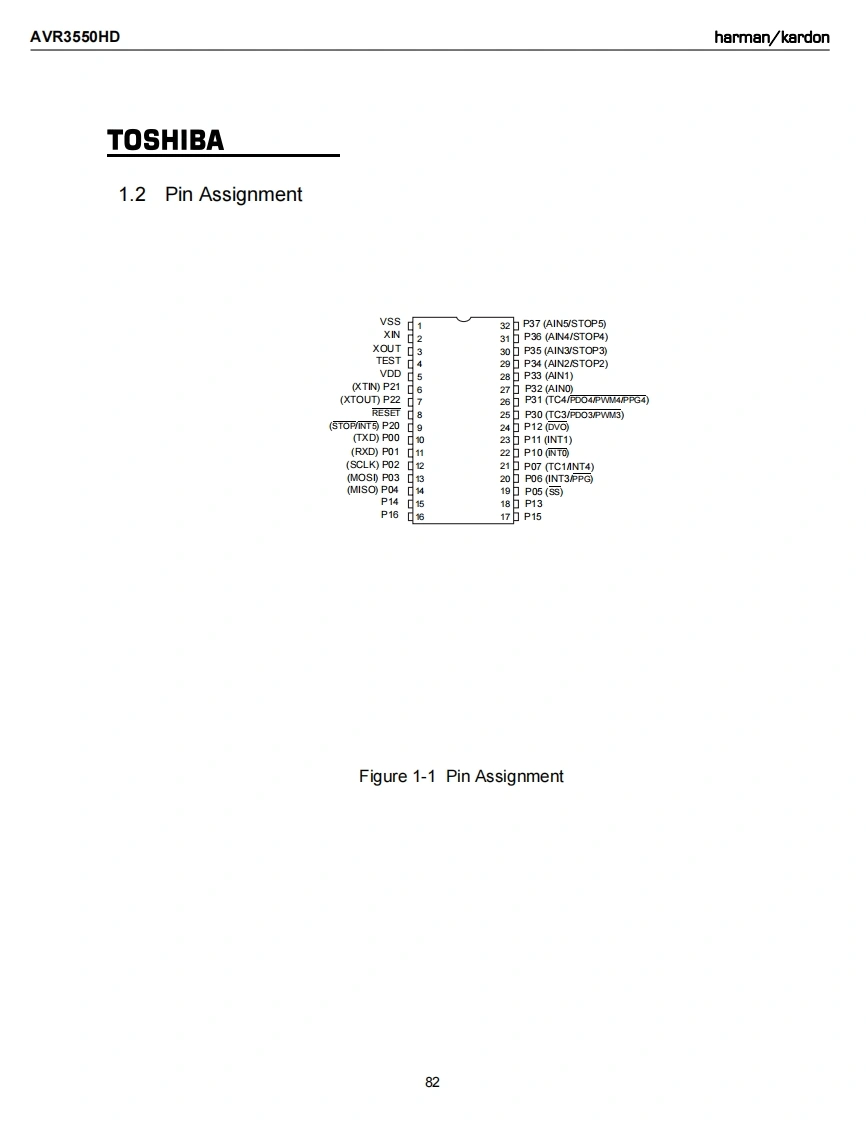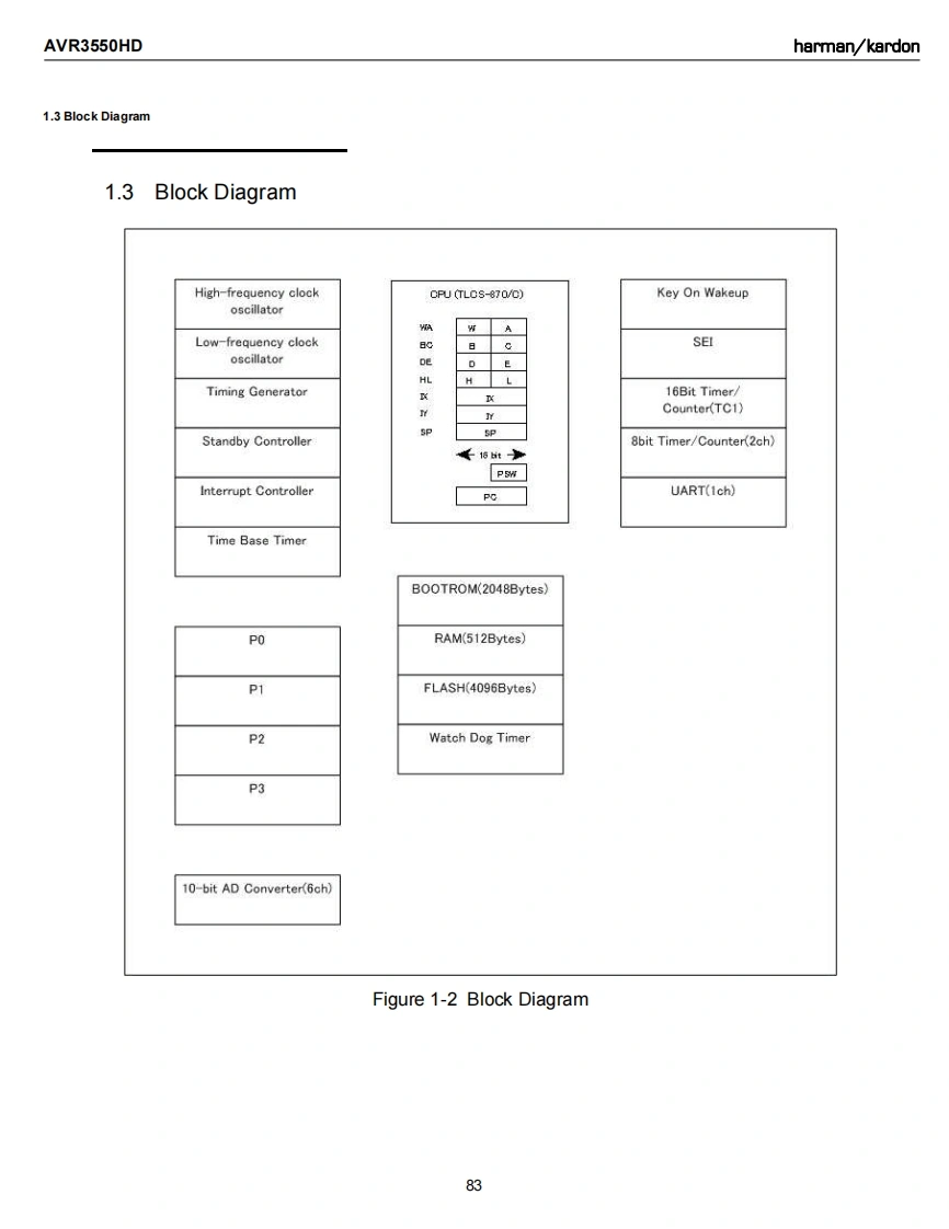 AVR3550HDharman/kardon1.1 FeaturesTMP86F409NG9.8bit Serial Expansion Interface(SED):1 channel(MSB/LSB selectable and max.4Mbps at 16MHz)10.10-bit successive approximation type AD converter·Analog input:6ch11.Key-on wakeup:4 channels12.Clock operationSingle clock modeDual clock mode13.Low power consumption operationSTOP mode:Oscillation stops.(Battery/Capacitor back-up.)SLOWI mode:Low power consumption operation using low-frequency clock.(High-frequency clockstop.)SLOW2 mode:Low power consumption operation using low-frequency clock.(High-frequency clockoscillate.)IDLEO mode:CPU stops,and only the Time-Based-Timer(TBT)on peripherals operate using high fre-quency clock.Release by falling edge of the source clock which is set by TBTCR.IDLEl mode:CPU stops and peripherals operate using high frequency clock.Release by interru-puts(CPU restarts).IDLE2 mode:CPU stops and peripherals operate using high and low frequency clock.Release by inter-ruputs.(CPU restarts).SLEEPO mode:CPU stops,and only the Time-Based-Timer(TBT)on peripherals operate using low fre-quency clock.Release by falling edge of the source clock which is set by TBTCR.SLEEPI mode:CPU stops,and peripherals operate using low frequency clock.Release by interru-put.(CPUrestarts).SLEEP2 mode:CPU stops and peripherals operate using high and low frequency clock.Release byinterruput.14.Wide operation voltage:4.5Vto5.5V116MHz/32.768Hz2.7 V to 5.5 V at 8 MHz/32.768 kHz81