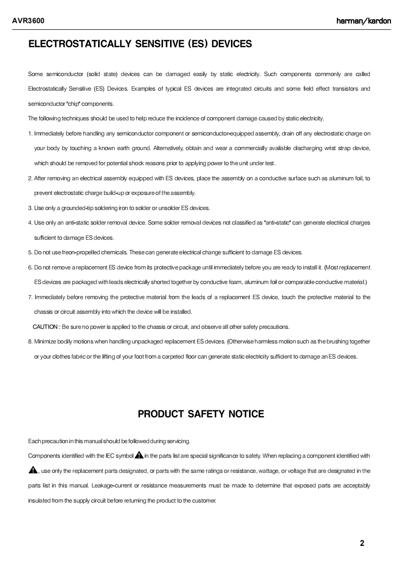 harman/kardonAVR 36007 X 80W 7.1 CHANNEL AV RECEIVERSERVICE MANUALAWR厕BLU-RAY DISCDOLBY TRUEHDharman/kardonCONTENTSESD WARNING.REMOTE PROCESSOR RESETS..........27LEAKAGE TESTING.3DISASSEMBLY.28BASIC SPECIFICATIONS..................4UNIT EXPLODED VIEW................29PACKAGING.....5EXPLODED VIEW PARTS LIST...............30FRONT PANEL CONTROLS..............6AMP BIAS ADJUSTMENT...................31REAR PANEL CONNECTIONS...............8BLOCK DIAGRAM................32REMOTE CONTROL FUNCTIONS..........11PCB DRAWINGS.....................33CONNECTIONS/INSTALLATION.............14ELECTRICAL PARTS LIST...........40INITIAL SETUP..17SEMICONDUCTOR PINOUTS...............86OPERATION..............21SCHEMATICS............216TROUBLESHOOTING GUIDE.................27WRING DIAGRAM...............229harman/kardon,Inc.8500 Balboa Blvd.Released 2009Northridge,CA.91329Rev02/2010Discontinued XXXX