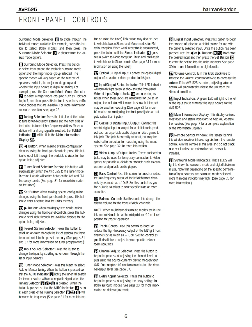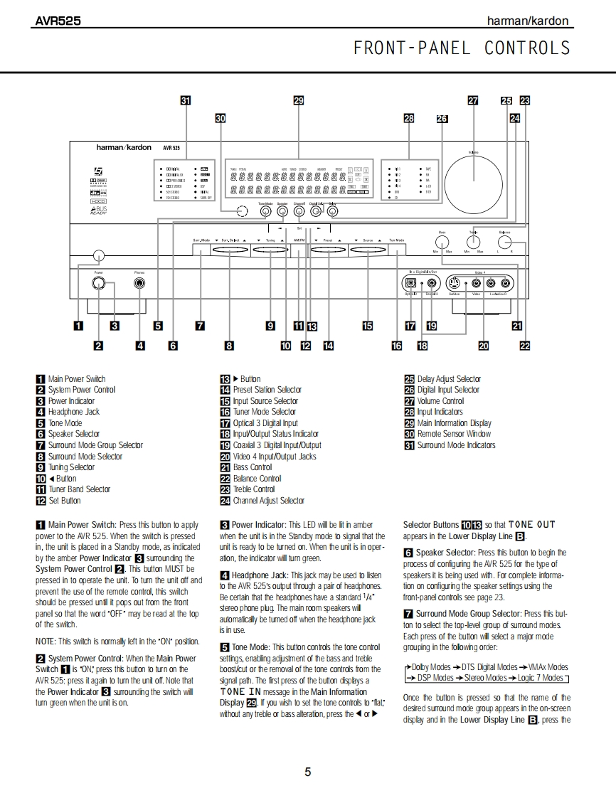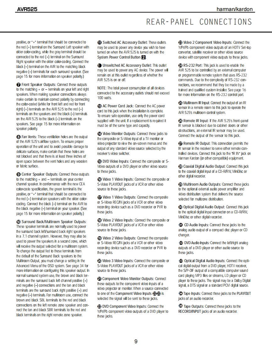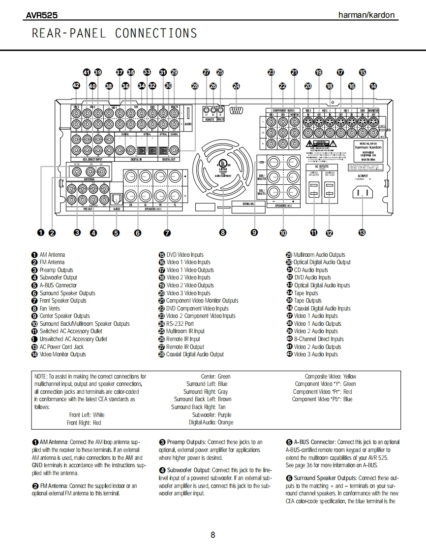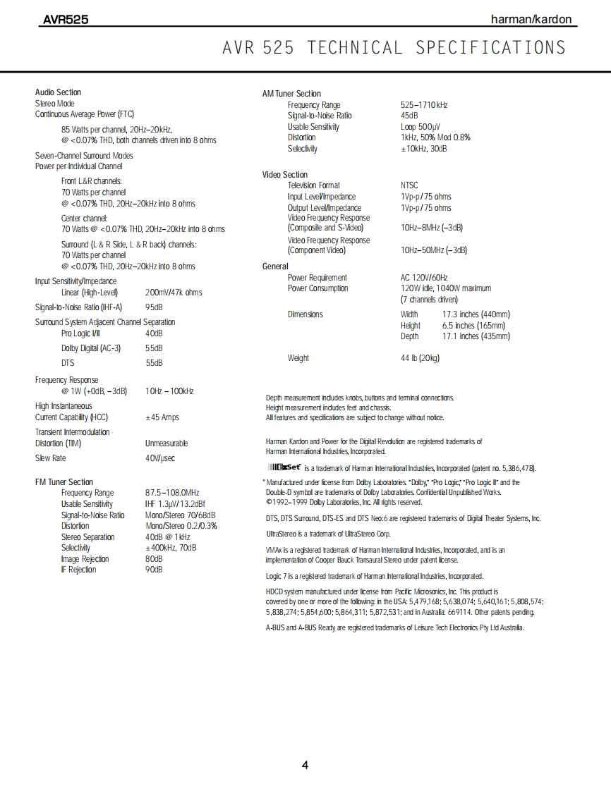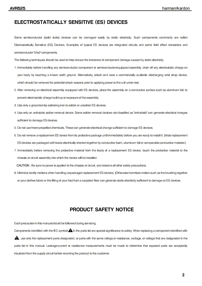 harman/kardonAVR525AV DOLBY DIGITAL RECEIVERSERVICE MANUALharman/kardon AVR525身。国位HYH,'CC月H{m8回DOLBY BIGITRL▣▣CONTENTSESD WARNING.........2AMPLIFIER BIAS ADJUSTMENT............19LEAKAGE TESTING..3SERVICE BULLETIN H/K2003-05.........24BASIC SPECIFICATIONS..................4TECH TIP HKTT2003-01......................25FRONT PANEL CONTROLS.................5EXPLODED VIEW......26FRONT PANEL DISPLAY.....................7EXPLODED VIEW PARTS LIST.............27REAR PANEL CONNECTIONS...............8ELECTRICAL PARTS LIST..........9REMOTE CONTROL FUNCTIONS............11PCB DRAWINGS..85INSTALLATION AND CONNECTIONS.......14SCHEMATICS..9TROUBLESHOOTING GUIDE................17WIRING DIAGRAM.........................116PROCESSOR RESET........................17PACKAGE...............117BLOCK DIAGRAM......................18harman/kardon,Inc.250 Crossways Park Dr.Woodbury,New York 11797Rev08/2004
