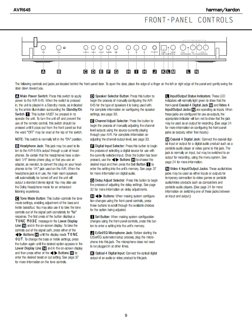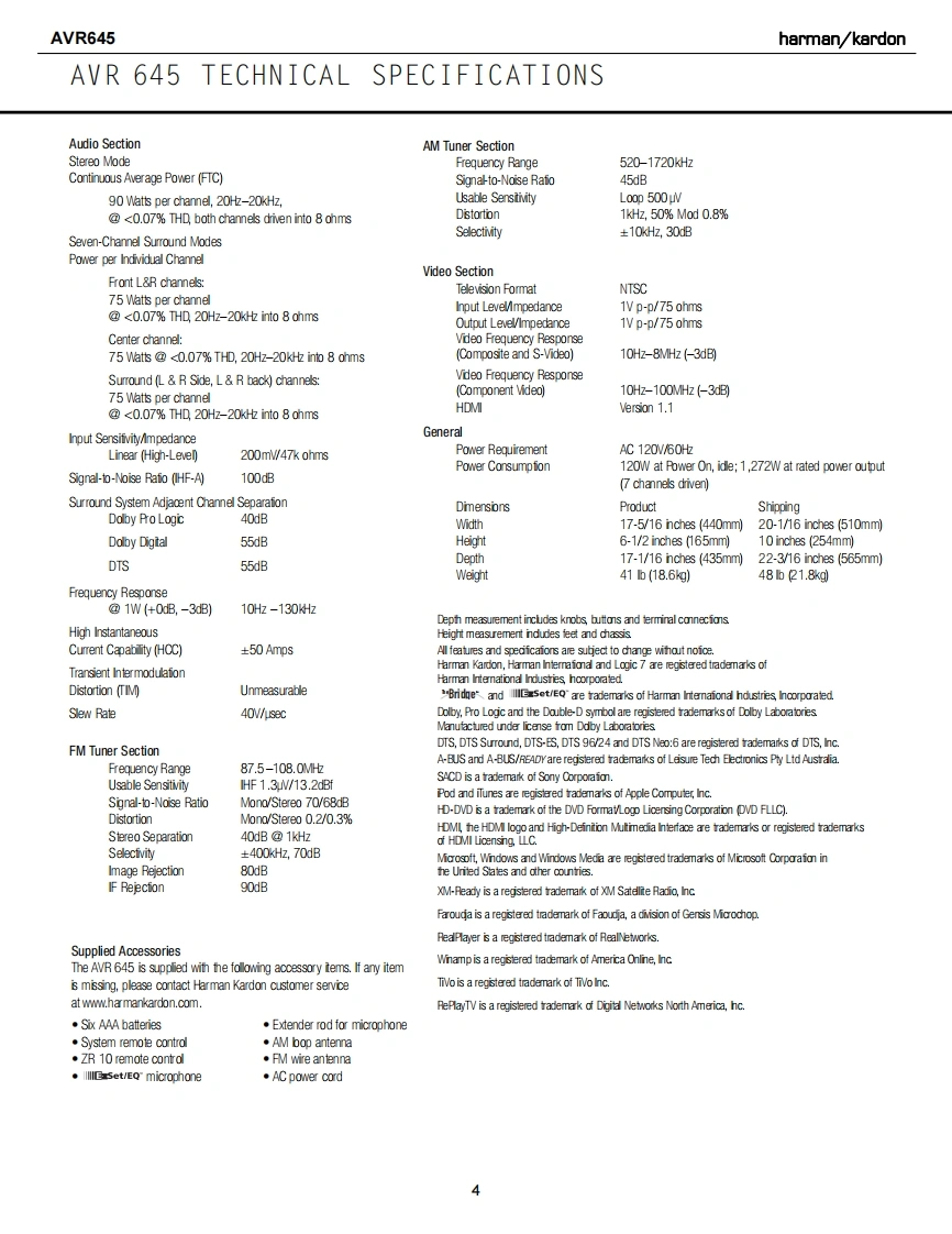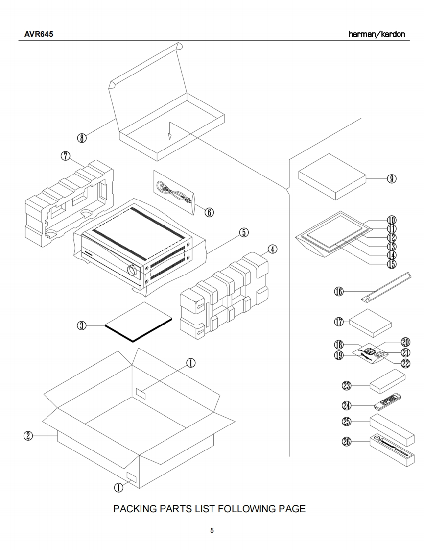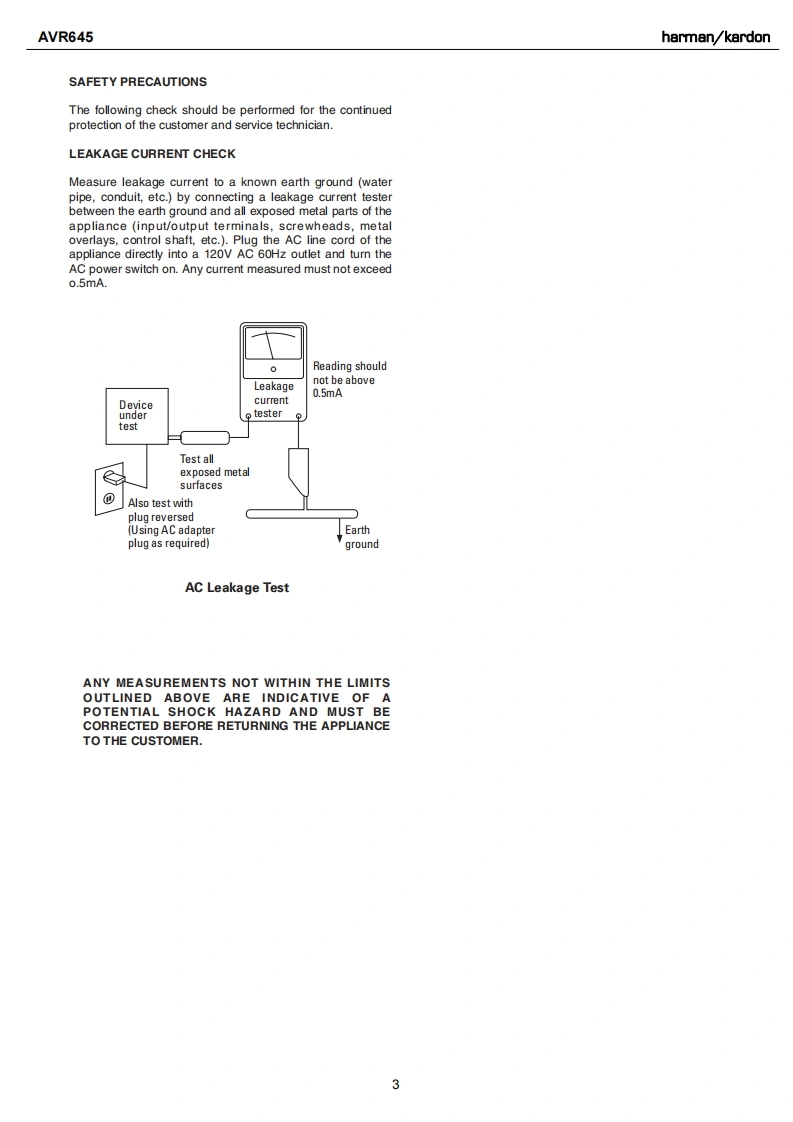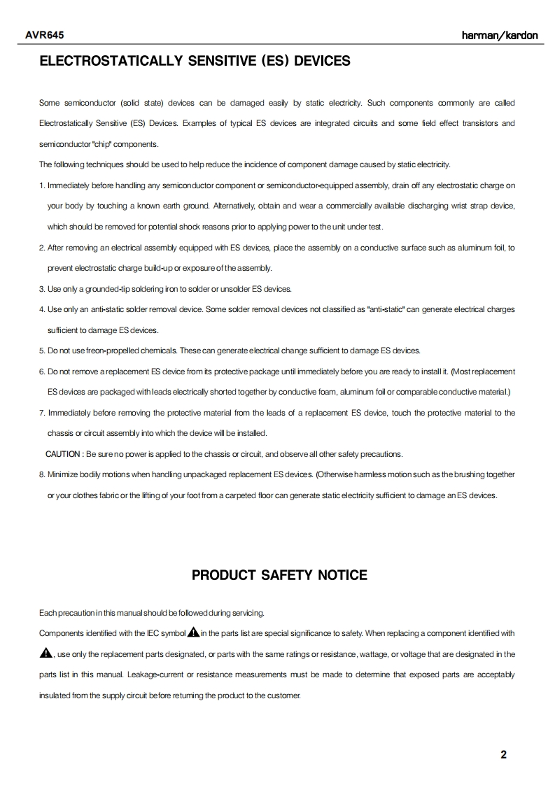 harman/kardonAVR645AM DOLBY DIGITAL RECEIVERSERVICE MANUAL:3A帽图·国5饭7HDI1OPT1P四LOGIC 7 7CH CIharman/kardonCONTENTSESD WARNING......2PROCESSOR RESET.......................8LEAKAGE TESTING.......3UNIT EXPLODED VIEW....................9BASIC SPECIFICATIONS.4EXPLODED VIEW PARTS LIST..............30PACKAGE..........5IDLE CURRENT ADJUST....................33PACKAGE PARTS LIST.....................6BLOCK DIAGRAM(S).........36FRONT PANEL CONTROLS.....7CIRCUIT DESCRIPTION.....37REAR PANEL CONNECTIONS..10SEMICONDUCTOR PINOUTS...........38REMOTE CONTROL FUNCTIONS...........13PCB DRAWINGS............................88INSTALLATION/CONNECTIONS............17ELECTRICAL PARTS LIST...................100OPERATION............20SCHEMATICS.124TROUBLESHOOTINGGUIDE.................28WIRING DIAGRAM...139hamman/kardon,Inc.250 Crossways Park Dr.Woodbury,New York 11797Rev0-11/2006
