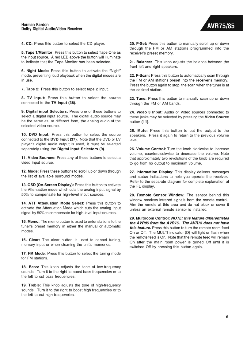 哈曼卡顿Harman-Kardon-AVR-75-维修手册找手册网16天前发布关注私信11.68MB203页024哈曼卡顿Harman-Kardon-AVR-75-维修手册此内容为付费资源,请付费后查看¥19¥21黄金会员免费钻石会员免费登录购买付费资源 第1页 / 共203页 第2页 / 共203页 第3页 / 共203页 第4页 / 共203页 第5页 / 共203页 第6页 / 共203页 第7页 / 共203页 第8页 / 共203页 第9页 / 共203页 第10页 / 共203页 试读已结束,还剩193页,您可下载完整版后进行离线阅读 THE END哈曼卡顿/飞利浦 文本预览 harman/kardonAVR75/85Dolby Digital Audio/Video ReceiverTECHNICAL MANUALharan/ludon tsFH10890.600二”FH890000OHarman Consumer Group250 Crossways Park DriveWoodbury,N.Y.117971-800422-8026 in the USAH A Harman International CompanyRev A 12/99 查看更多 收起部分 喜欢就支持一下吧收藏