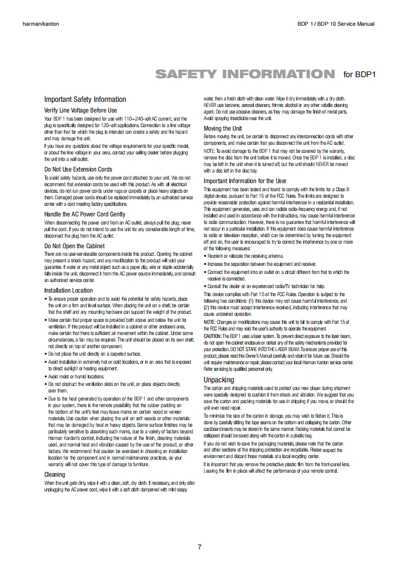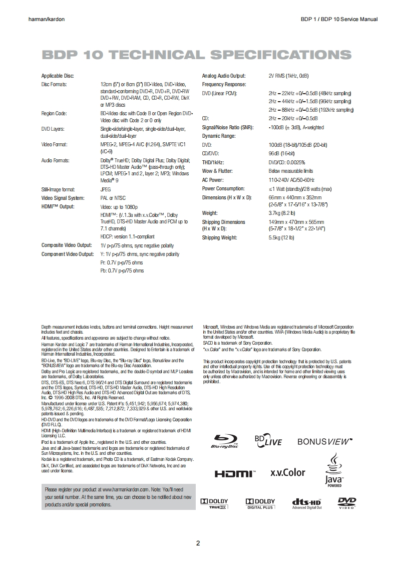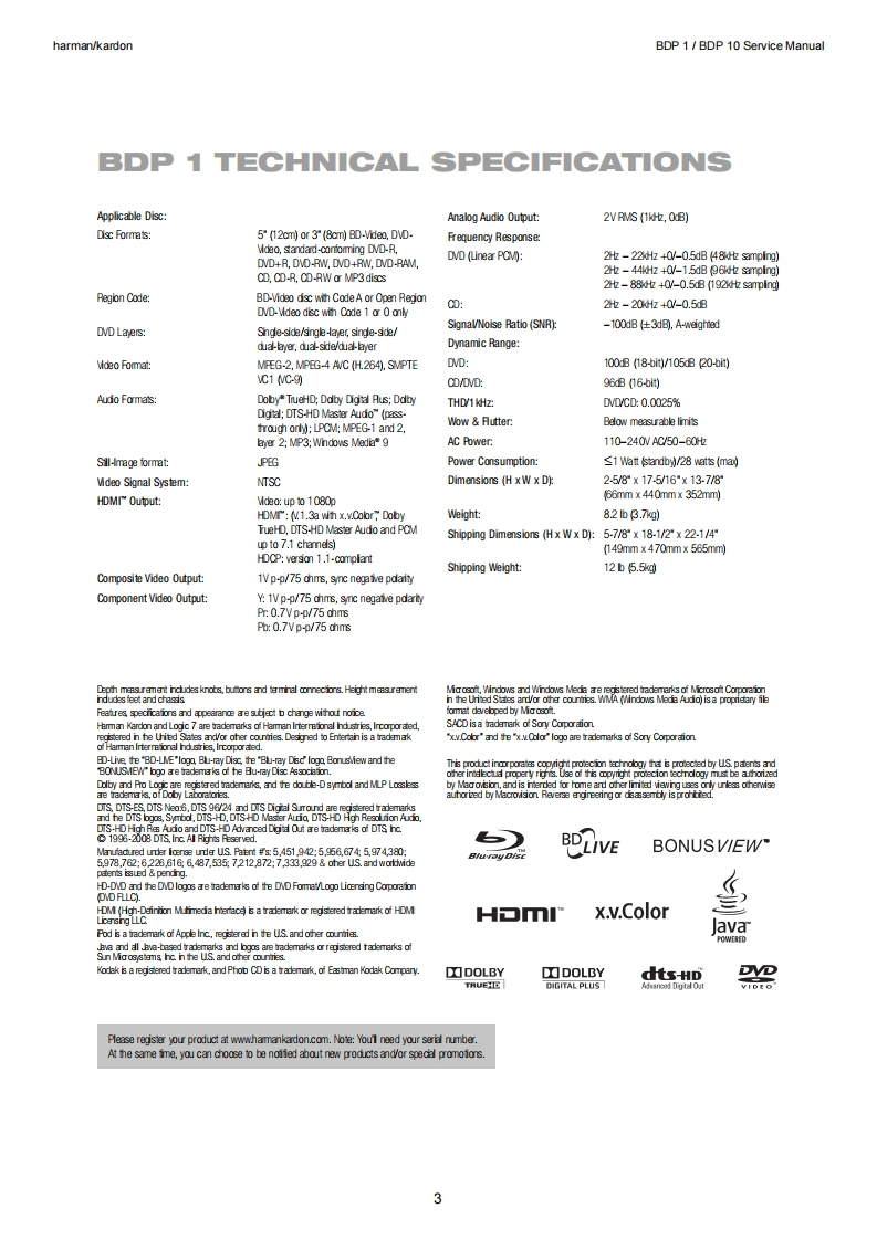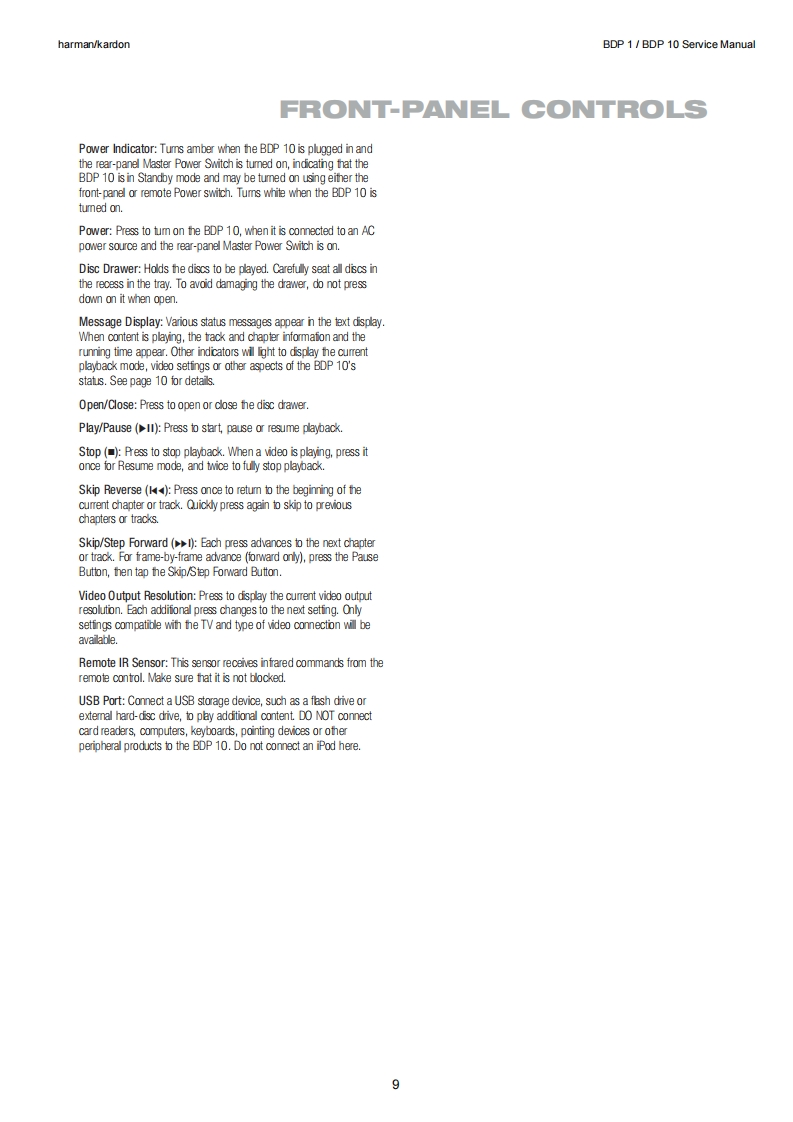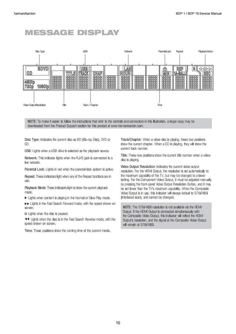 harman/kardonBDP 1/BDP 10 Service Manualharman/kardonService ManualBDP1/120BDP10/230Blu-ray players0回4158:87harman/kardonCONTENTSBDP 10 SPECIFICATIONS.2SOFTWARE UPGRADE INSTRUCTIONS....21BDP 1 SPECIFICATIONS.3PACKAGING.....22BDP 10 SAFETY INFORMATION....................4EXPLODED VIEW.….23BDP1 SAFETY INFORMATION...6BDP 10 PARTS LIST.............24FRONT PANEL CONTROLS.......................8BDP 1 PARTS LIST......25MESSAGE DISPLAY.....444.444.10TROUBLE SHOOTING CHARTS...............26BDP 10 REAR-PANEL CONNECTIONS............11PCBDRAWINGS...............................32BDP 1 REAR-PANEL CONNECTIONS..13BLOCK DIAGRAM.........38REMOTE CONTROL FUNCTIONS..15SCHEMATIC DIAGRAMS..39BDP 10 INSTALLATION.................17TECH TIP HKTT2010-01..54BDp1 INSTALLATION.19harman/kardon,Inc.8500 Balboa Blvd.Released 2010Northridge,CA.91329Rev08/2010Discontinued XXXX