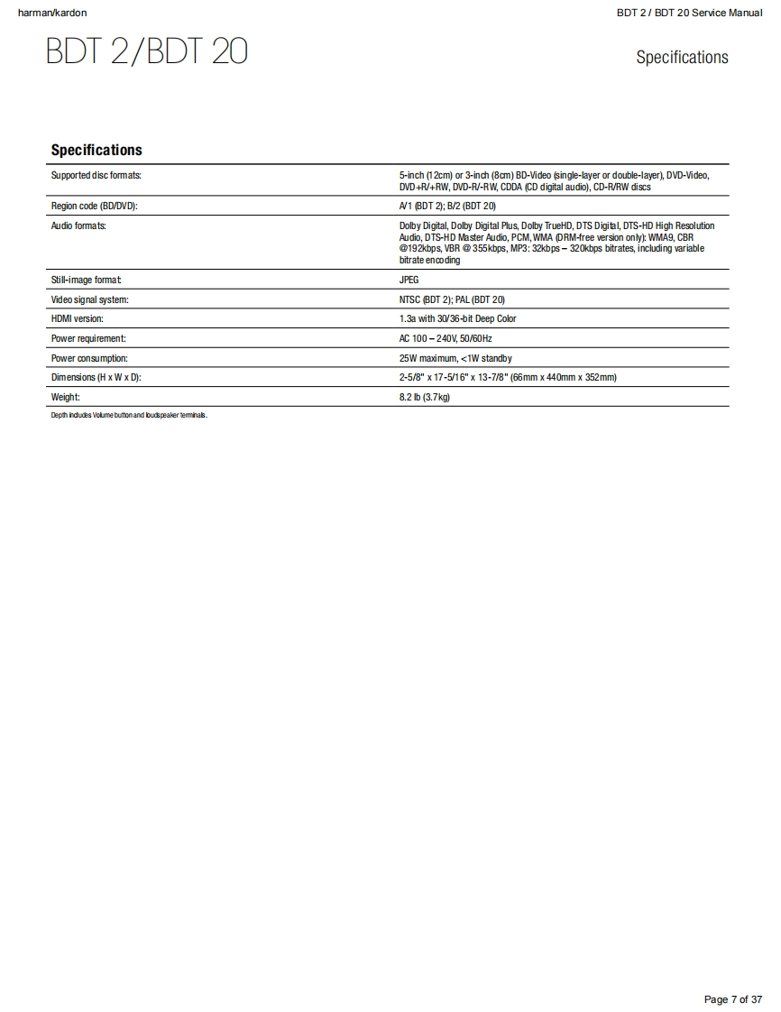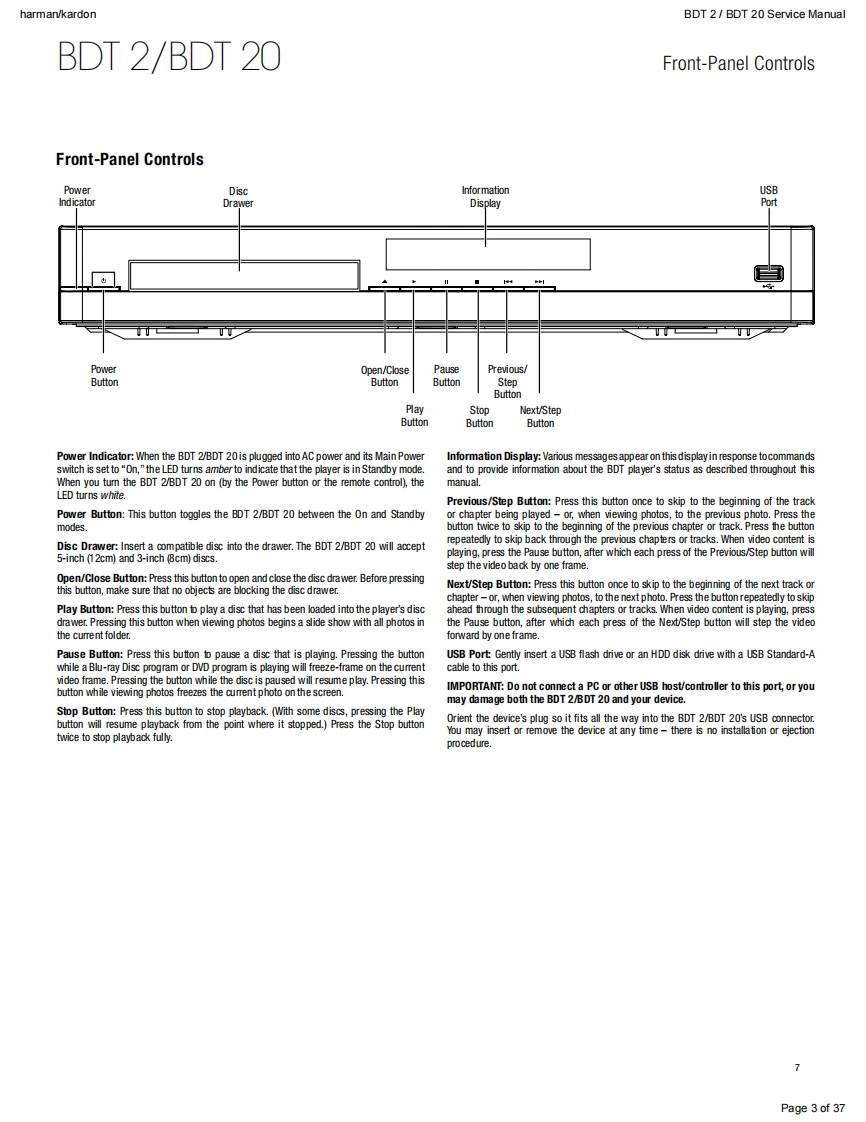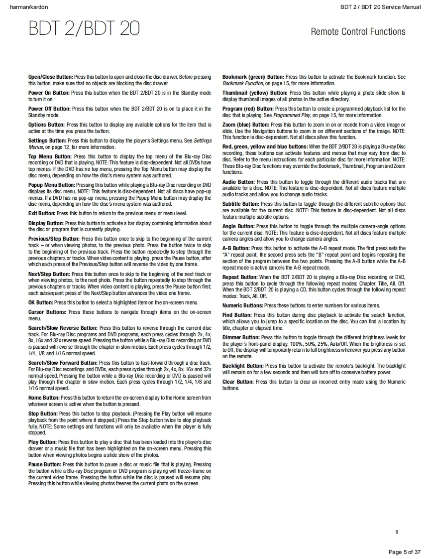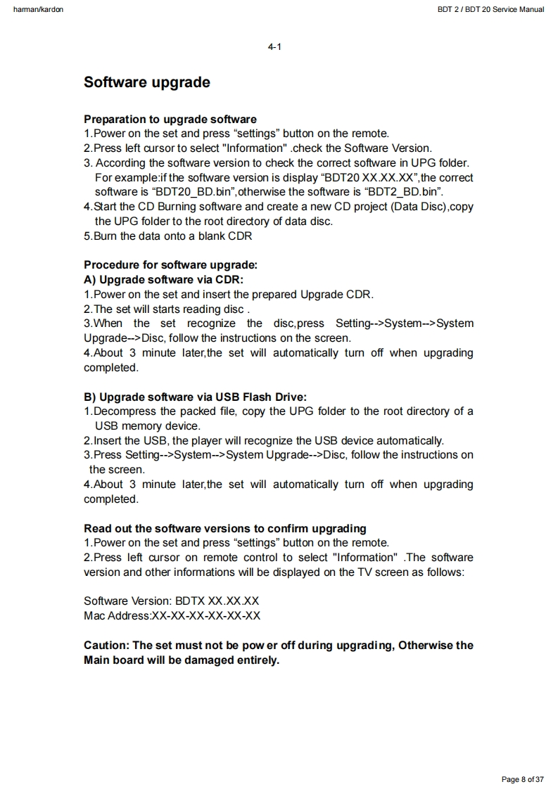 harman/kardonService ManualBDP20/230BDP2/120Blu-ray playerENT段YRINMENTharman/kardonCONTENTSFEATURES2TROUBLESHOOTING CHARTS9FRONT PANEL CONTROLSEXPLODED VIEW14REAR-PANEL CONNECTIONSgBDT 2 PARTS LIST15REMOTE CONTROL FUNCTIONS5BDT 20 PARTS LIST6TROUBLESHOOTING6PCB DRAWINGS17SPECIFICATIONS7WIRING DIAGRAM2SOFTWARE UPGRADE INSTRUCTIONS 8SCHEMATIC DIAGRAMS23-37IMPORTANT INFORMATION ABOUT PAIRING A NEW LOADER WITH THE MAIN BOARDON PAGE 38-39Released EU2011Harman Consumer Group,Inc.Rev1,03/20128500 Balboa BoulevardNorthridge,California 91329