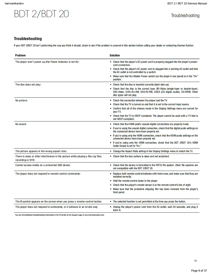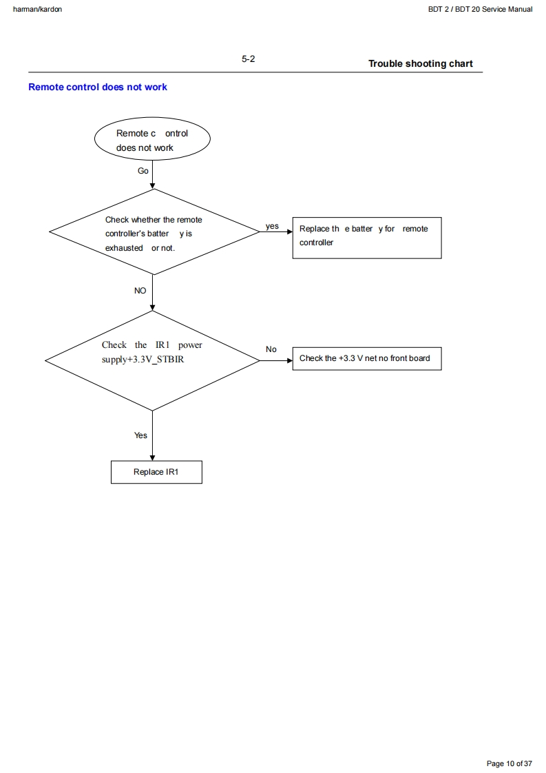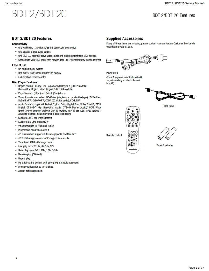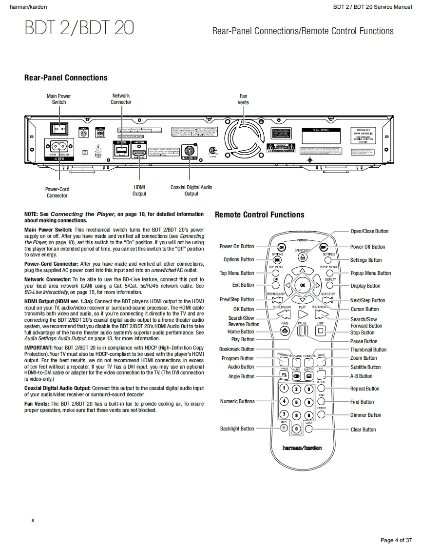 harman/kardonService ManualBDP20/230BDP2/120Blu-ray playerENT段YRINMENTharman/kardonCONTENTSFEATURES2TROUBLESHOOTING CHARTS9FRONT PANEL CONTROLSEXPLODED VIEW14REAR-PANEL CONNECTIONSgBDT 2 PARTS LIST15REMOTE CONTROL FUNCTIONS5BDT 20 PARTS LIST6TROUBLESHOOTING6PCB DRAWINGS17SPECIFICATIONS7WIRING DIAGRAM2SOFTWARE UPGRADE INSTRUCTIONS 8SCHEMATIC DIAGRAMS23-37IMPORTANT INFORMATION ABOUT PAIRING A NEW LOADER WITH THE MAIN BOARDON PAGE 38-39Released EU2011Harman Consumer Group,Inc.Rev1,03/20128500 Balboa BoulevardNorthridge,California 91329