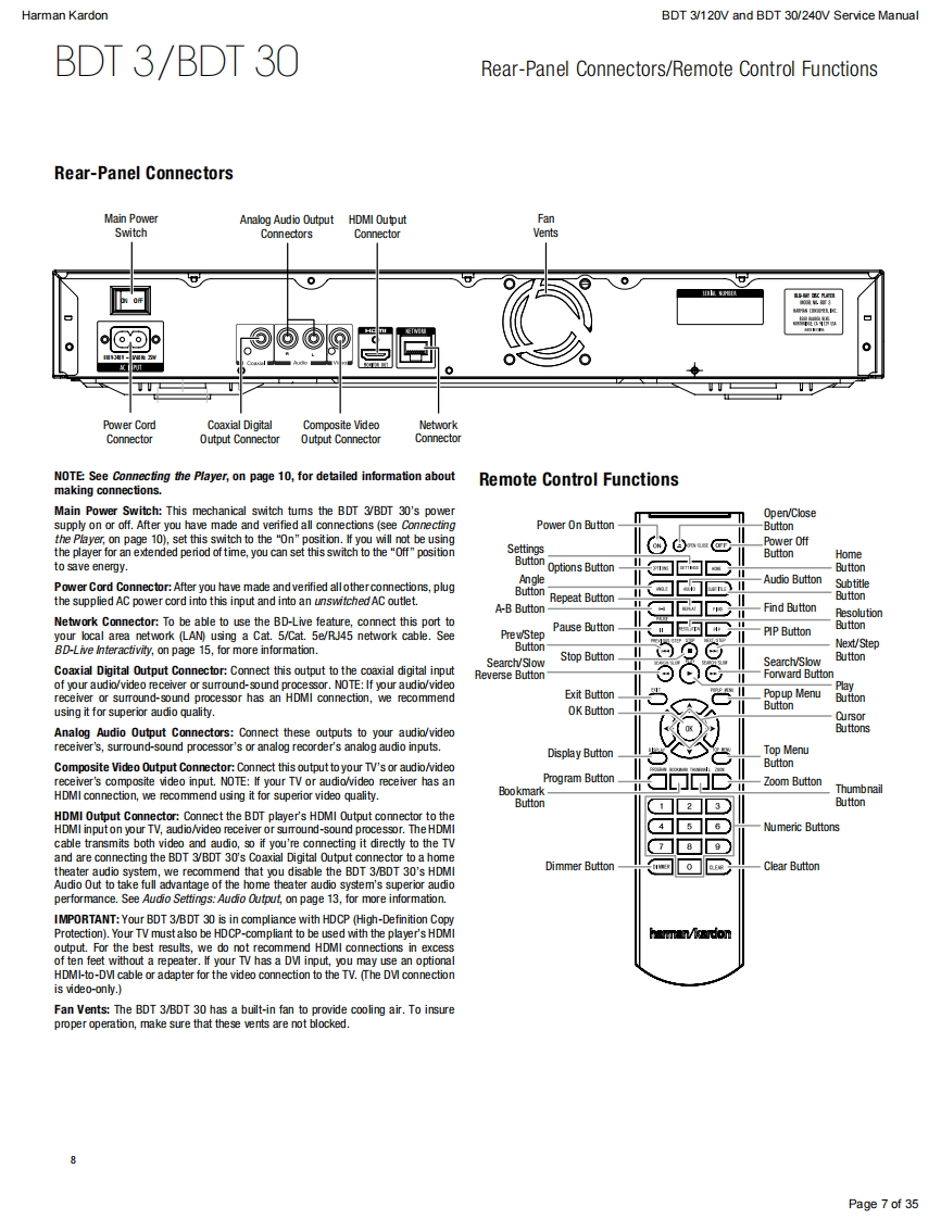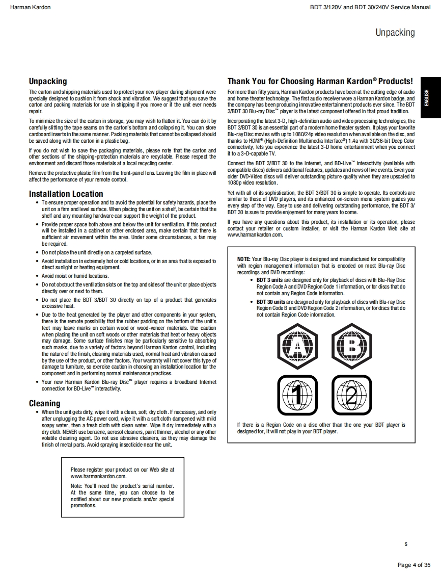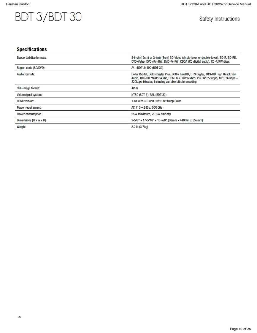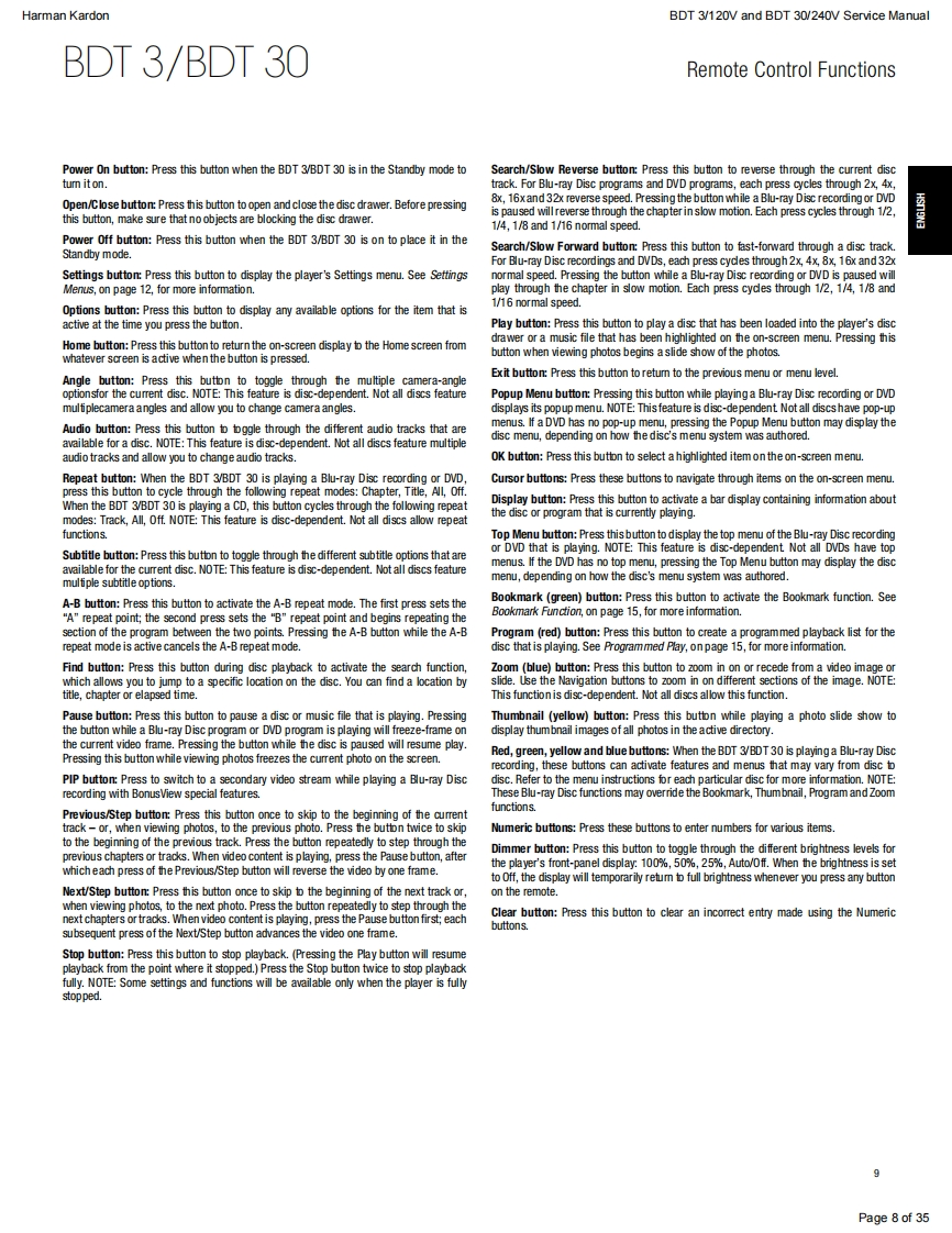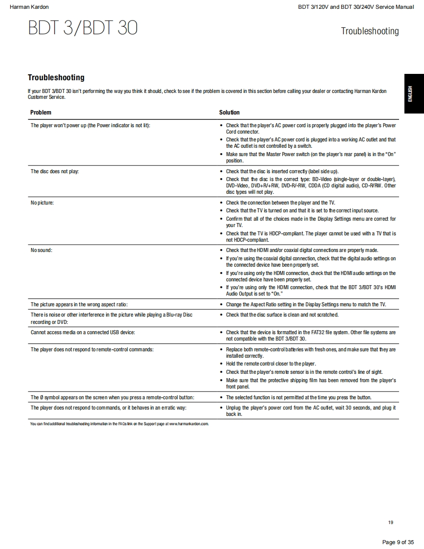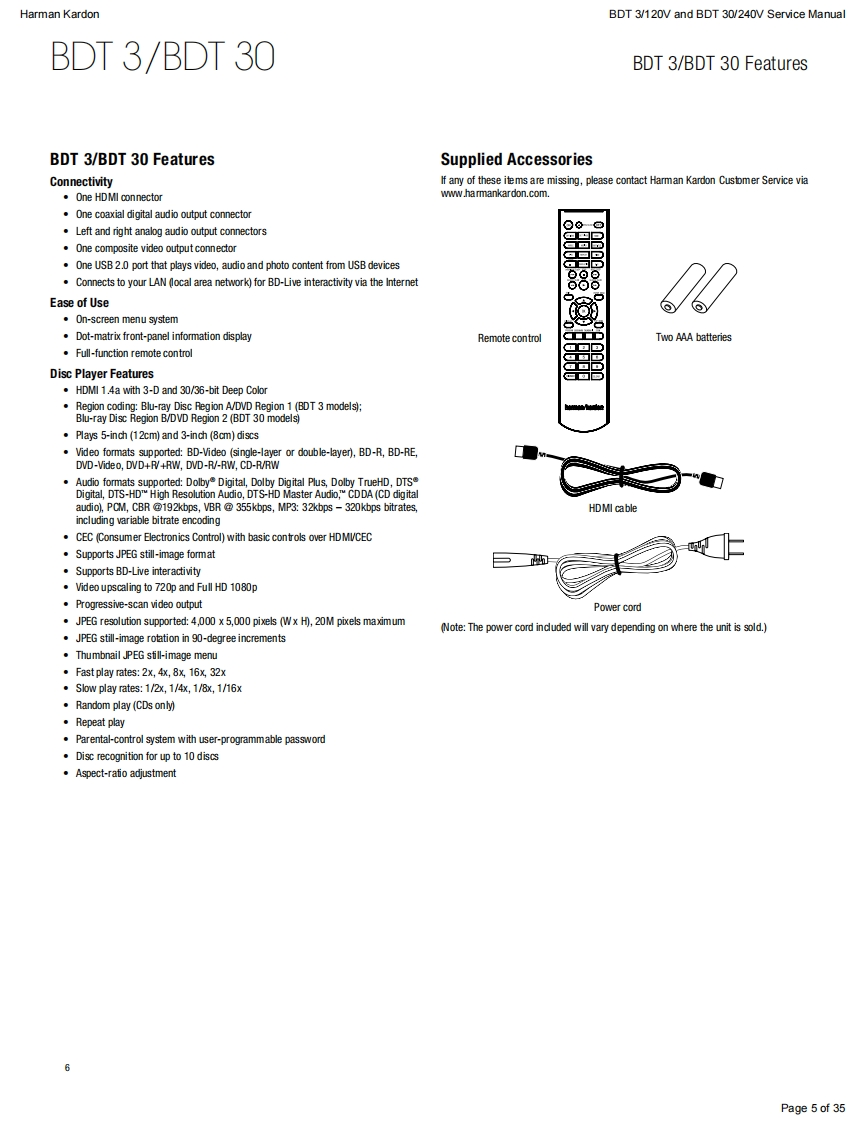 harman/kardonService ManualBDT30/230BDT3/120Blu-ray playerENTERYATRKEN灯CONTENTSESD WARNING23SPECIFICATIONS10OWNER'S MANUAL FRONT PAGEEXPLODED VIEW11REGION CODESBDT 3 PARTS LIST1FEATURES5BDT 30 PARTS LIST13FRONT PANEL CONTROLS6SOFTWARE UPGRADE INSTRUCTIONS14REAR-PANEL CONNECTIONS7TROUBLESHOOTING CHARTS15REMOTE CONTROL FUNCTIONS>PCB DRAWINGS9TROUBLESHOOTING9WIRING DIAGRAM23SCHEMATIC DIAGRAMS24-35Released EU2011Harman Consumer Group,Inc.Rev0,10/20118500 Balboa BoulevardNorthridge,California 91329