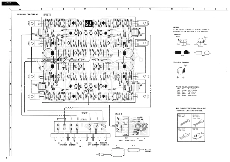 The Harman KardonModel CA215Manual 100AHIGH FIDELITY CAR AMPLIFIERTechnical ManualCA2156SPECIFICATIONSPower Output,RMS12 watts per channel intoPower SupplyDC +13.8V (11-16V usable),40hms,20-20.000Hznegative groundHCC (High instantaneous:14ATypical Input CurrentCurrent Capability)RequirementsTHDNo more than 0.2%At ldle:0.3A(40hms】Full Power Music Signal 1.2A (4 Ohms/ch.)Negative Feedback:25dBFull Power Sine Wave:3.6A(40hms/ch.Power Bandwidth:10Hzto100.000HzDimensions(WxH×D):8-1/4”×1-11/16×6-3/16Frequency Response:10Hzto100.000Hz(208×42×156mm)+0,-3dBWeight:2Ib5.30z.(1kgSignal-to-Noise Ratio:84dBInput Sensitivity/Impedance:0.1V/0.5V (Switchable)/22k OhmsSpecifications and components subject to change without notice.Overall performance will be maintained or improved.harman/kardons Park West.Woodbury,N.Y.117971112-H152100A4P0886011850 Printedn」