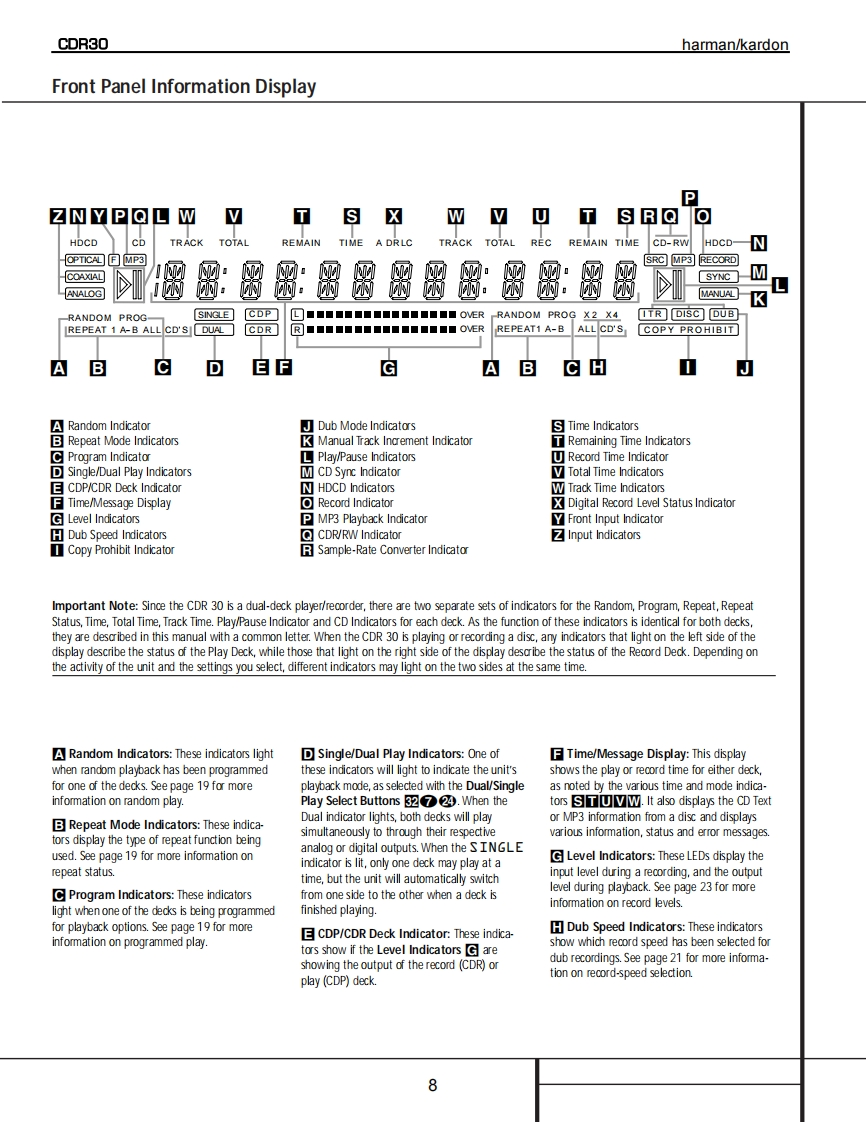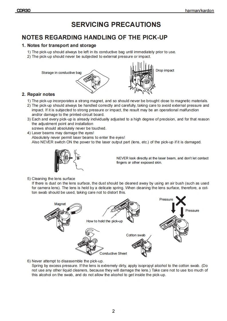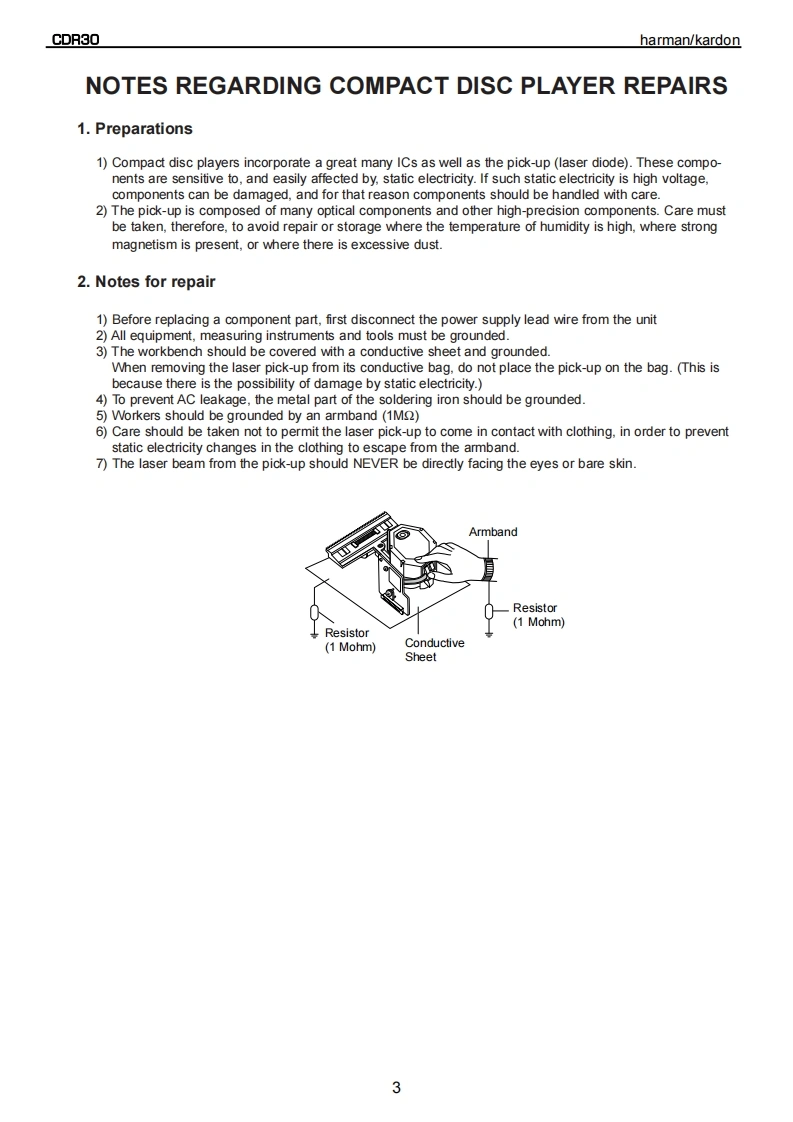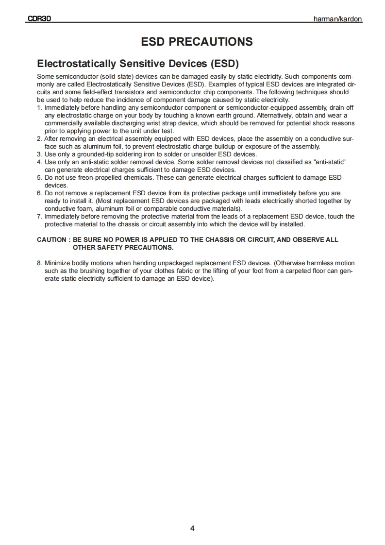 harman/kardonModel CDR30Dual Tray CD/CD-R/CD-RW Recorder/PlayerSERVICE MANUALharman/kardon CR30-下0e8ef900!-⊙©©CONTENTSSERVICING PRECAUTIONS................2DETAILED TROUBLESHOOTING GUIDE .......17ESD PRECAUTIONS......................4BLOCK DIAGRAMS.......................34SPECIFICATIONS........................5EXPLODED VIEWS.......................37FRONT PANEL CONTROLS....................6MECHANICAL PARTS LIST.....................40FRONT PANEL DISPLAY .................8ELECTRICAL PARTS LIST..................42REAR PANEL CONNECTIONS.…10PCB DRAWINGS.......................61REMOTE CONTROL FUNCTIONS............11SCHEMATIC DIAGRAMS................71INSTALLATION/CONNECTIONS..............13WIRING DIAGRAM..........................88BASIC TROUBLESHOOTING GUIDE............15PACKAGE.....90SPECIAL NOTES ON CDR30 RECORDING....16harman/kardon,Inc.250 Crossways Park Dr.Woodbury,New York 11797Rev02/2004
