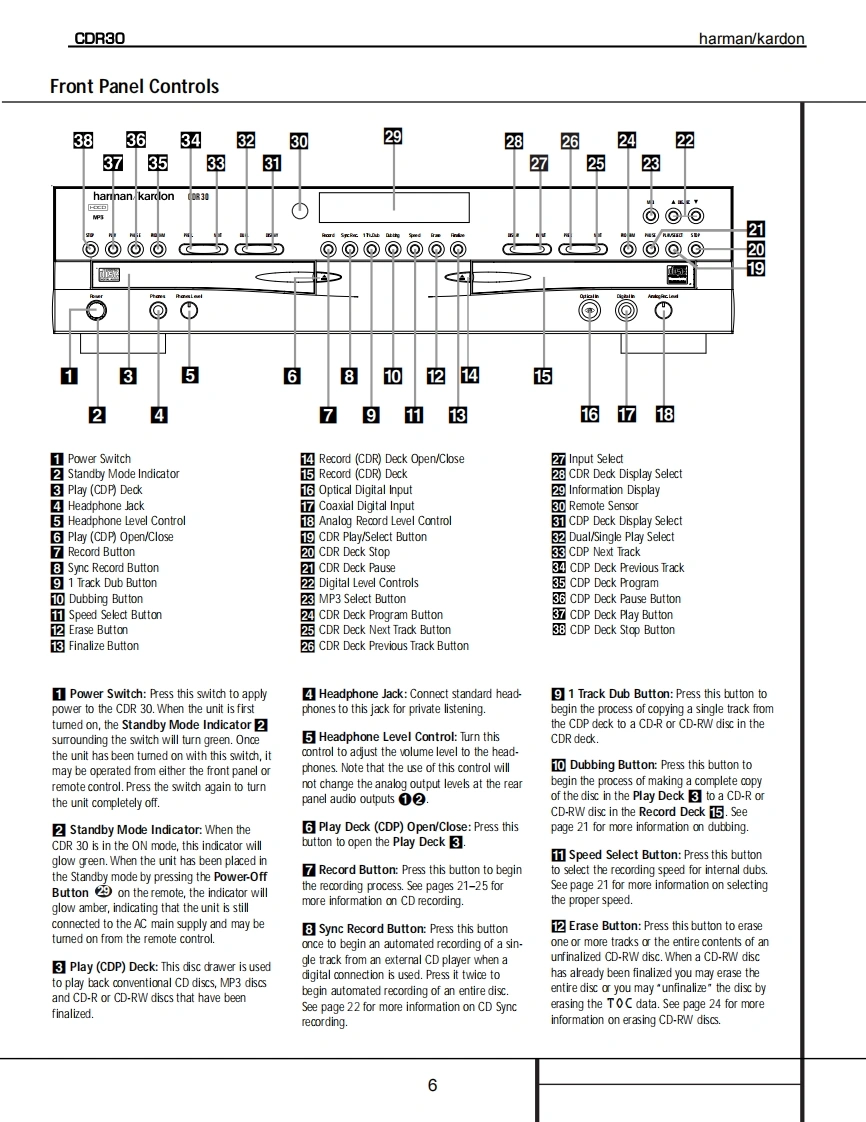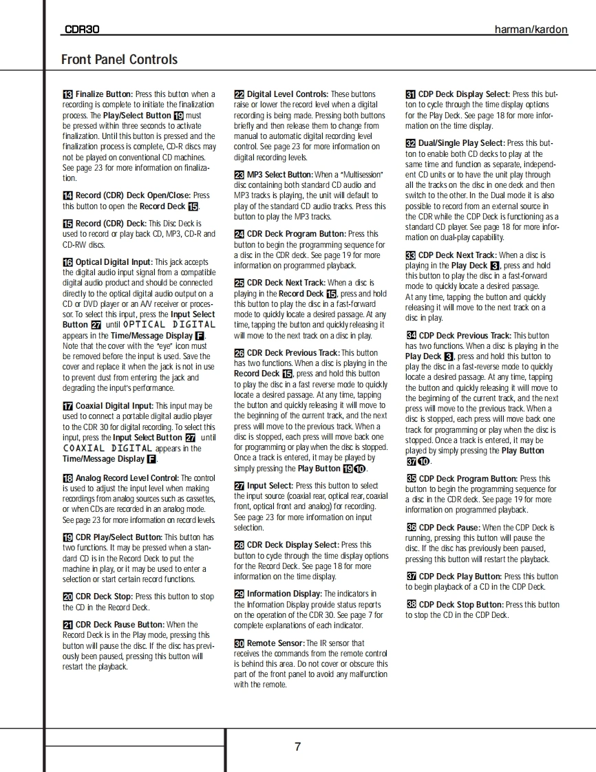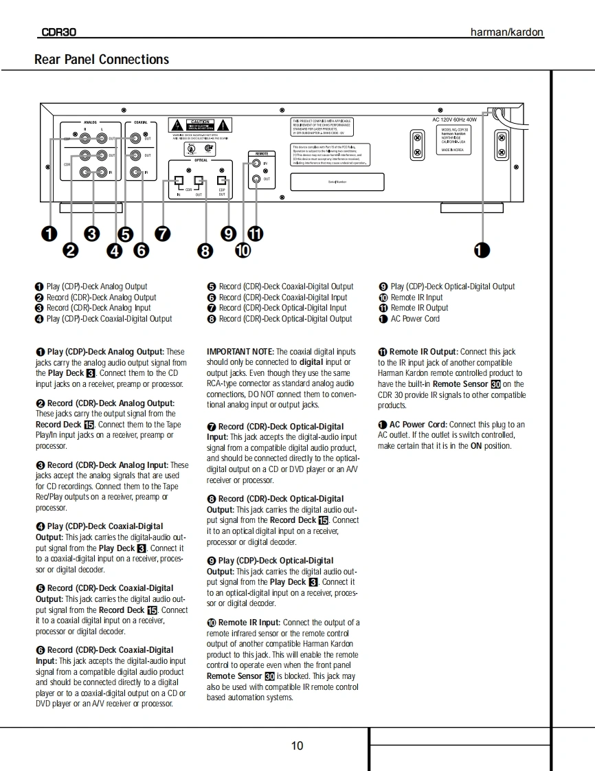 harman/kardonModel CDR30Dual Tray CD/CD-R/CD-RW Recorder/PlayerSERVICE MANUALharman/kardon CR30-下0e8ef900!-⊙©©CONTENTSSERVICING PRECAUTIONS................2DETAILED TROUBLESHOOTING GUIDE .......17ESD PRECAUTIONS......................4BLOCK DIAGRAMS.......................34SPECIFICATIONS........................5EXPLODED VIEWS.......................37FRONT PANEL CONTROLS....................6MECHANICAL PARTS LIST.....................40FRONT PANEL DISPLAY .................8ELECTRICAL PARTS LIST..................42REAR PANEL CONNECTIONS.…10PCB DRAWINGS.......................61REMOTE CONTROL FUNCTIONS............11SCHEMATIC DIAGRAMS................71INSTALLATION/CONNECTIONS..............13WIRING DIAGRAM..........................88BASIC TROUBLESHOOTING GUIDE............15PACKAGE.....90SPECIAL NOTES ON CDR30 RECORDING....16harman/kardon,Inc.250 Crossways Park Dr.Woodbury,New York 11797Rev02/2004