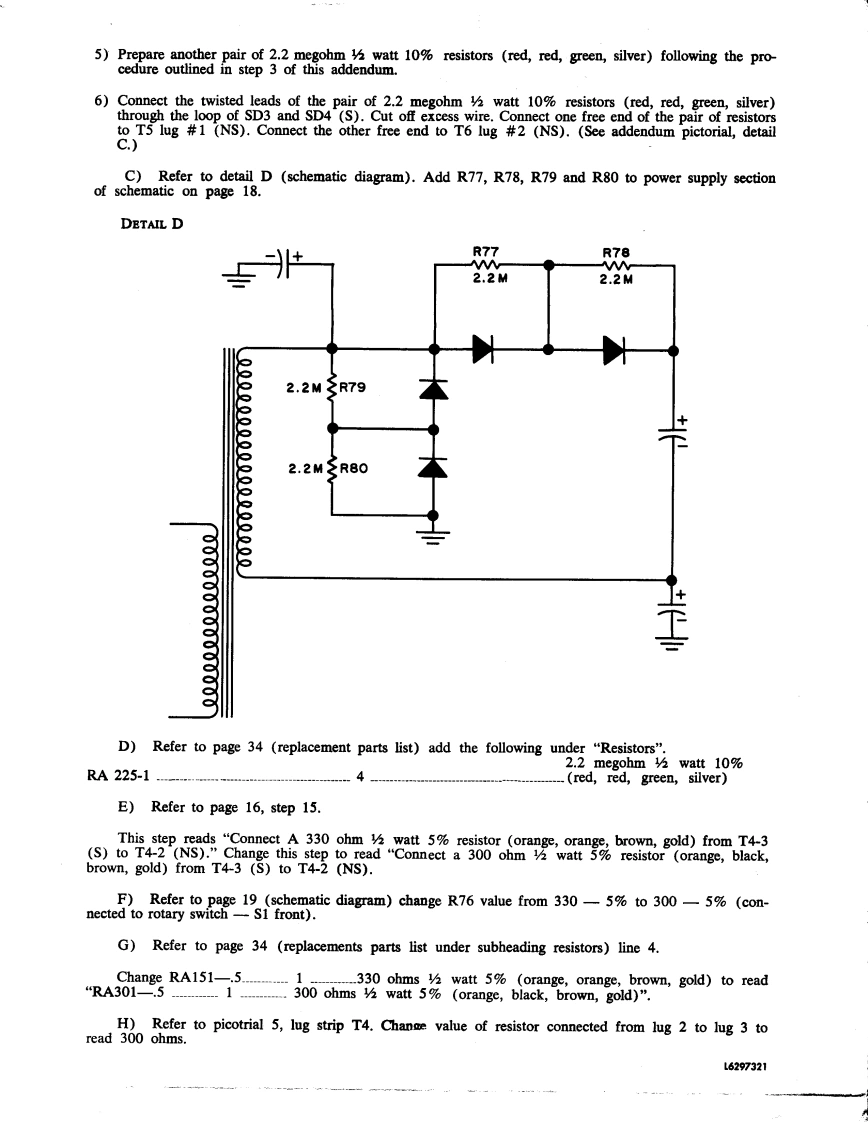 harmankardonADDENDUM SHEET -CITATION IIBefore proceeding with the construction of your kit,please make the following changes in yourassembly and operation manual.A)Refer to page 10.1)Change step 11 to read,"Hook cathode lead from SD1 with anode lead from SD2 (NS).Do not cutoff excess wire.Fragile!Use caution handling leads."(See addendum pictorial,detail A.)DETAIL AEXCESSLEADLOOP2)Change step 12 to read,"Hook anode lead from SD3 with cathode lead SD4 (NS).Do not cut offexcess wire.'B)Insert the following 4 steps directly after step 16 on page 10.3)Twist a pair of 2.2 megohm watt 10%resistors (red,red,green,silver)together as shown in ad-dentum pictorial,detail B.Slip a small piece of sleeving over the twisted leads.DETAIL B2.2M2.2MSLEEVING4)Connect the twisted leads of the pair of 2.2 megohm watt 10%resistors (red,red,green,silver)through the loop of SD1 and SD2 (S).Cut off excess wire.Connect one free end of the pair of resistorsto T5 lug #1 (NS)and connect the other free end to T5 lug #2(NS).See addendum pictroial,detailDETAIL C②.2MGSLEEVINGSD122M02.2MGLUG(I)2.2MeSD3LUG (2)01T5400VSD