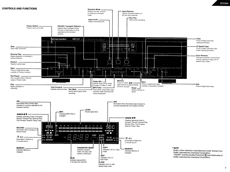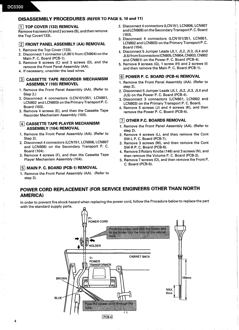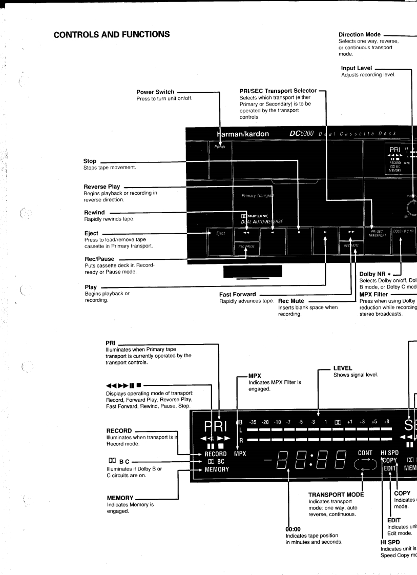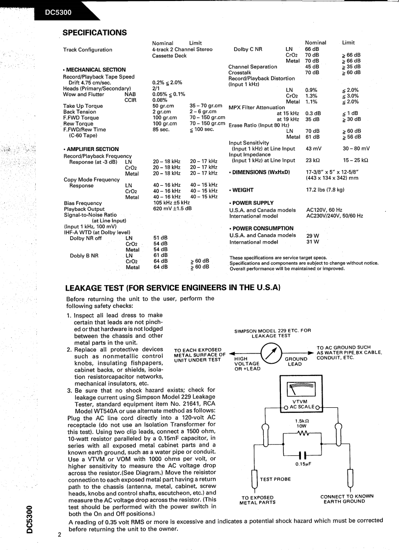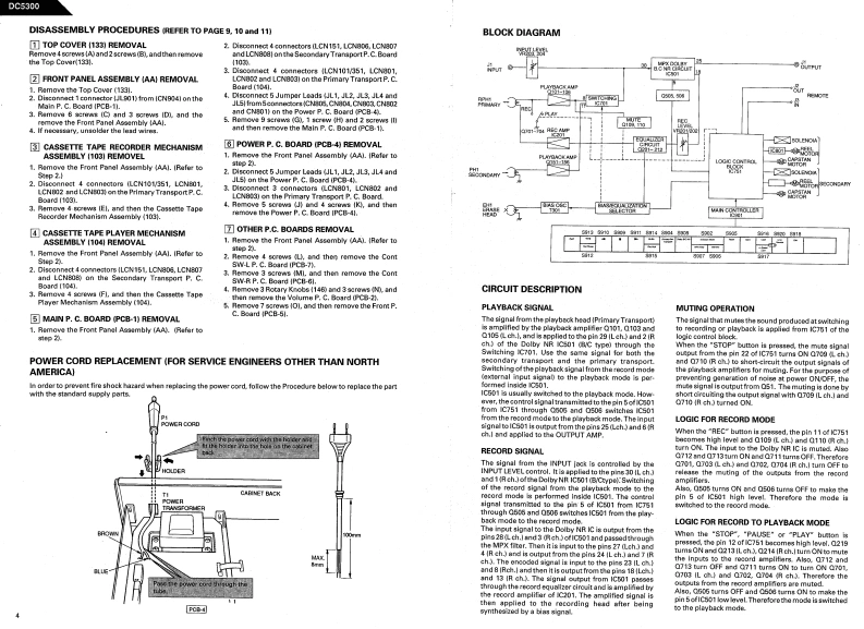 The Harman KardonModel DC5300Manual 177ADUAL CASSETTE DECKTechnical ManualThe following marks found in the parts list of this manualidentify the models as follows.R:North America area model Black versionB:International model Black versionB:Australia model Black versionCONTENTSSPECIFICATIONS.…42GENERAL UNIT ...........LEAKAGE TEST2GENERAL UNIT PARTS LIST...........9.CONTROLS AND FUNCTIONS3CASSETTE TAPE PLAYER/RECORDERDISASSEMBLY PROCEDURES..............4.MECHANISM,PARTS LIST.....9POWER CORD REPLACEMENT.........4WIRING DIAGRAM........10BLOCK DIAGRAM......4P.C.BOARDS........11CIRCUIT DESCRIPTION4ELECTRICAL PARTS LIST......13TIMING CHART...................5IC BLOCK DIAGRAM.........20ALIGNMENT PROCEDURES........6SCHEMATIC DIAGRAM.........23harman/kardonParts and Service Office240 Crossways Park West,Woodbury,N.Y.117971112-0010A152 P-129109 2000 Printed in JapanDC5300