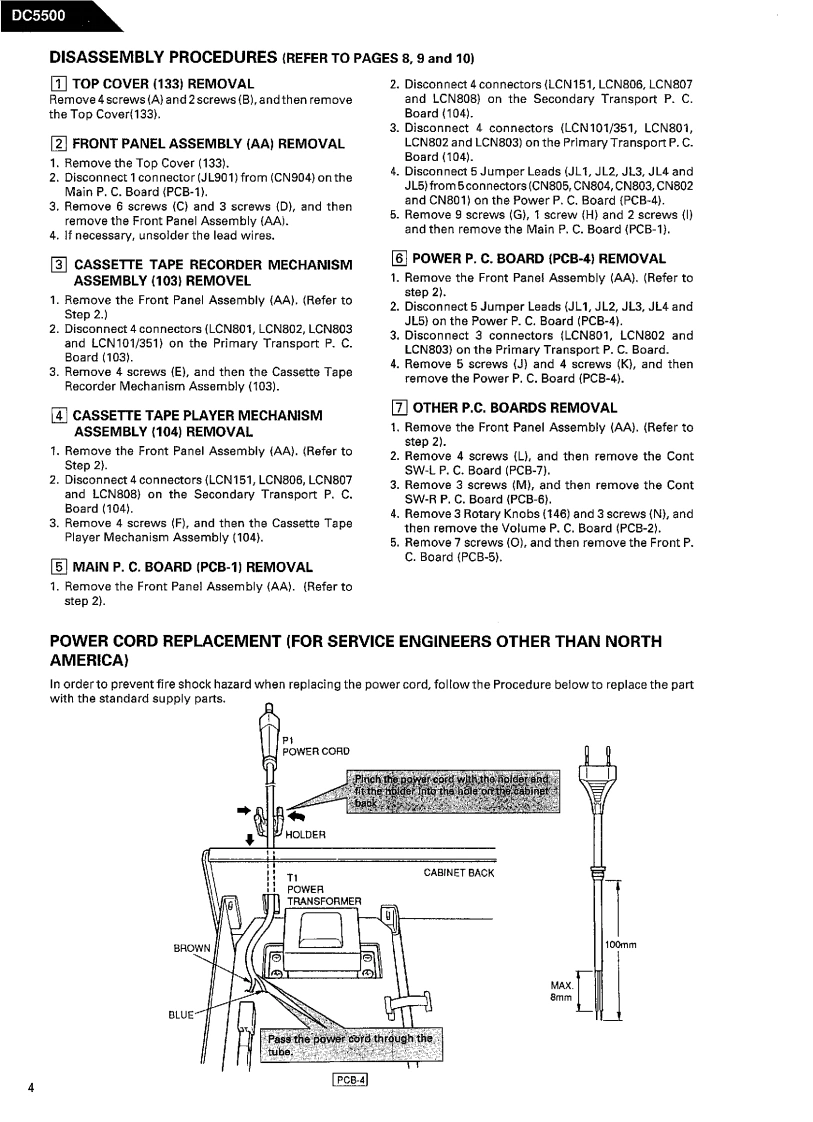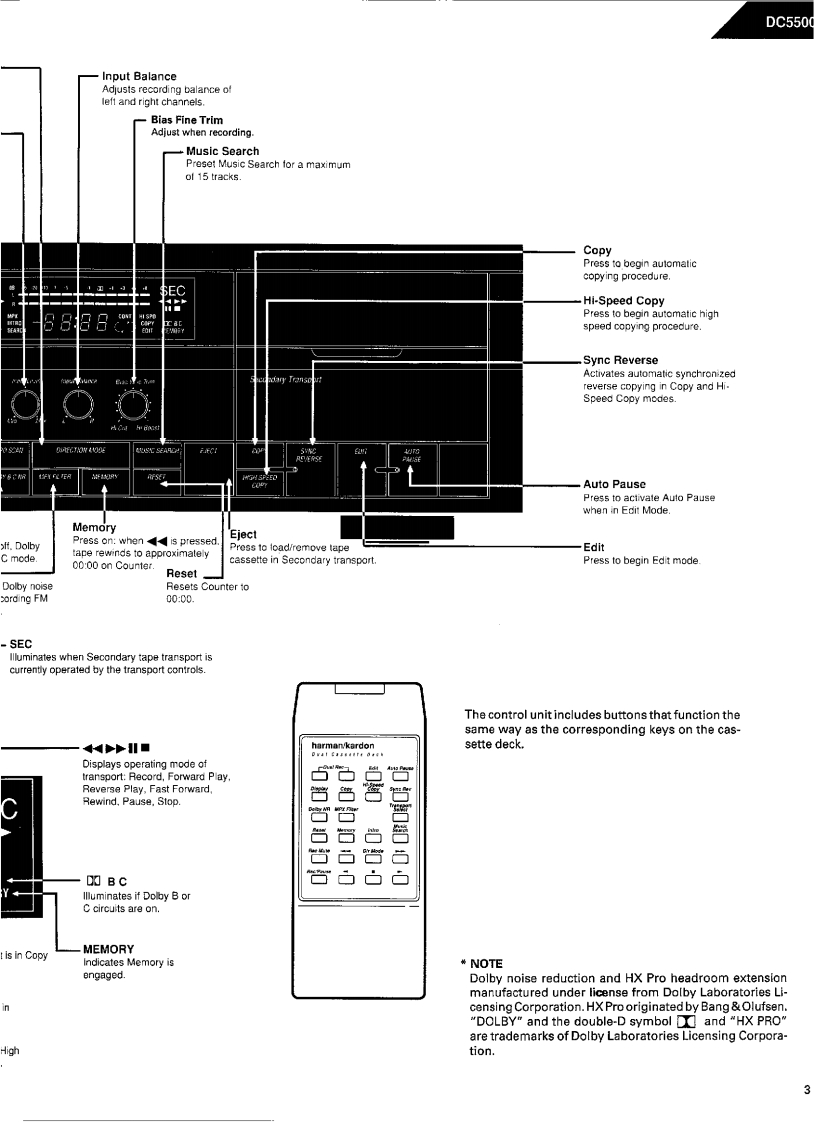 The Harman KardonModel DC5500Manual 178ADUAL CASSETTE DECKTechnical ManualThe following marks found in the parts list of this manualidentify the models as follows.North America area model Black versionInternational model Black versionB Australia model Black versionCONTENTSSPECIFICATIONS.........GENERAL UNIT.....8LEAKAGE TEST...........2GENERAL UNIT PARTS LIST9CONTROLS AND FUNCTIONS...................3CASSETTE TAPE PLAYER/RECORDERDISASSEMBLY PROCEDURES .................MECHANISM,PARTS LIST......9POWER CORD REPLACEMENT.4WIRING DIAGRAM.......10BLOCK DIAGRAM.4P.C.BOARD.....11CIRCUIT DESCRIPTION................4ELECTRICAL PARTS LIST..13TIMING CHART...5IC BLOCK DIAGRAM...,20ALIGNMENT PROCEDURES ...............6SCHEMATIC DIAGRAM...........22harman/kardonParts and Service Office240 Crossways Park West.Woodbury,N.Y.117971112-0020A152 P-129109 2000 Printed in Japan