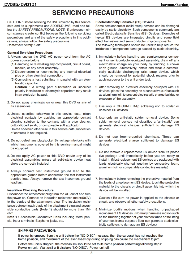 harman kardonModels DVD 25 DVD101DVD/CD/CD-R/CD-RW/CD MP3 PlayerService Manualharman/kardonN025dts0036:022harman/kardon田程回0730329O⊙OO0O0ContentsPRODUCT SAFETY SERVICE GUIDELINES...2(DVD25)BULLETIN HK2003-06...............17SERVICE PRECAUTIONS....................3(DVD25)TECH TIP HKTT2004-02..............20SPECIFICATIONS..4OVERALL EXPLODED VIEW............1FEATURES..................5BLOCK DIAGRAM.......................22FRONT PANEL CONTROLS....................6(DVD25)MECHANICAL PARTS LIST.............23INFORMATION DISPLAY7(DVD25)ELECTRICAL PARTS LIST..............5REMOTE CONTROL....................8(DVD101)MECHANICAL PARTS LIST...........31REAR PANEL CONNECTIONS..10(DVD101)ELECTRICAL PARTS LIST............33INSTALLATION/CONNECTIONS.11PCB DRAWINGS.......38TEST SCREEN......................15SCHEMATICS....43BASIC TROUBLESHOOTING GUIDE/RESET.............16harman/kardon,Inc.250 Crossways Park Dr.Woodbury,New York 11797Rev08/2004www.electronicsrepair.net
