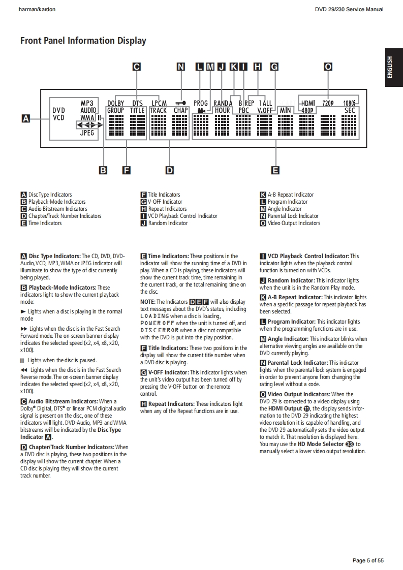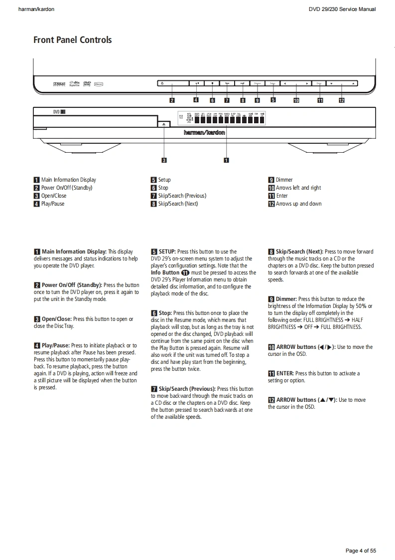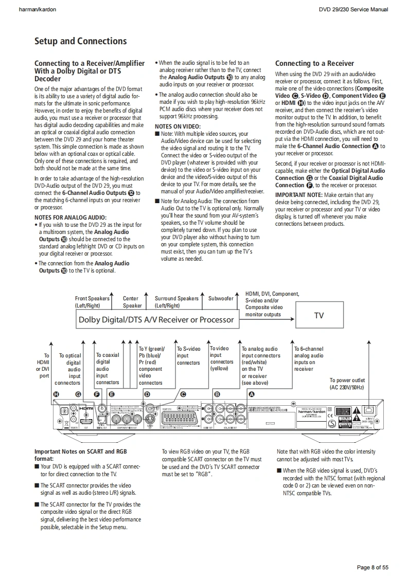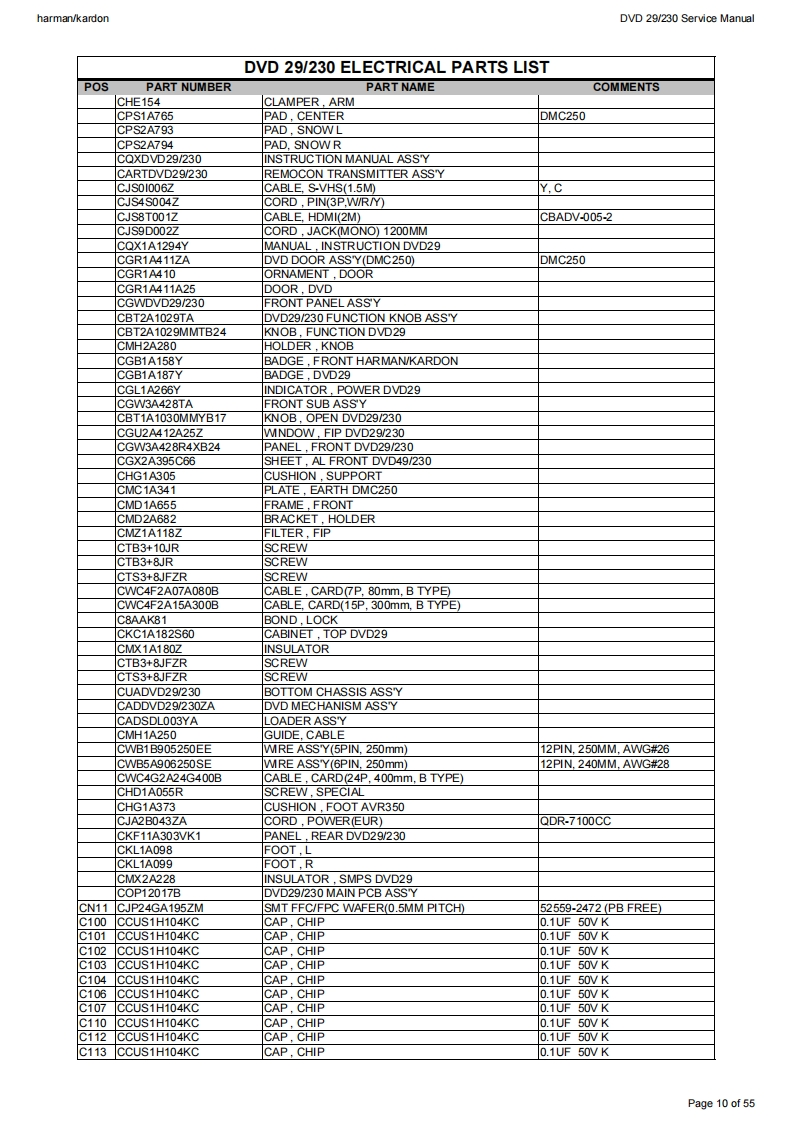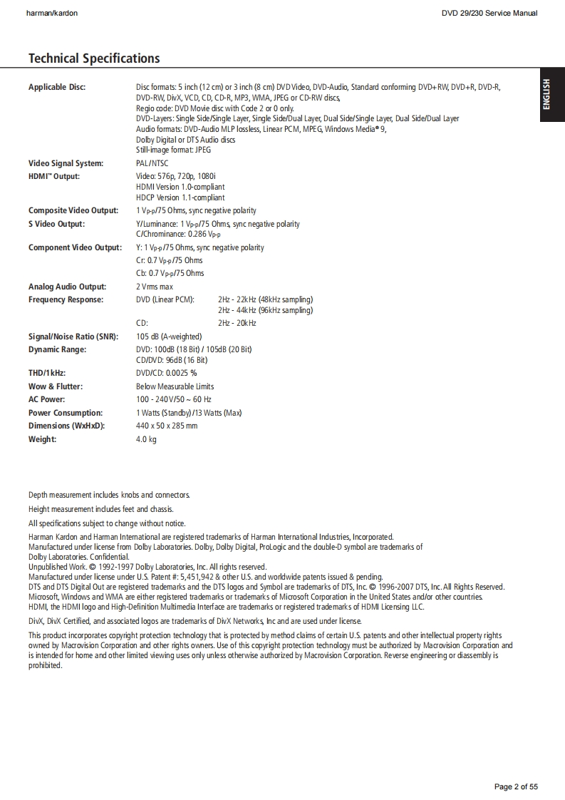 harman/kardonDVD 29/230 Service Manualharman/kardonService ManualDVD29/230DVD playerD图",“171:28:64harman/kardonCONTENTSTECHNICAL SPECIFICATIONSEXPLODED VIEW9TROUBLESHOOTING GUIDE3PARTS LISTFRONT PANEL CONTROLSSEMICONDUCTOR PINOUTS24FRONT PANEL DISPLAY6WIRING DIAGRAMREAR PANEL CONNECTIONSSCHEMATIC DIAGRAMS51SETUP AND CONNECTIONS7Released EU2008harman/kardon,Inc.Rev0,10/2008250 Crossways Park Dr.Woodbury,New York,11797Page 1 of 55