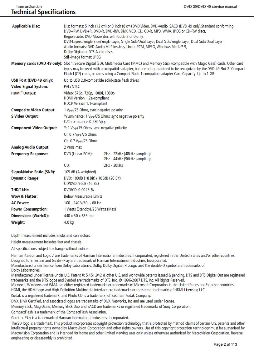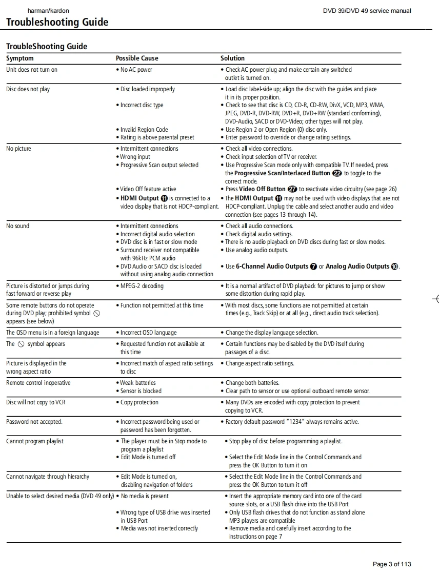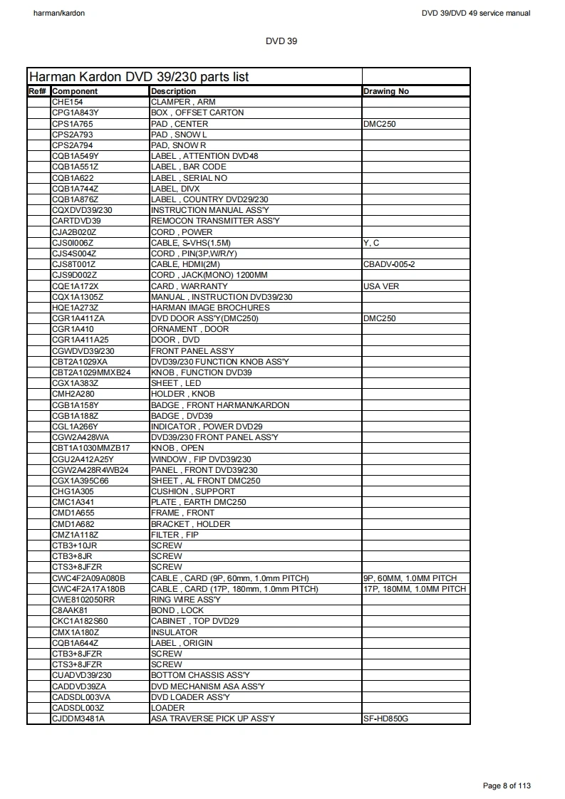 harman/kardonDVD 39/DVD 49 service manualharman/kardonService ManualDVD39/230DVD49/230DVD playersD图”17I:28:84harman/kardon”18“31:49harman/kardonCONTENTSBASIC SPECIFICATIONSDVD 49 PARTS LIST30TROUBLESHOOTING GUIDE3SEMICONDUCTOR PINOUTSDVD 39 PACKAGE LIST AND PARTS4DVD 39 PCB DRAWINGS酚DVD 39 EXPLODED VIEWDVD 49 PCB DRAWINGS99DVD 49 PACKAGE LIST AND PARTS6DVD 39 BLOCK DIAGRAM101DVD 49 EXPLODED VIEWDVD 49 BLOCK DIAGRAM102DVD 39 PARTS LISTWIRING DIAGRAM103SCHEMATIC DIAGRAMS104Released EU2008harman/kardon,Inc.Rev0,07/2008250 Crossways Park Dr.Woodbury,New York,11797Page 1 of 113