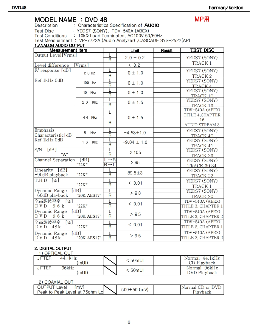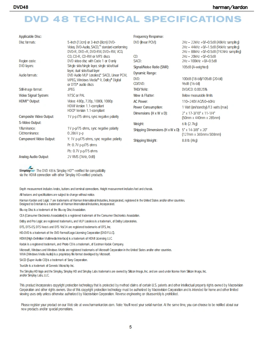 harman kardonModel DVD 48DVD/CD/CD-R/CD-RW/VCD MP3 PlayerService ManualDD围6:a1harman/kardonContentsSERVICE PRECAUTIONS...................BASIC TROUBLESHOOTING GUIDE............25BASIC SPECIFICATIONS.......5.DISASSEMBLY PROCEDURE (120/230v).......27DETAILED SPECIFICATIONS..........6EXPLODED VIEW (120v).......8PACKAGE (120V).............10BLOCK DIAGRAM...........29FRONT PANEL CONTROLS....................11ELECTRICAL PARTS LIST (120v)...............30INFORMATION DISPLAY.........13PCB DRAWINGS....................53REAR PANEL CONNECTIONS......14SEMICONDUCTOR PINOUTS................59REMOTE CONTROL......................16SCHEMATICS......168CONNECTIONS.........19WIRING DIAGRAM.............................174INSTALLATION22harman/kardon,Inc.250 Crossways Park Dr.Woodbury,New York 11797Rev08/2007Released 2007Discontinued XXXX