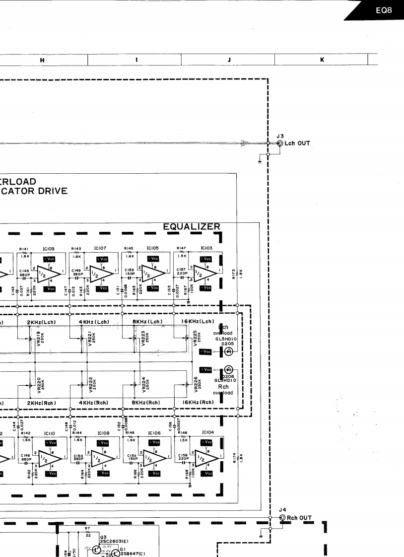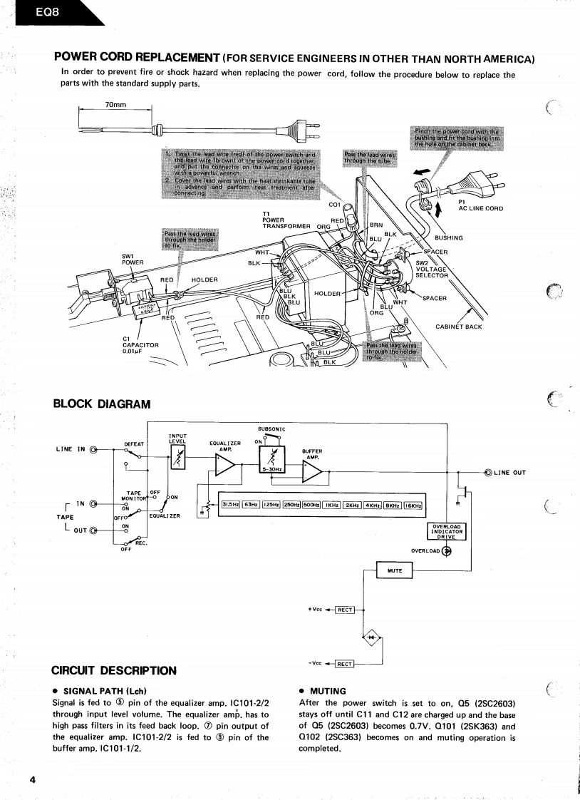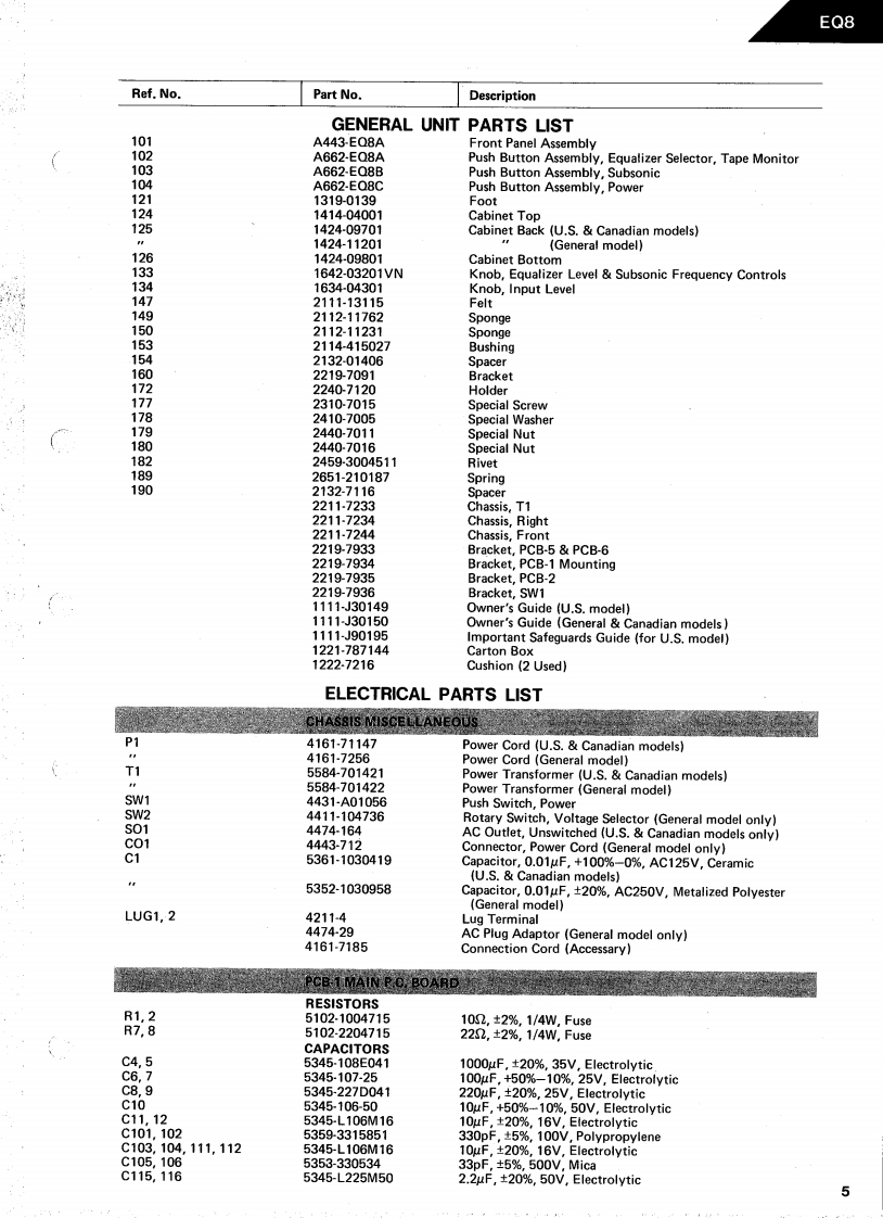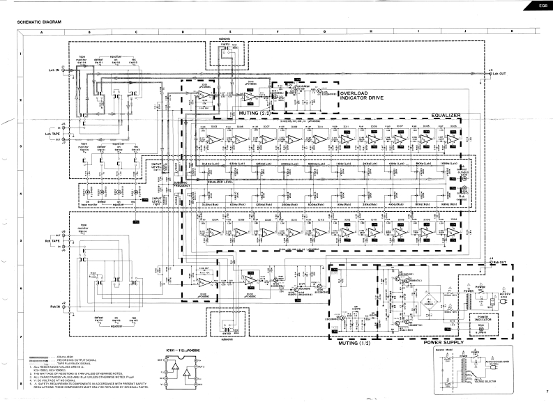 The Harman KardonModel EQ8Manual No.61AGRAPHIC EQUALIZERTechnical ManualSPECIFICATIONSNominal LimitInput Sensitivity at 1V Output1.1V±1dBDimensions (W x Hx D)17.7/16"×4"×13-7/16Input Impedance35k2≥30k2(443×102×341mmSignal-to-Noise Ratio (IHF-A)115dB2112dBWeight91bs.15oz.(4.5kgCrosstalk at 10kHz68dB2 65dBPower SuppliesOverload (20~20kHz)5.0V24.5VU.S.Canadian modelsAC 120V,60HzOverload Indicator4.4V24.2VGeneral modelAC100/120/220/240VFrequency Response at OdB0.25Hz~180kHz50/60HzTHD at 2V Output (20~20kHz)0.005%<0.01%Power Consumption8WCenter Frequency31.5,63,125,250,5001k,2k,4k,8k,16kHzEqualizer Control Action±12.5dB±1.0dBInput Level Control-20dB±1.0dBSubsonic Filter 5Hz3.5dB±1dBThis specification is the target of servicing.But,there is a case30Hz3.5dB±1dBthat the specification is not applicable to the measurementcondition and instrument.Square Wave Tilt (20Hz)3.5%≤5%Specifications and components subject to change without notice.Square Wave Response(1kHz)0.14V≤0.25VOverall performance will be maintained or improved.harman/kardon240 CROSSWAYS PARK WEST.WOODBURY.N.Y.117971112-H15261AB P-08834 1650 PRINTED IN JAPAN