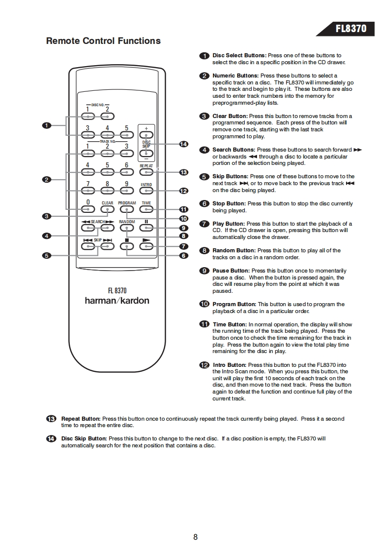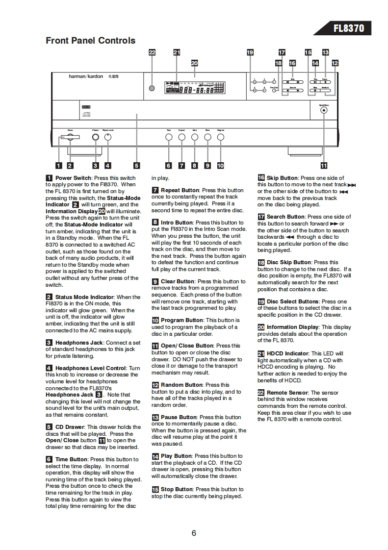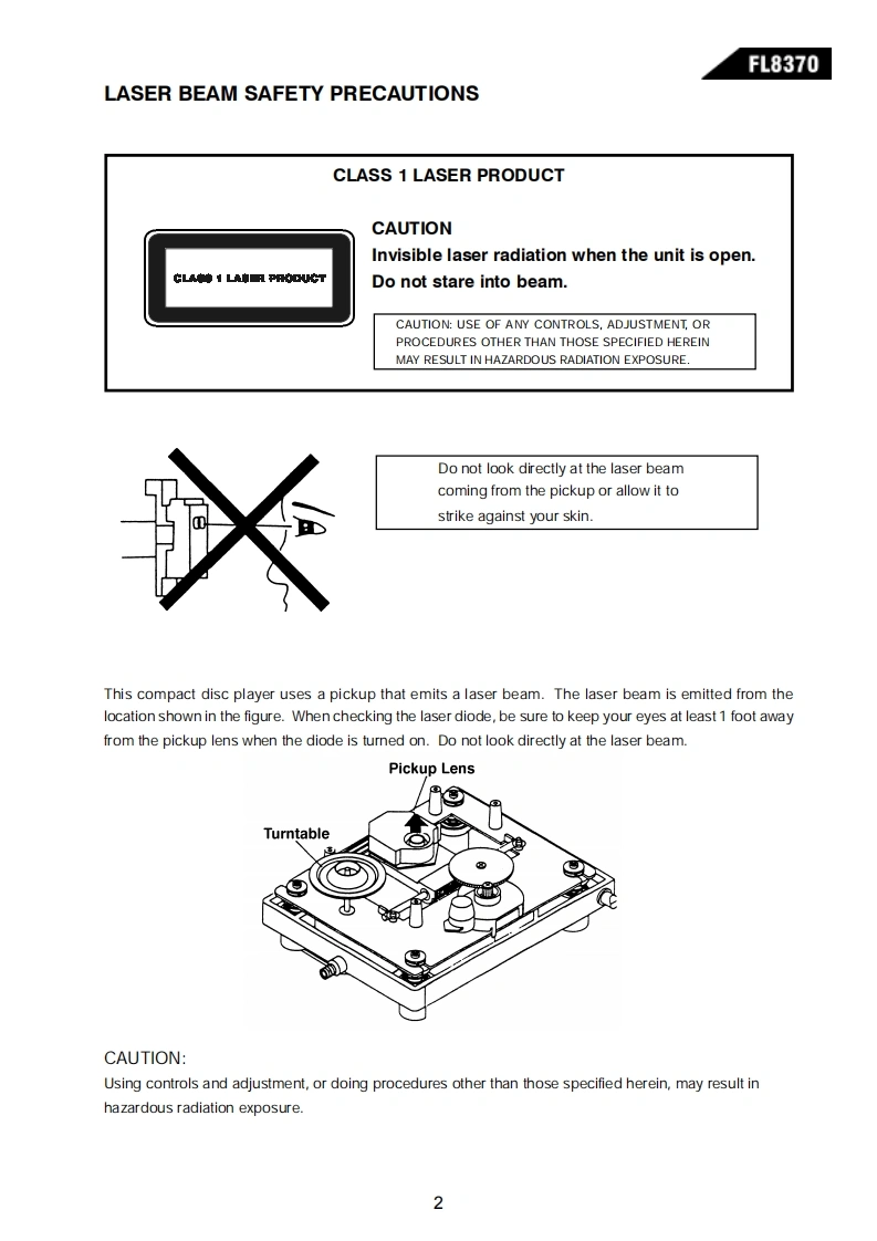 harman/kardonModel FL83705 Disc Compact Disc ChangerSERVICE MANUALharman/kardon R83707河角59攀CONTENTSLASER BEAM SAFETY PRECAUTIONS.........2CIRCUIT DESCRIPTION...................23OTHER PRECAUTIONS.....................3BASIC TROUBLESHOOTING.................30SPECIFICATIONS..........4DETAILED TROUBLESHOOTING..............31FRONT PANEL CONTROLS...................6SEMICONDUCTOR IDENTIFICATION............37REAR PANEL CONNECTIONS.......7ELECTRICAL PARTS LIST....................8REMOTE CONTROL FUNCTIONS..............8MECHANICAL PARTS LIST....................80TEST PROCEDURE......................9PRINTED CIRCUIT BOARDS................83BLOCK DIAGRAM...............11SCHEMATIC DIAGRAMS...............92DISASSEMBLY PROCEDURE....................12PACKAGE.5GENERAL UNIT EXPLODED VIEW I,Il ........17harman/kardon,Inc.250 Crossways Park Dr.Woodbury,New York 11797Rev011/2000