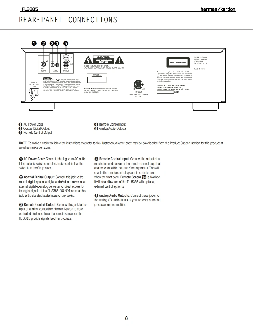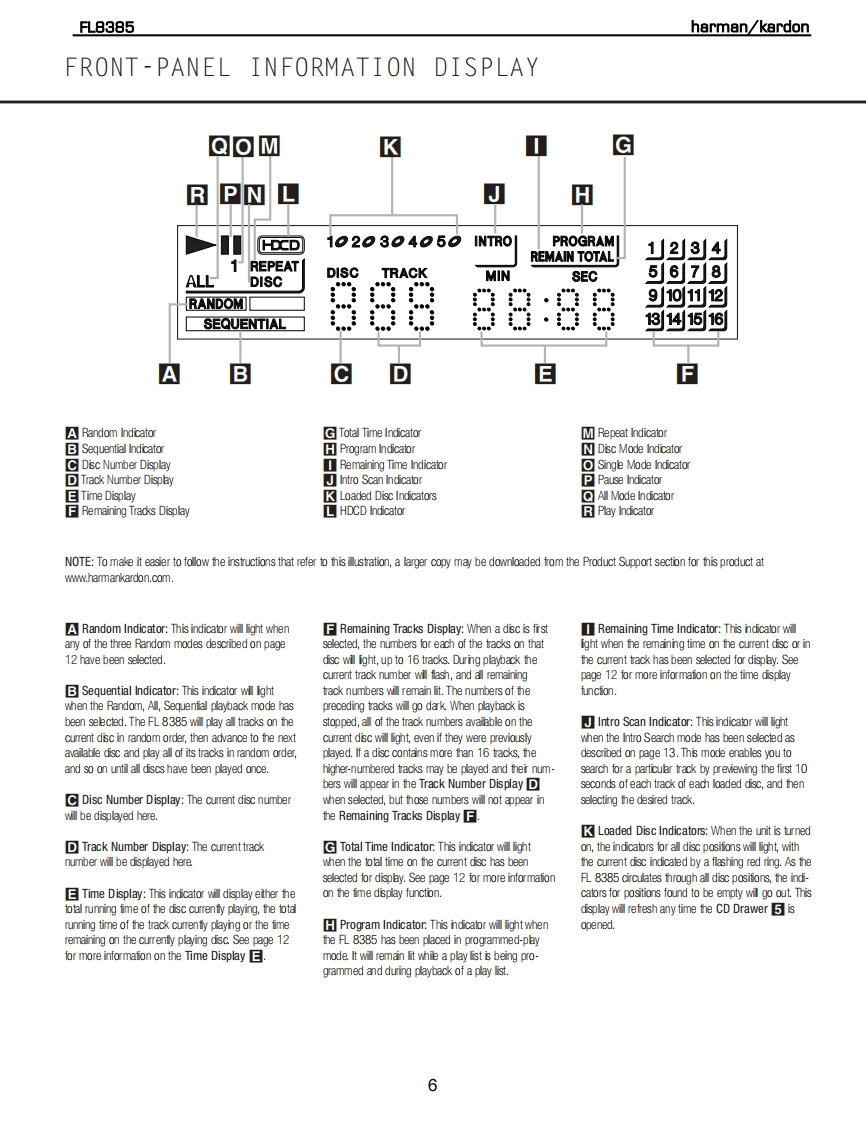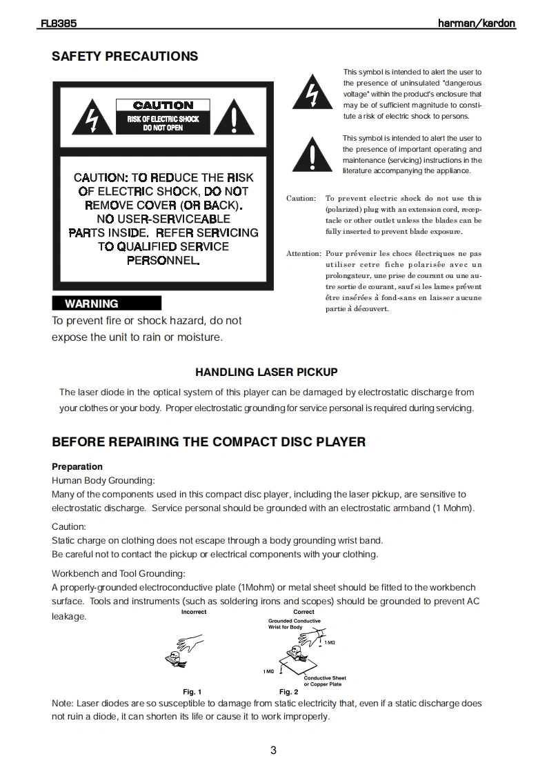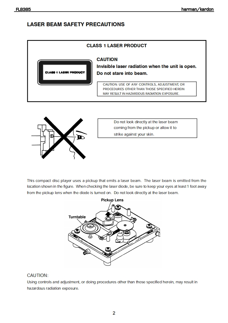 harman/kardonModel FL83855 Disc Compact Disc ChangerSERVICE MANUALharman/kardon Fl8335729國CONTENTSLASER BEAM SAFETY PRECAUTIONS.........2TEST PROCEDURE...........................14OTHER PRECAUTIONS..3CIRCUIT DESCRIPTION.................16SPECIFICATIONS.....4DETAILED TROUBLESHOOTING...............20FRONT PANEL CONTROLS.............5SEMICONDUCTOR IDENTIFICATION...........26REAR PANEL CONNECTIONS..........8MECHANICAL PARTS LIST.......49REMOTE CONTROL FUNCTIONS...............9ELECTRICAL PARTS LIST .......................51BASIC TROUBLESHOOTING GUIDE............10PRINTED CIRCUIT BOARDS ...................60GENERAL UNIT EXPLODED VIEW............11SCHEMATIC DIAGRAMS..................645 CD MECHANISM EXPLODED VIEW ..........12PACKAGE.oBLOCK DIAGRAM...................13harman/kardon,Inc.250 Crossways Park Dr.Woodbury,New York 11797Rev13/2004