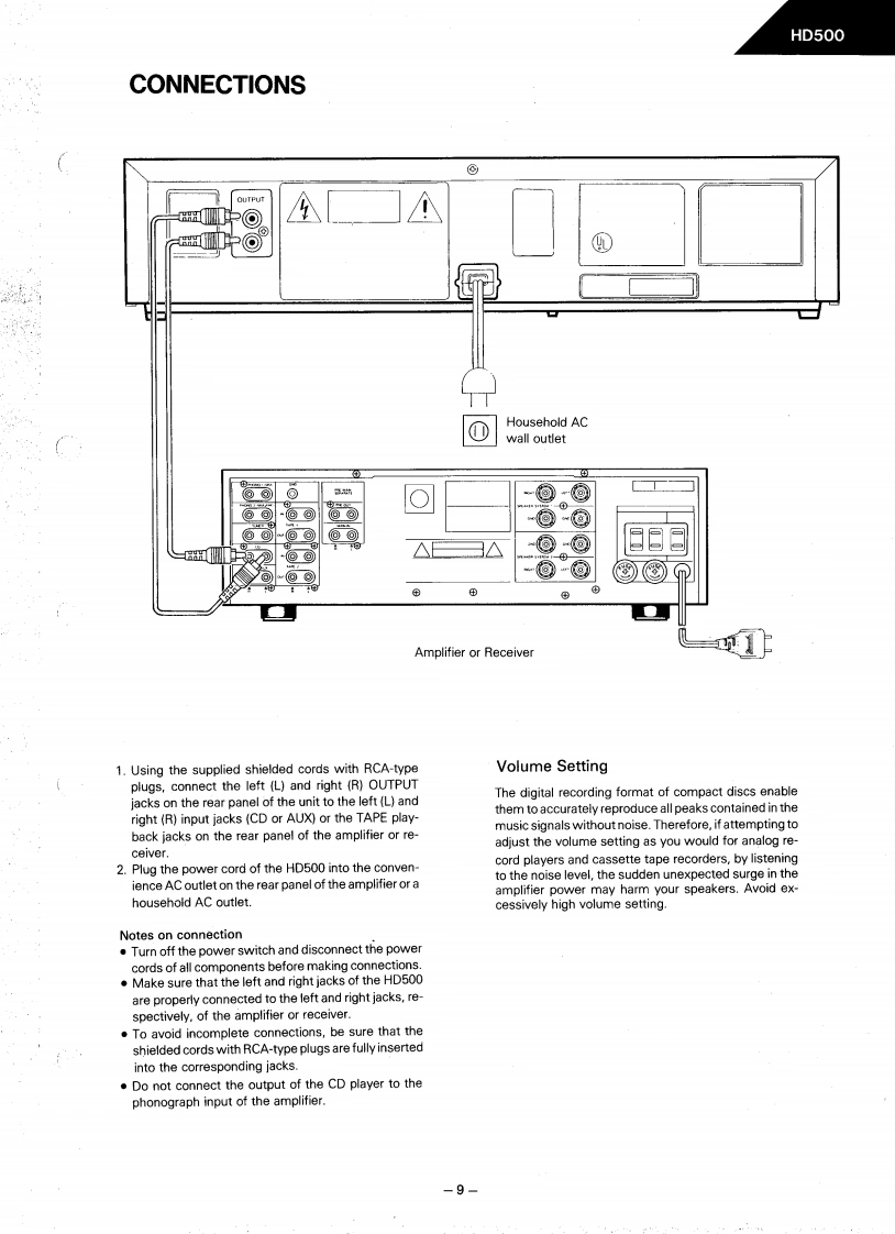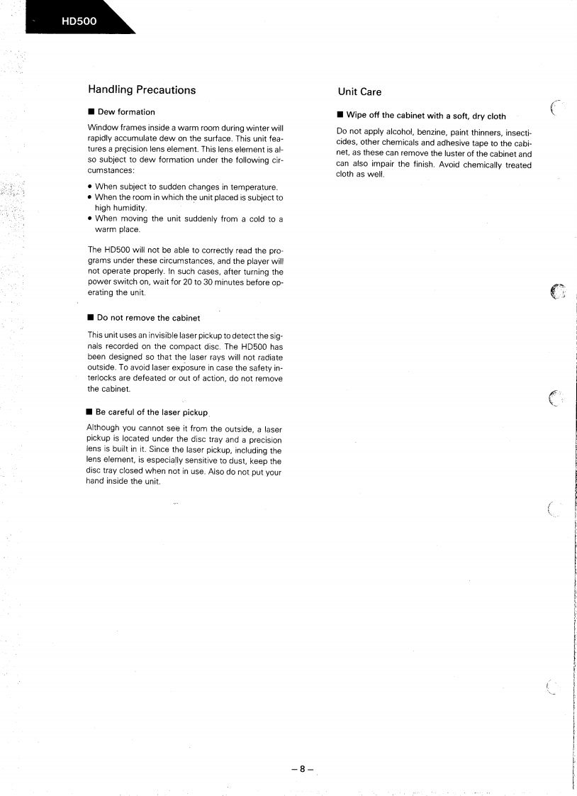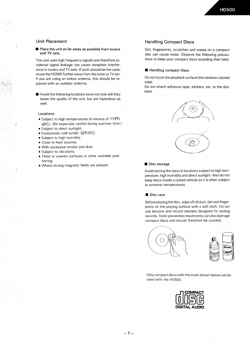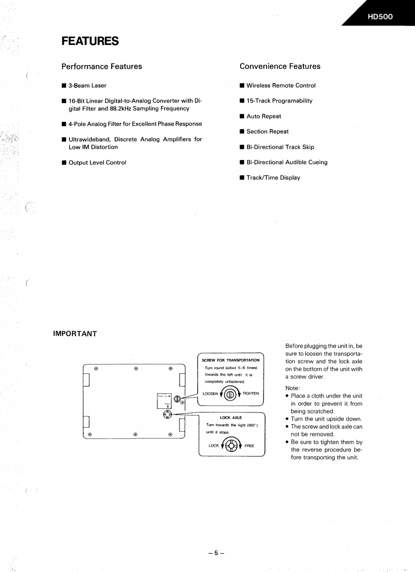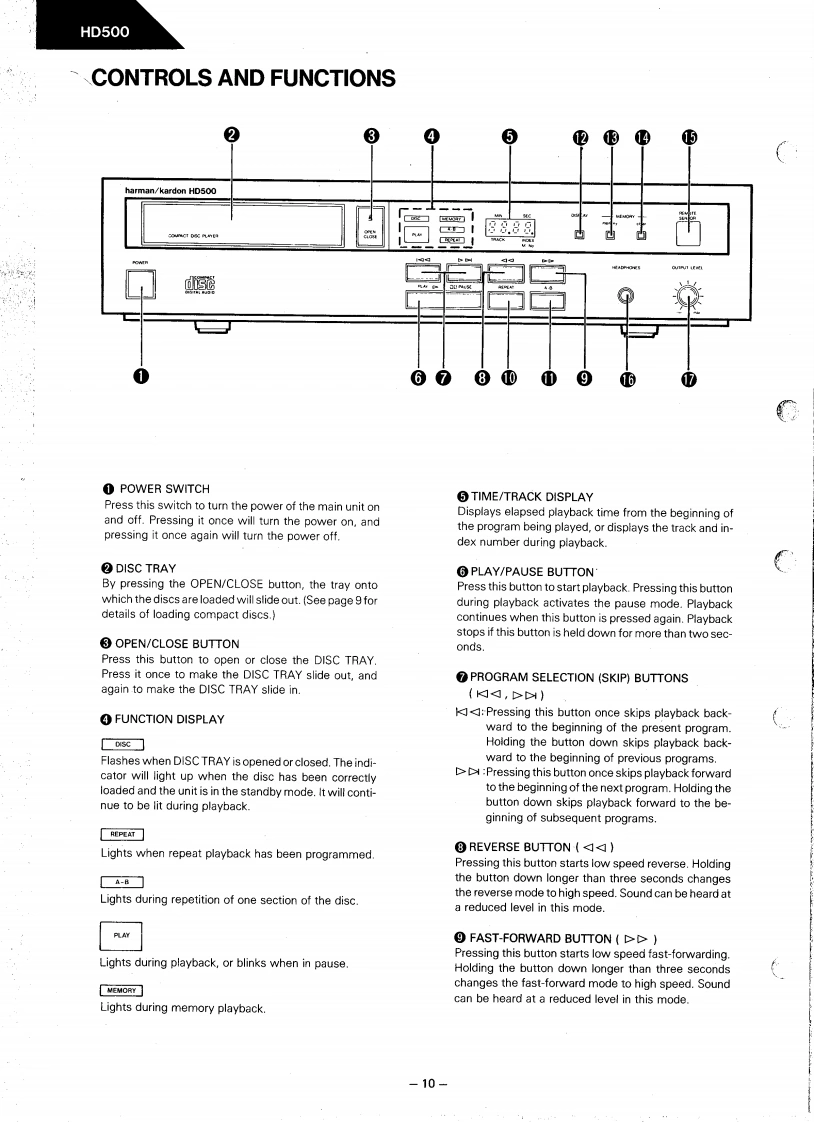 The Harman KardonModel HD500Manual 96ACOMPACT DISC PLAYERTechnical ManualSPECIFICATIONSSystem....Compact Disc Digital AudioSignal Detection3-Beam Semiconductor LaserError Correction…Sampling Frequency.…44.1kHzQuantization16Bit LinearChann.....2Channel StereoFrequency Response4-20.000Hz±0.5dBTotal Harmonic Distortion...............................................0.01%1kHz】Dynamic Range.94dBSignal-to-Noise Ratio..100dBChannel Separation..................83dB(1kHz)Now&Flutter.….....................ImmeasurableLine Output Level/Load Impedance .......Variable,Max.2.4V/10kOhmsHeadphone OutputLevel/Load Impedance.......25mW/320hmsPower RequirementsUSA Canada models…AC120V,60HzGeneral modelAC100/120/220/240V.50/60HzP0 wer Consumpti0n…,20WDimensions (Wx Hx D)17-1/2°×4-1/16°×13-3/16(443×103x335mm)Weight.12.8bs(5.8kg.......................Stereo Connecting CordsRemote ControlAA Battery (x 2)All specifications and features subject to change without notice.harman/kardon阳eo08pta8opmm7HD500