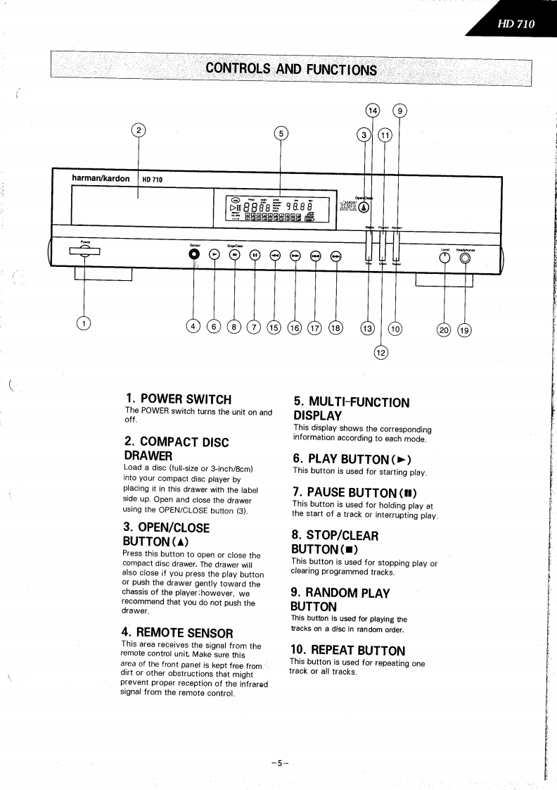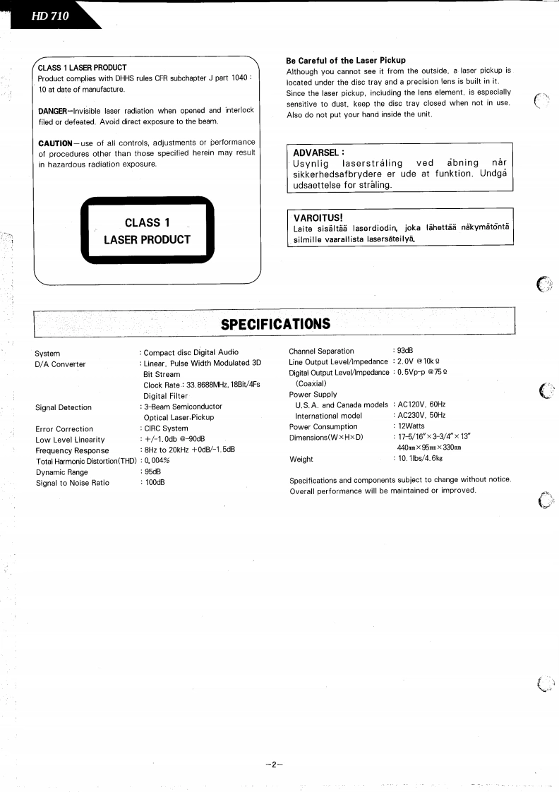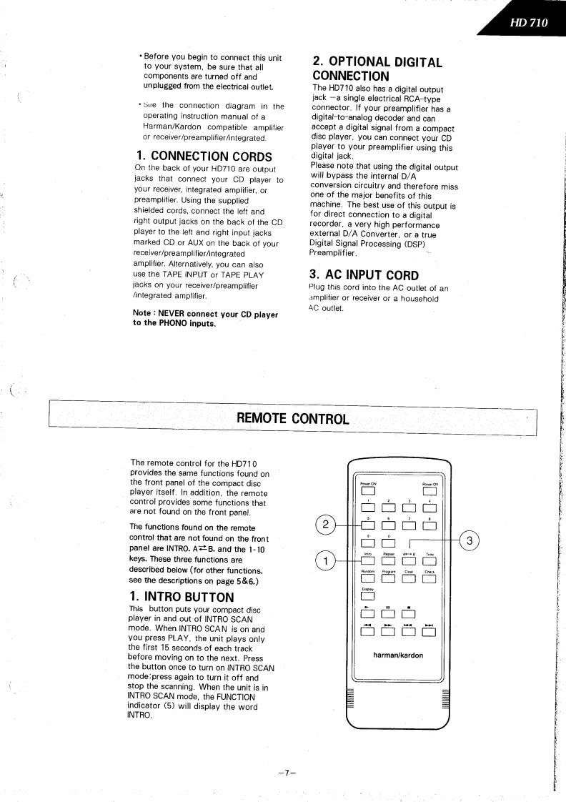 The Harman KardonModel HD710Manual ACOMPACT DISC PLAYERTechnical ManualMODEL HD 710harman/kardon HD710u日888安8888苎阳驱器翠ō⊙6⊙⊙⊙⊙⊙δoThe following marks found in the parts list of this manual identify the models asfollows:HD710 B:North America area model Black versionHD710International model Black versionHD710International modelCONTENTSSPECIFICATIONS.444…2ICBL0 CK DIAGRAMS…38SAFETY PRECAUTIONS…3REMOTE CONTROL SCHEMATIC DIAGRAM...42CONTROLS AND FUNCTIONSELECTRICAL PARTS LIST....................43DISASSEMBLY PROCEDURES.........................9SCHEMATIC DIAGRAMS.48POWER CORD REPLACEMENT................9BLOCK DIAGRAMS44…49ADJUSTMENT PROCEDURE.............10WIRING DIAGRAM--...TROUBLE SHOOTNG...................14P.C.B0ARDS…51IC TERMINAL FUNCTIONS4…19EXP儿0 DED VIEW+…52CIRCUIT DESCRIPTION+…24CD MECHANISM EXPLODED VIEW......54PACKING DRAWING -.4…55harman/kardonParts and Service Office80 Crossways Park West.Woodbury.N.Y.117971112-HD710 1295,600 Printed in KOREA.