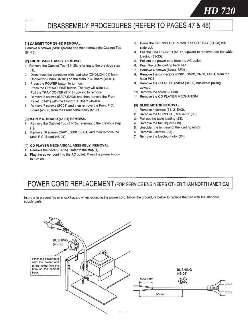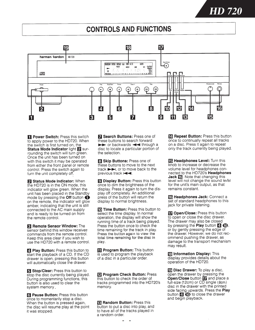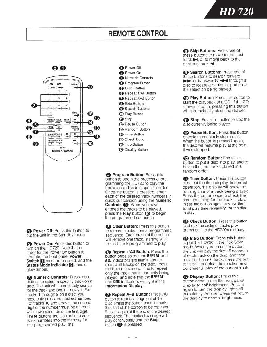 The harman kardonModel HD 720Manual ACOMPACT DISC PLAYERTechnical Manualharman/kardon2017623¥四o(⊙⊙⊙⊙⊙⊙0 o120v.............for U.S.A.230V................for EURCONTENTSSPECIFICATIONS…2REMOTE CONTROL SCHEMATIC DIAGRAM......35SAFETY PRECAUTIONS…3ELECTRICAL PARTS LIST..........36CONTROLS AND FUNCTIONS..5FUNCTIONAL BLOCK DIAGRAM.......40DISASSEMBLY PROCEDURES.....9NIRING DIAGRAM…41POWER CORD REPLACEMENT............9SCHEMATIC DIAGRAM…42TROUBLE SHOOTING…10P.C.BOARDS…46IC TERMINAL FUNCTIONS16EXPLODED VIEW…47CIRCUIT DESCRIPTION......................20CD MECHANISM EXPLODED VIEW…·48IC BLOCK DIAGRAMS…31PACKING DRAWING…49harman/kardonParts and Service Office250 Crossways Park Dr.Woodbury,N.Y.117971112-HD720 0998 Printed In JAPANCEC6P20068030
