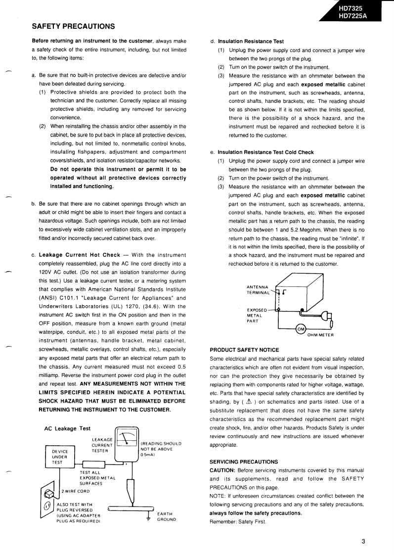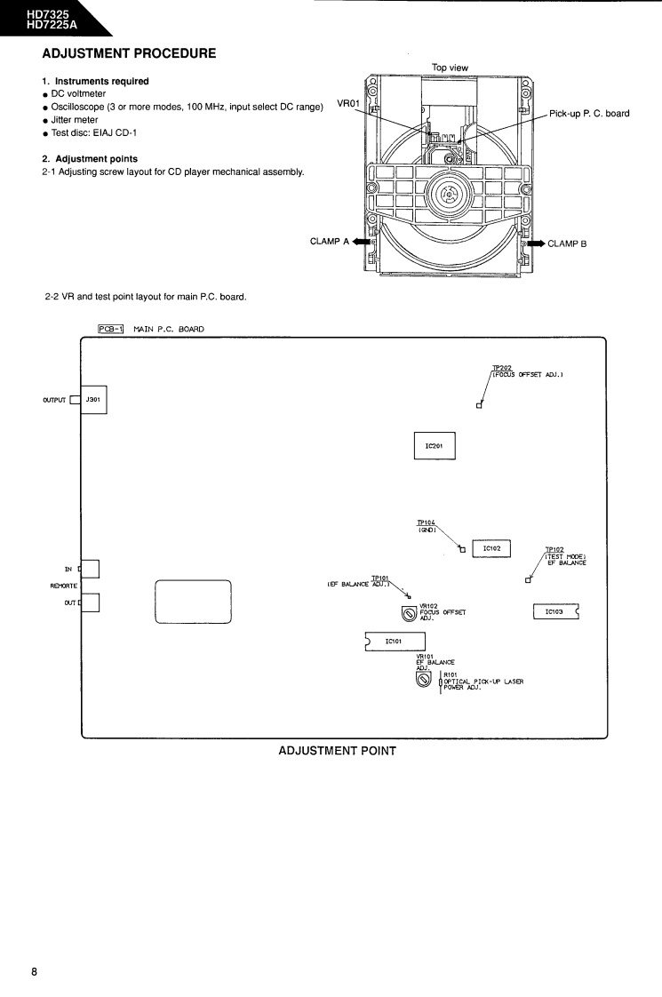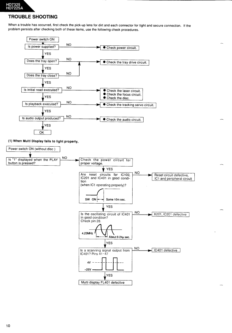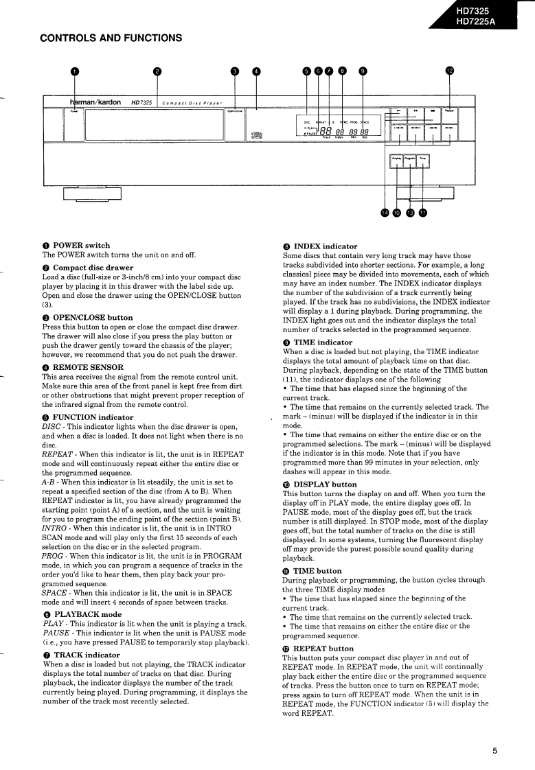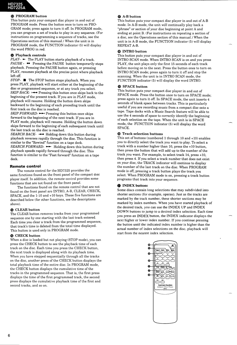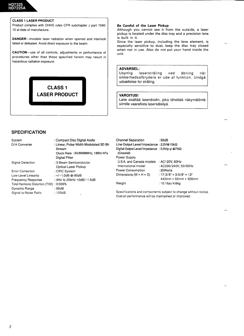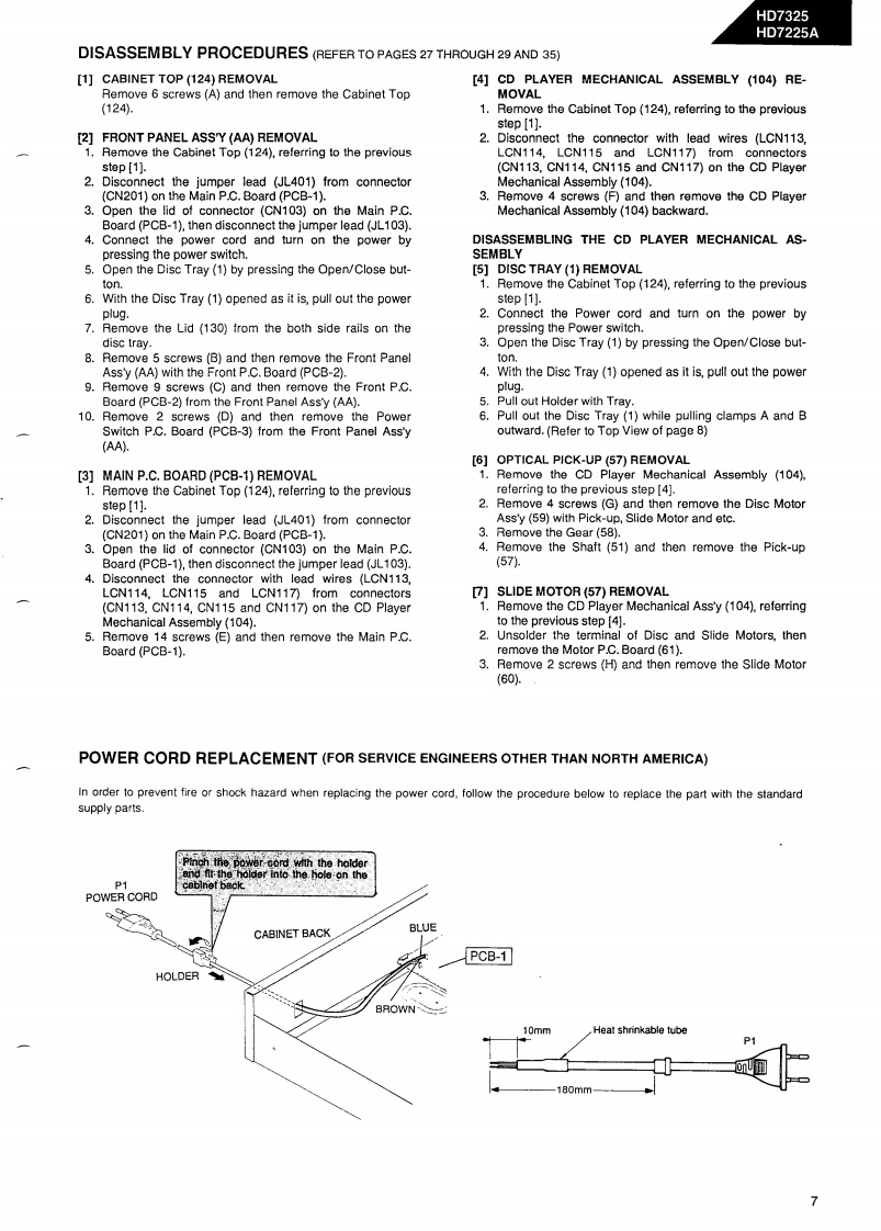 The Harman KardonModel HD7325/HD7225AManual 192ACOMPACT DISC PLAYERTechnical Manualharman/kardon HD7325日日附明胭The following marks found in the parts list of this manual identify the models asfollows:HD7325North America area model Black versionHD7225A/HD7325BInternational model Black versionHD7225A/HD7325International modelCONTENTSSPECIFICATION.......|C BLOCK DIAGRAMS*+…24SAFETYPRECAUTIONS......................CD MECHANISM EXPLODED VIEW...27CONTROLS AND FUNCTIONS.............CD MECHANISM PARTS LISTDISASSEMBLY PROCEDURES..................>GENERAL UNIT4…28POWER CORD REPLACEMENT......GENERAL UNIT PARTS LIST........................................29ADJUSTMENT PROCEDURE........8PCnB0 ARDS.................…30TROUBLE SHOOTING.........10ELECTRICAL PARTS LIST............31IC TERMINAL FUNCTIONSMIRING DIAGRAM…35CIRCUIT DESCRIPTION..................19SCHEMATIC DIAGRAMS..............................36harman/kardonParts and Service Office80 Crossways Park West,Woodbury.N.Y.117971112-0570A152 A9403 1500 Printed in Japan