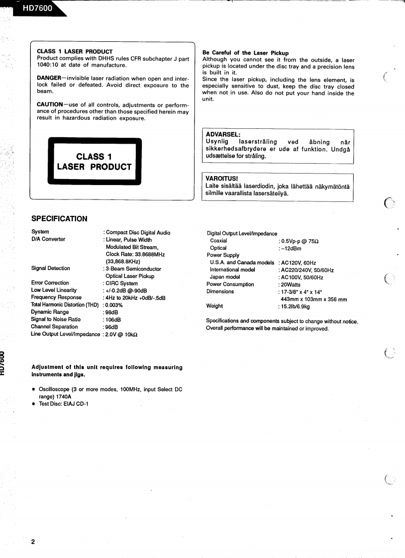 The Harman KardonModel HD7600Manual 154ACOMPACT DISC PLAYERTechnical ManualHD500t4et4d1esra四-889=9998白白白白白白白白白启当harman/kardonThe following marks found in the parts list of this manualidentify the models as follows.North America area model Black versionInternational modelInternational model Black versionJapan model Black versionAustralia model Black versionHD7600harman/kardon240 Crossways Park West,Woodbury,N.Y.117971112-3152154A7 P-118906 1500 Printed in Japan