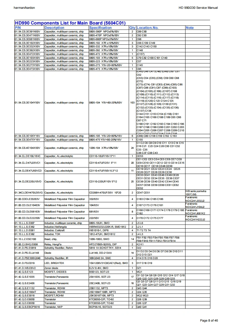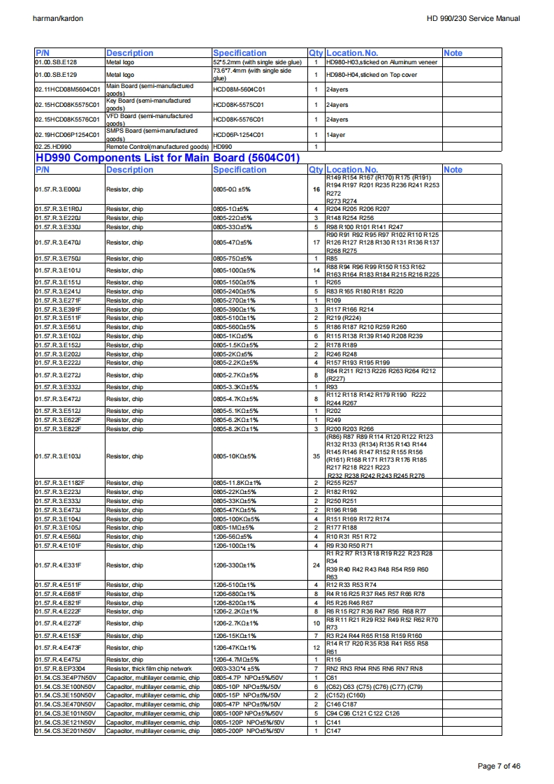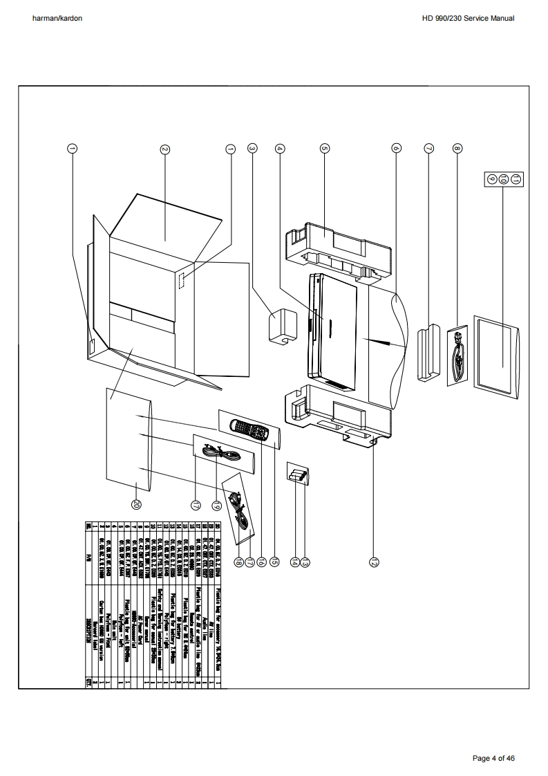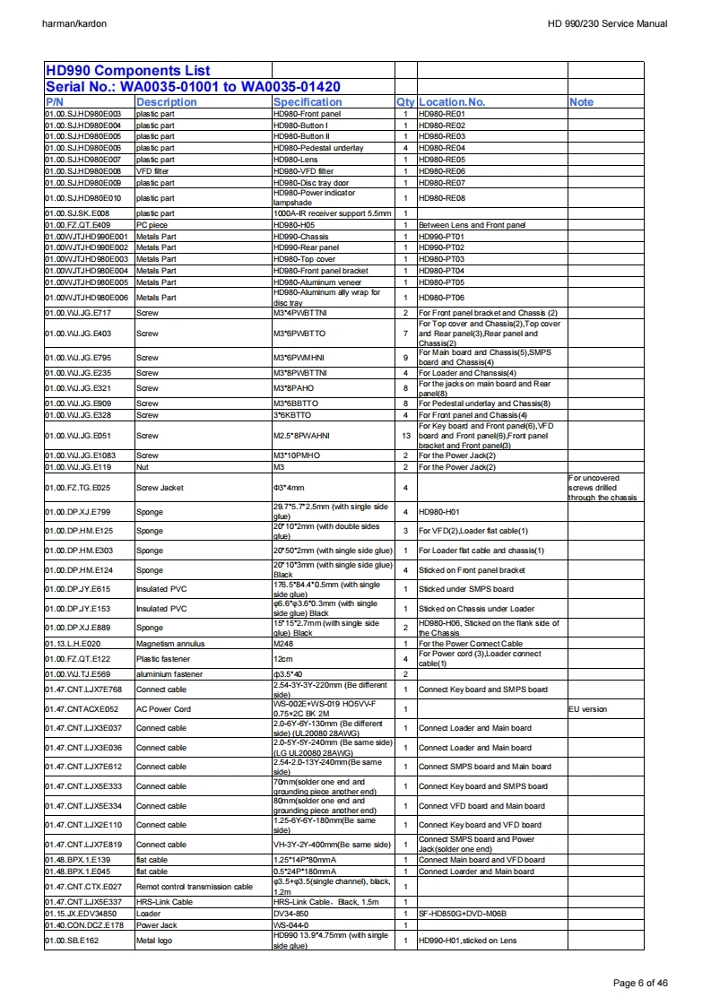 harman/kardonService ManualHD990/230CD PlayerO圆蟈140:46:58harman/kardonCONTENTSBASIC SPECIFICATIONSSEMICONDUCTOR PINOUTSTROUBLESHOOTING GUIDE23PCB DRAWINGS30PACKAGE LIST AND PARTSVERSION HISTORYEXPLODED VIEW5SCHEMATIC DIAGRAMS35-46PARTS LIST6SERVICE BULLETIN,RATTLE NOISE47Released EU2009Harman InternationalRev1,05/20128500 Balboa BoulevardNorthridge,California 91329