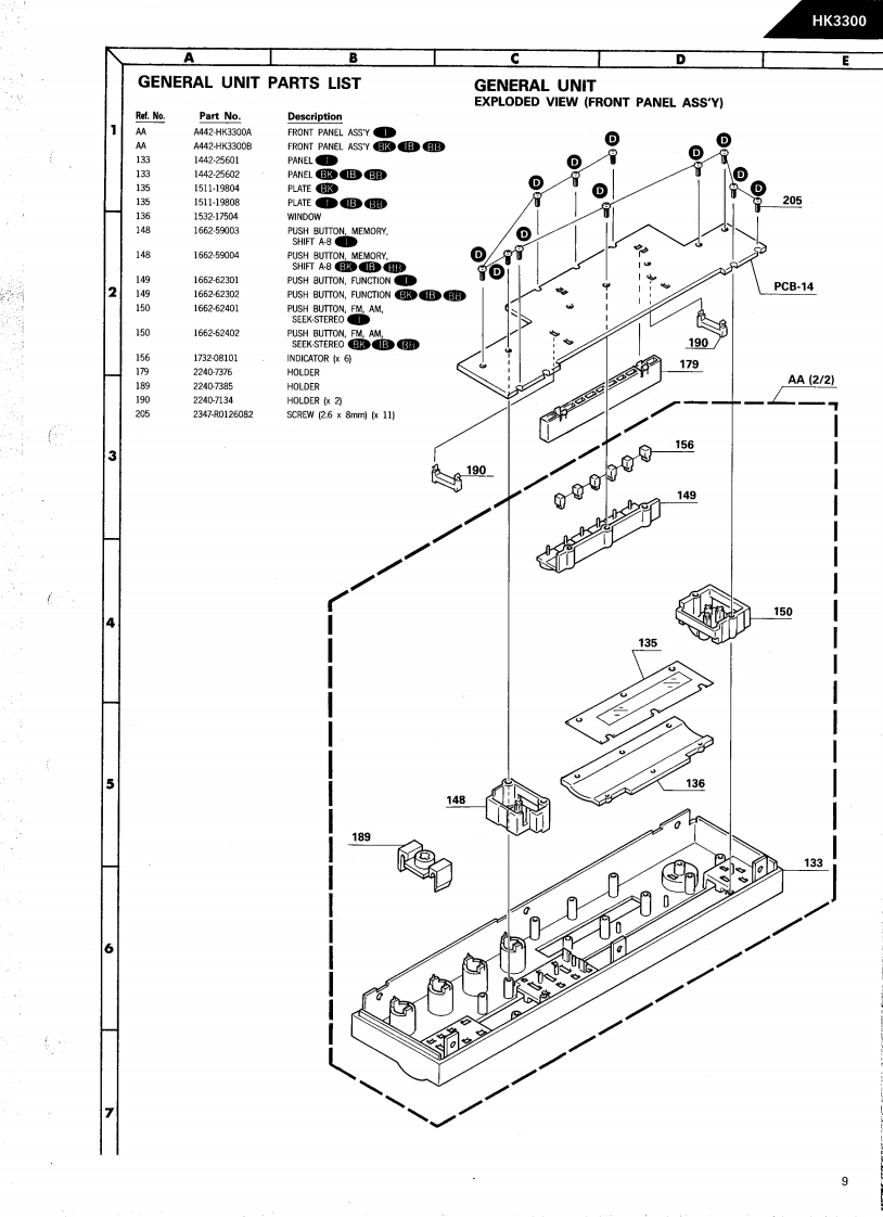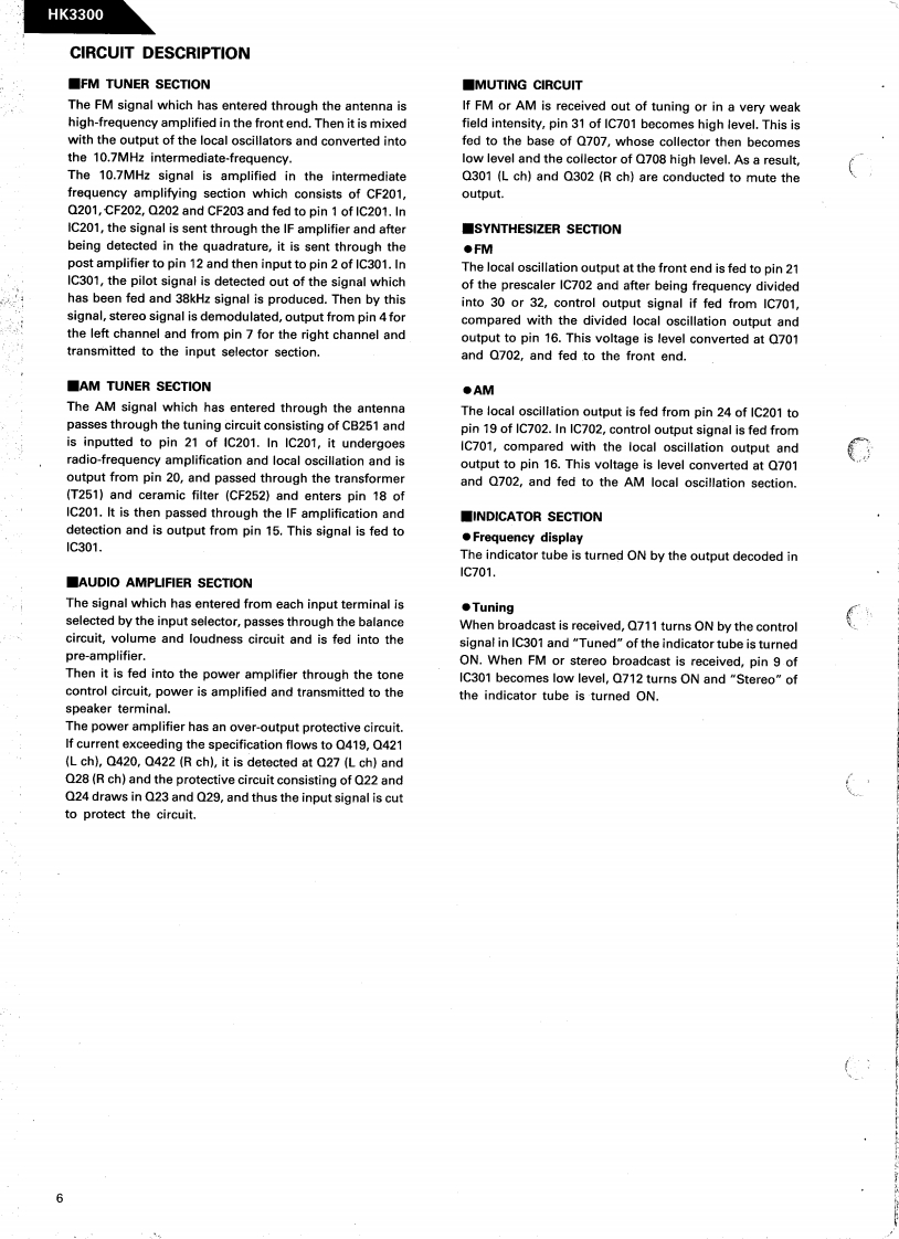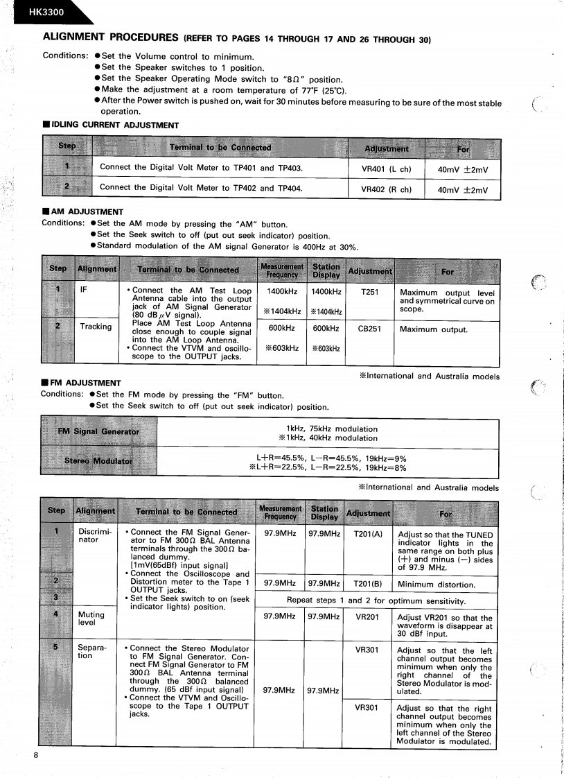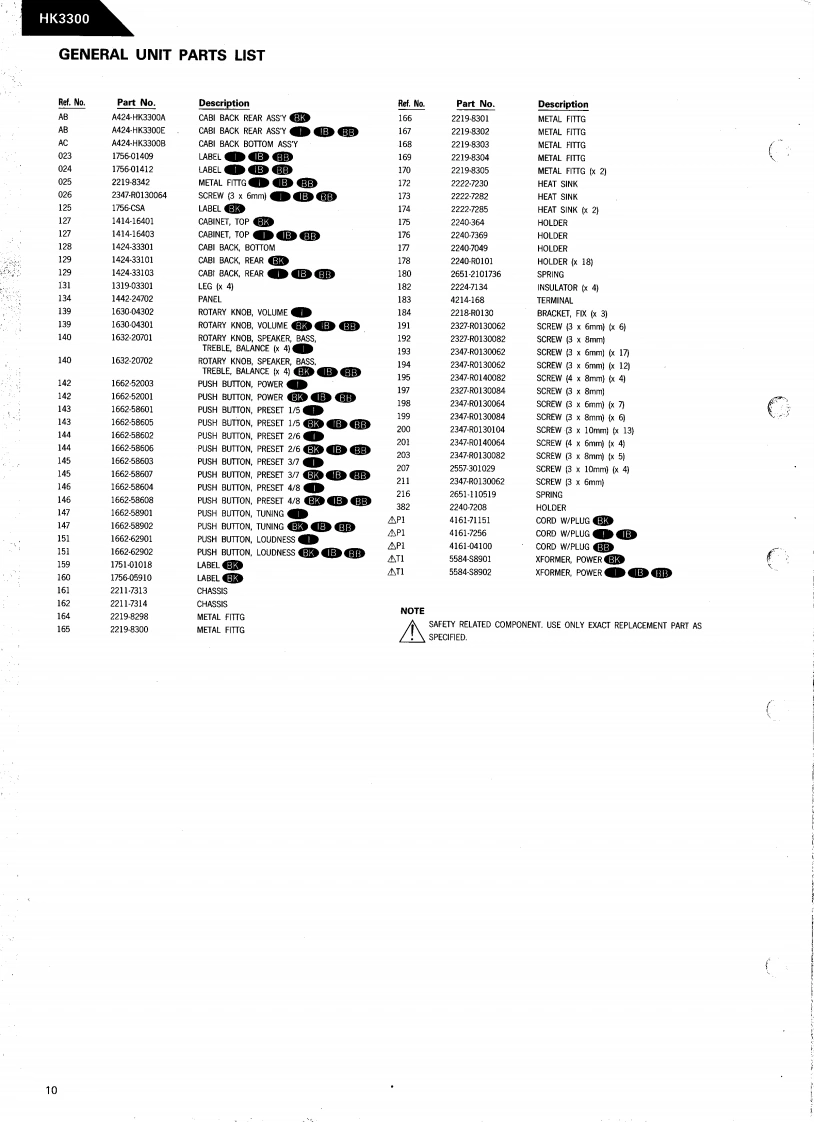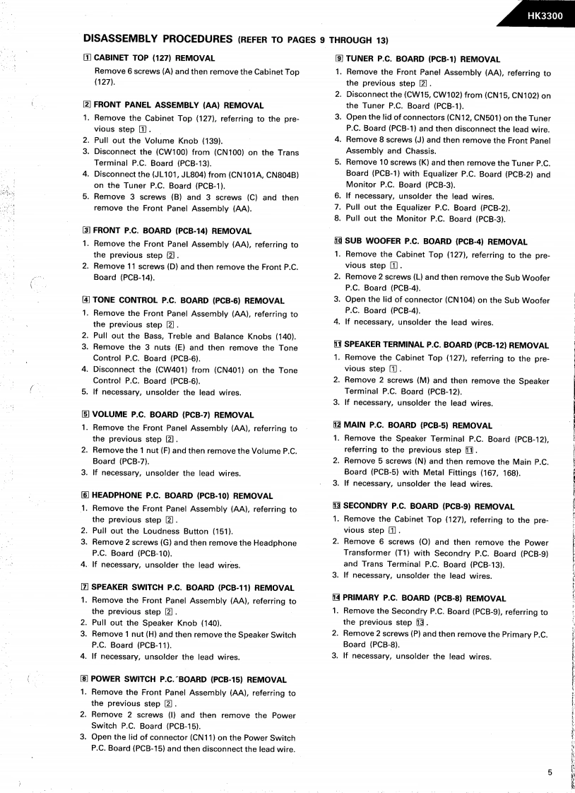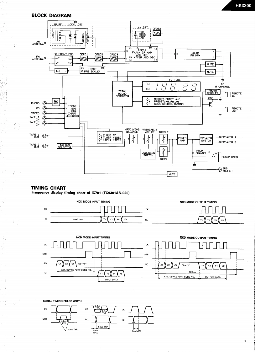 The Harman KardonModel HK3300Manual 167BSTEREO RECEIVERTechnical Manualharman/kardonHK3300188.88.a08This manual is to be applied to the North America area model withserial number S189-04202 and above,and International andAustralia models.The following marks found in the parts list of this manual identifythe models as follows.6KNorth America area model Black versionInternational modelBInternational model Black versionAustralia model Black versionCONTENTSSPECIFICATIONS4…2ALIGNMENT PROCEDURES.........................8LEAKAGE TEST..........................................................3GENERAL UNITPOWER CORD REPLACEMENT.......................3(EXPLODED VIEW,PARTS LIST)................9CONTROLS FUNCTIONS..........................4VIRING DIAGRAM…12DISASSEMBLY PROCEDURES............5P.CnB0ARDS14CIRCUIT DESCRIPTION...........6ELECTRICAL PARTS LIST.......................18BL0 CK DIAGRAM…7IC BLOCK DIAGRAM/IC TERMINAL FUNCTIONS......-..25TIMING CHART…7SCHEMATIC DIAGRAM…25harman/kardon240 Crossways Park West,Woodbury,N.Y.117971112-3152167B0P.0791052000 Printed in JapanHK3300