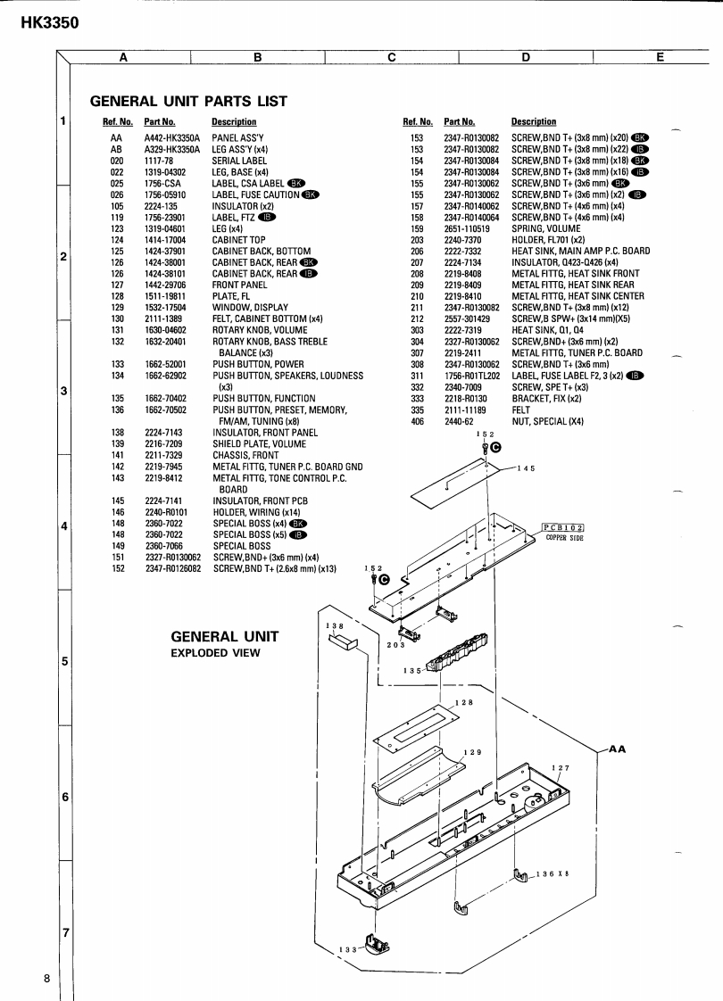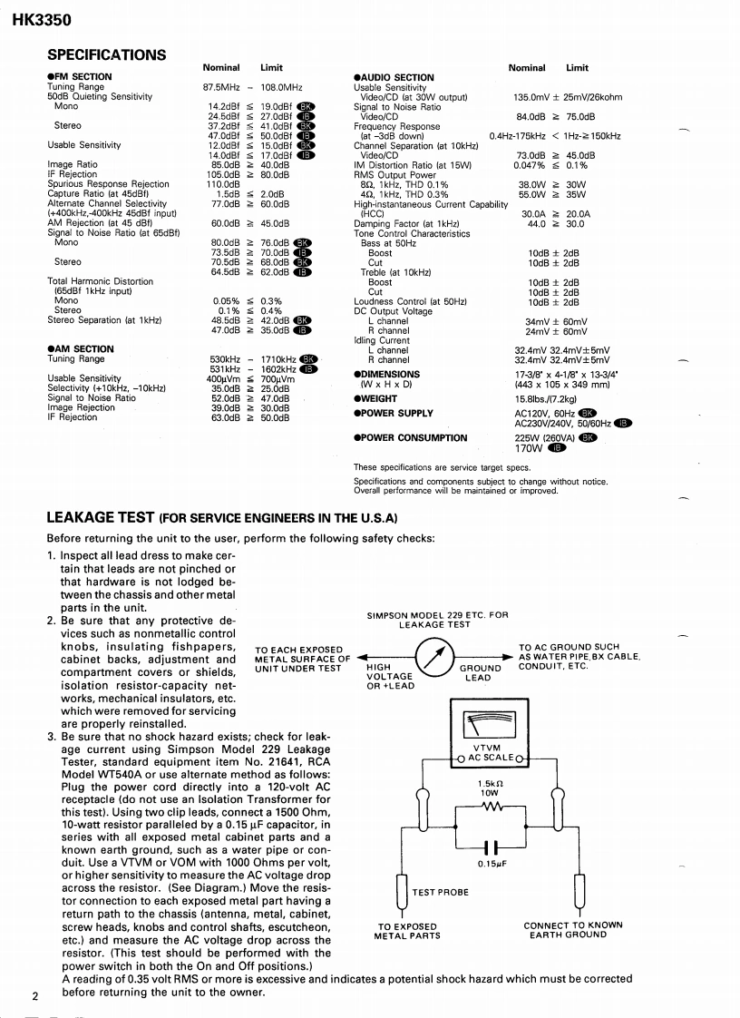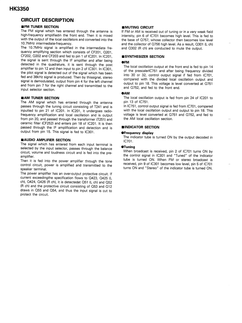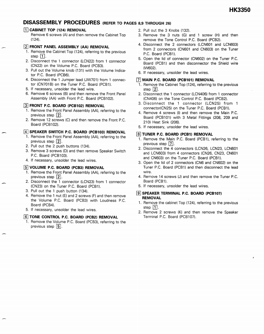 The Harman KardonModel HK3350Manual 191ASTEREO RECEIVERTechnical Manual工harman/kardon HK3350....The following marks found in the parts list of this manual identifythe models as followsK:North America area model Black versionInternational model Black versionCONTENTSSPECIFICATIONS...................................2GENERAL UNITLEAKAGE TEST444…(EXPLODED VIEW,PARTS LIST).8DISASSEMBLY PROCEDURES.......3PC.BOARDS.........................10CIRCUIT DESCRIPTION....................4ELECTRICAL PARTS LIST.13BL0 CK DIAGRAM45IC BLOCK DIAGRAM/IC TERMINAL FUNCTIONS.19TIMING CHART+..............................SCHEMATIC DIAGRAM...21ALIGNMENT PROCEDURES.........6WIRING DIAGRAM..........................26harman/kardonParts and Service Office240 Crossways Park West,Woodbury,N.Y.117971112-0550A152 K9311 1500 Printed in Japan