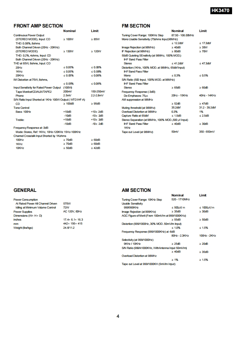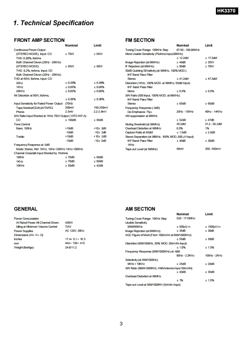 The Harman KardonModeL HK 3370 /HK 3470Manual ASTEREO RECEIVERTechnical Manualharman/kardon 308o0OCONTENTSTECHNICAL SPECIFICATIONS..............3PARTS LIST....27ALIGNMENT PROCEDURES...............5IC BLOCK DIAGRAM..63CIRCUIT DESCRIPTION................8PRINTED CIRCUIT BOARDS..........71BLOCK DIAGRAM16SCHEMATIC DIAGRAMS77DISASSEMBLY PROCEDURES..............17WIRING DIAGRAM82EXPLODEDVIEW....................19PACKING MATERIAL83PRINCIPAL SCREW LOCATION..............21harman/kardonParts and Service Office80 Crossways Park West,Woodbury,N.Y.11797Printed in Korea