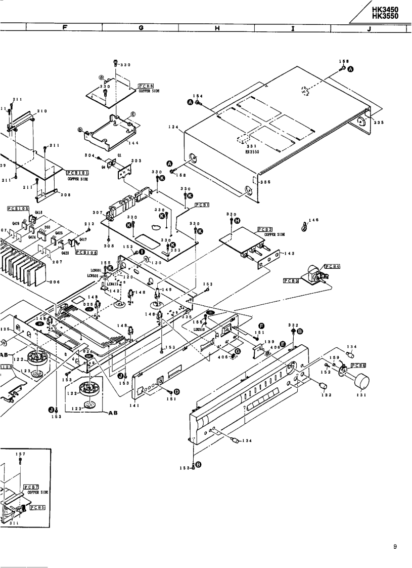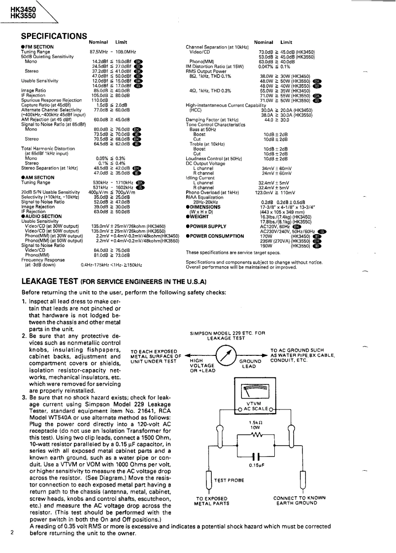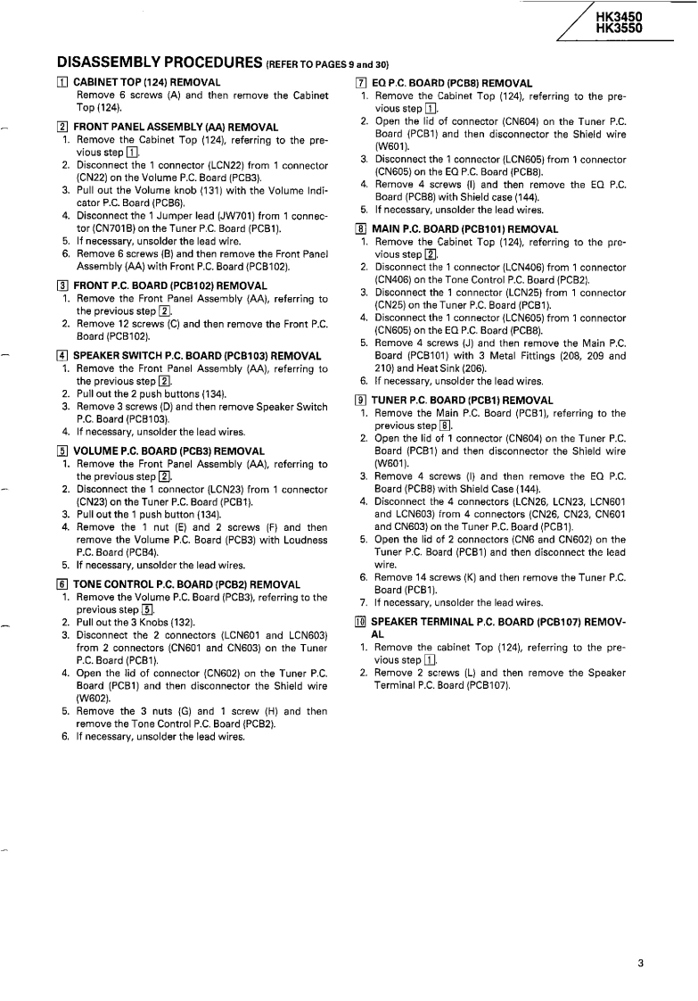 The Harman KardonModel HK3450/HK3550Manual 194ASTEREO RECEIVERTechnical Manualharman/kardon550s..The following marks found in the parts list of this manual identify the models asfollows:HK3550BKNorth America area model Black versionHK3450/HK3550BInternational model Black versionHK3450/HK3550International modelCONTENTSSPECIFICATIONS...2GENERAL UNIT EXPLODED VIEW........9LEAKAGE TEST.......................................................2PC,B0 ARDS....…DISASSEMBLY PROCEDURES..3ELECTRICAL PARTS LIST..13CIRCUIT DESCRIPTI0N*4ICBL0 CK DIAGRAMS…21BL0CKD列AGRAM…5IC TERMINAL FUNCTION.............23TIMING CHART...........................5SCHEMATIC DIAGRAMS......24ALlGNMENT PROCEDURES..........WIRING DIAGRAM......................................30GENERAL UNIT PARTS LIST....harman/kardonParts and Service Office80 Crossways Park West.Woodbury.N.Y.117971112-0600A152 K9404 1500 Printed in Japan