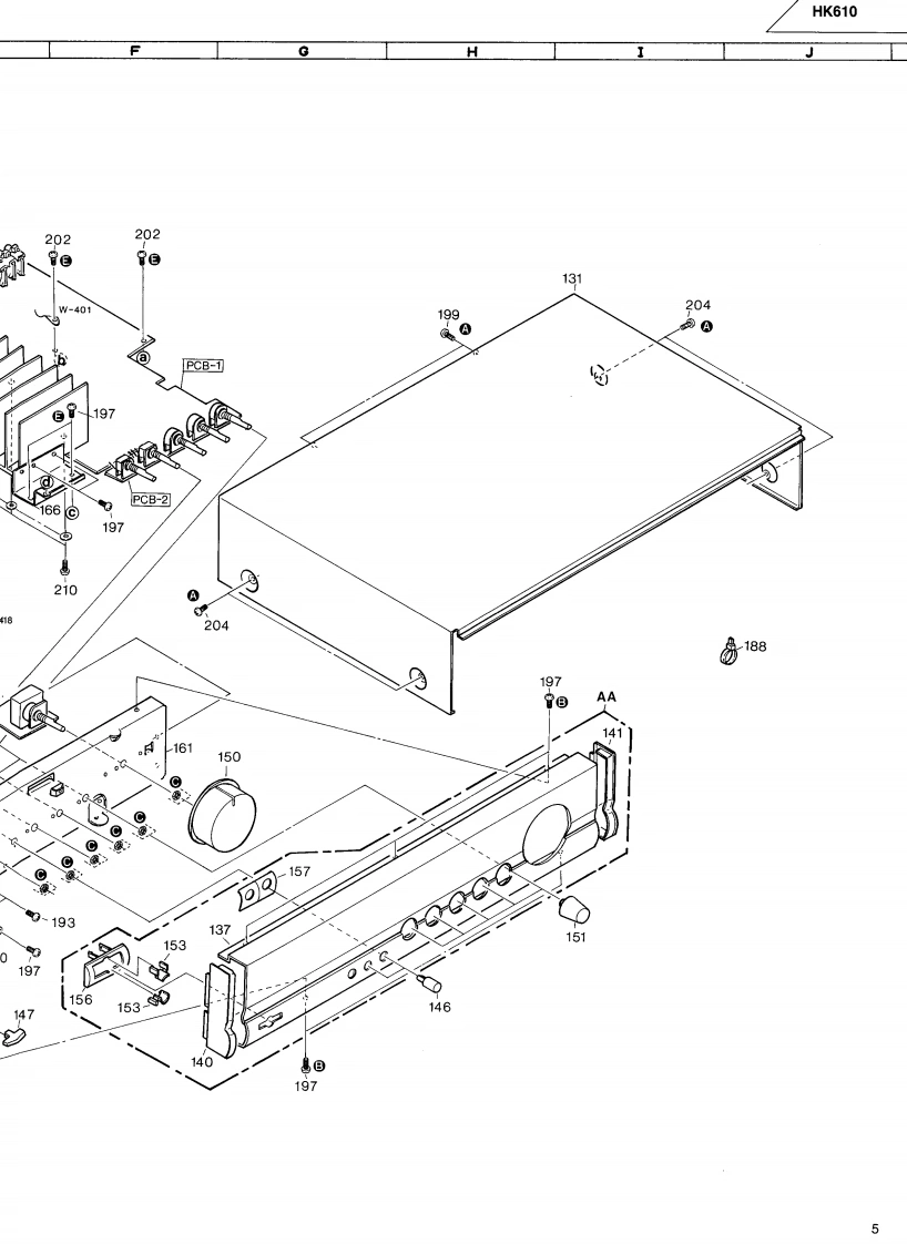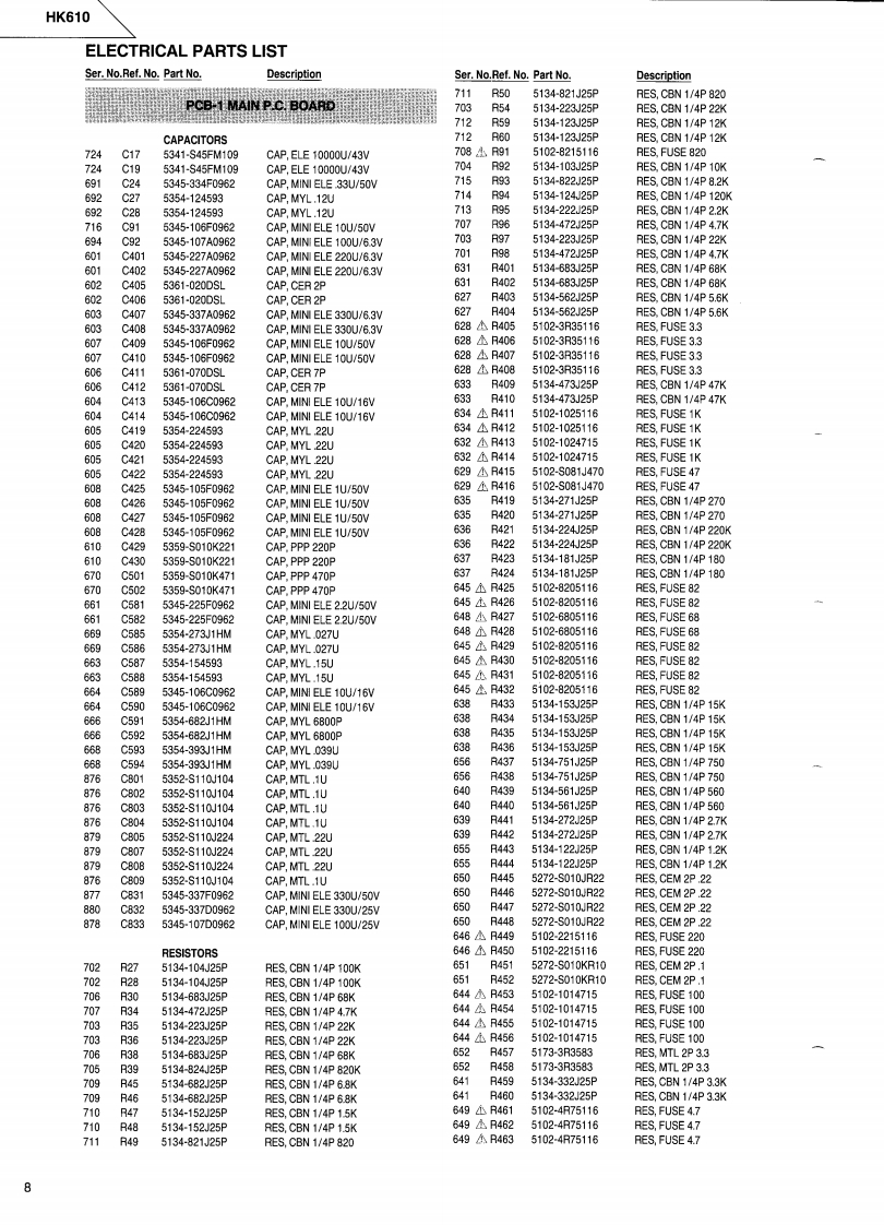 The Harman KardonModel HK610Manual 196AINTEGRATED AMPLIFIERTechnical Manualharman/kardon。66The following marks found in the parts list of this manualidentify the models as follows:International model Black versionInternational modelCONTENTSSPECIFICATIONS2WIRING DIAGRAM12DISASSEMBLY PROCEDURES2SCHEMATIC DIAGRAM13BLOCK DIAGRAMPH600 PHONO P.C.BOARD OPTIONCONTROLS AND FUNCTIONSHOW TO INSTALL--15ALIGNMENT PROCEDURES-4GENERAL UNIT PARTS LIST-15GENERAL UNIT PARTS LIST-P.C.BOARD16GENERAL UNIT5WIRING DIAGRAM16P.C.BOARDS6SCHEMATIC DIAGRAM17ELECTRICAL PARTS LISTELECTRICAL PARTS LIST-18harman/kardonParts and Service Office80 Crossways Park West,Woodbury.NY.117971112-HK610-A A9502 300 Printed in Japan