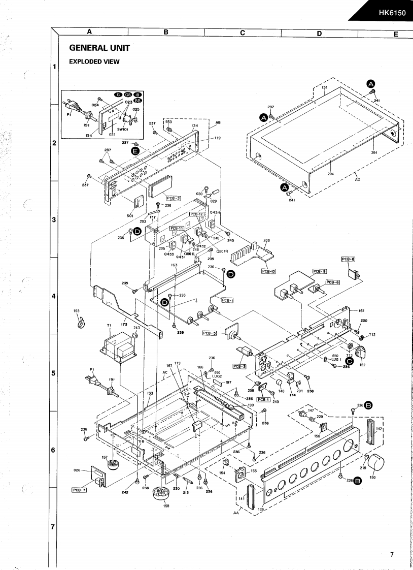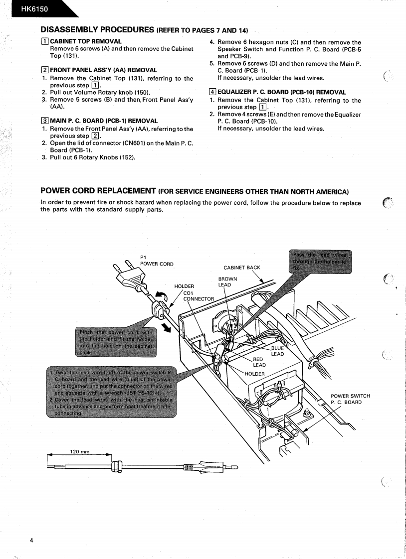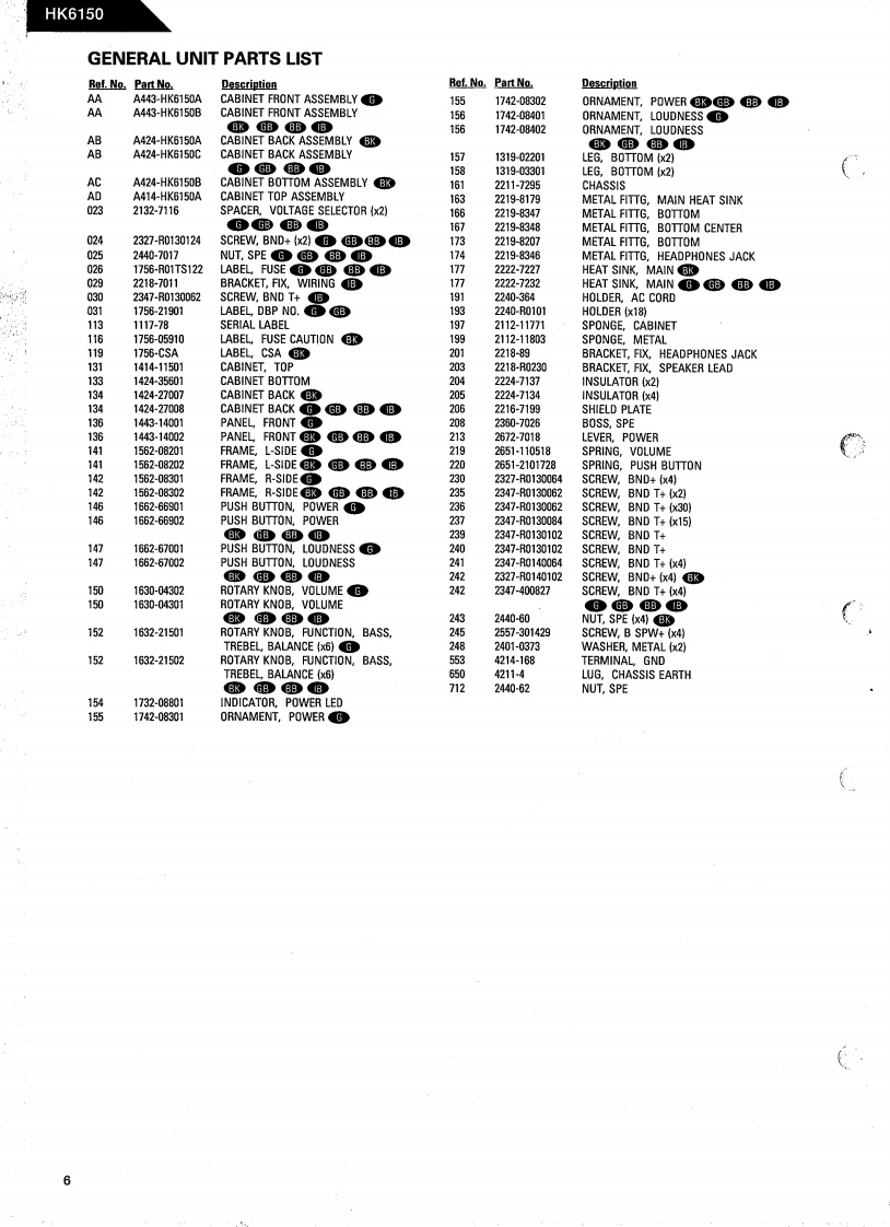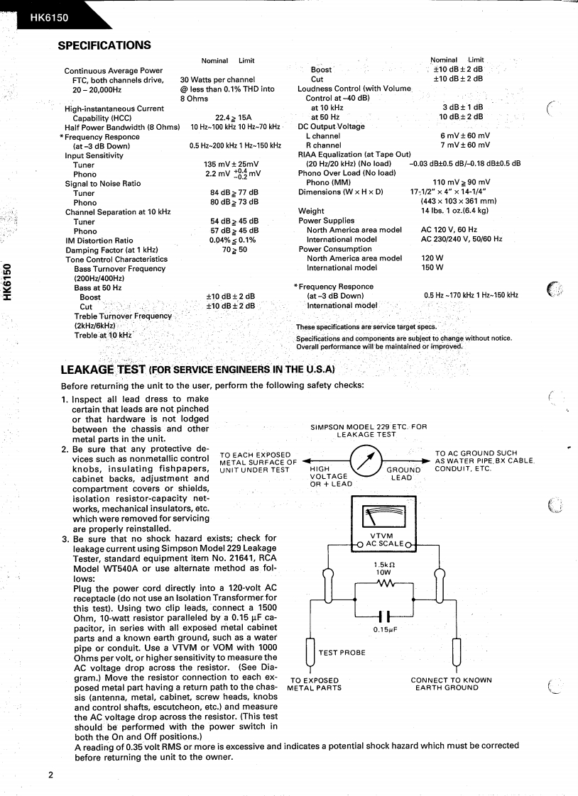 The Harman KardonModel HK6150Manual 181AINTEGRATED AMPLIFIERTechnical ManualHK6150harman kardon FK网The following marks found in the parts list of this manualidentify the models as follows.North America area model Black versionGerman modelB:German model Black versionBB:Australian model Black versionInternational model Black versionCONTENTSSPECIFICATIONS…2GENERAL UNIT PARTS LIST........6LEAKAGE TEST..GENERAL UNIT......CONTROLS AND FUNCTIONS.........3P.C.BOARDS ....DISASSEMBLY PROCEDURES ................4ELECTRICAL PARTS LIST..............10POWER CORD REPLACEMENT ...............4SCHEMATIC DIAGRAMS....12BLOCK DIAGRAM...5WIRING DIAGRAM........14ALIGNMENT PROCEDURES...........5harman/kardonParts and Service Office240 Crossways Park West,Woodbury.N.Y.117971112-0160A152P.1292011500 Printed in Jepan