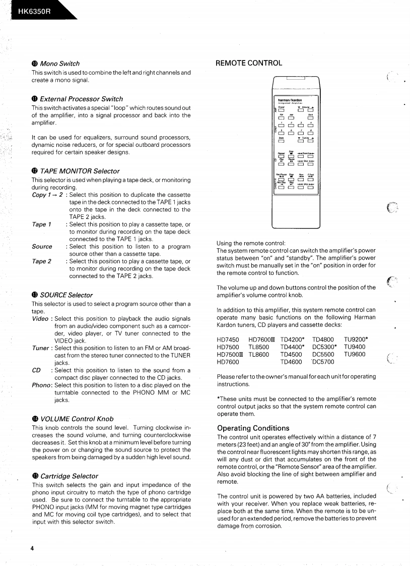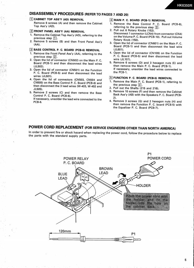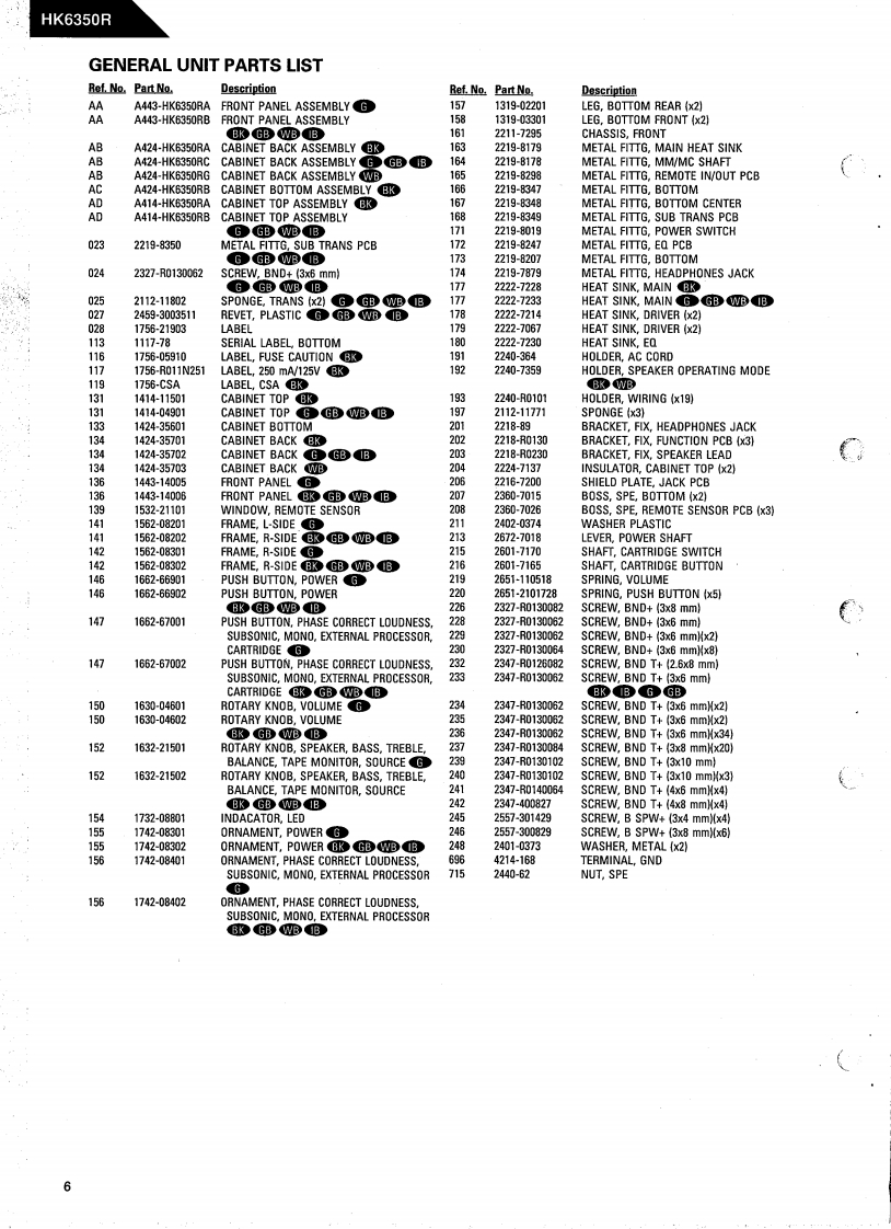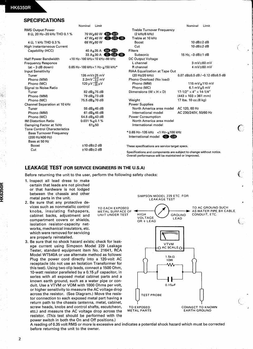 The Harman KardonModel HK6350RManual 183AINTEGRATED AMPLIFIERTechnical Manualharman/kardon H635.......The following marks found in the parts list of this manualHK6350Ridentify the models as follows.North America area model Black versionGerman model3:German model Black versionInternational model Black versionB:Asia/Oceania model Black versionCONTENTSSPECIFICATIONS.........2ALIGNMENT PROCEDURES ..............8LEAKAGE TEST…2BLOCK DIAGRAM.8CONTROL AND FUNCTIONS.................3P.C.BOARDS....DISASSEMBLY PROCEDURES.....5ELECTRICAL PARTS LIST................2POWER CORD REPLACEMENT.........5SCHEMATIC DIAGRAMS17GENERAL UNIT PARTS LIST.......................6WIRING DIAGRAM...................20GENERAL UNIT ...........harman/kardonParts and Service Office240 Crossways Park West,Woodbury,N.Y.117971112-0200A152 P-129201 1500 Printed in Japan