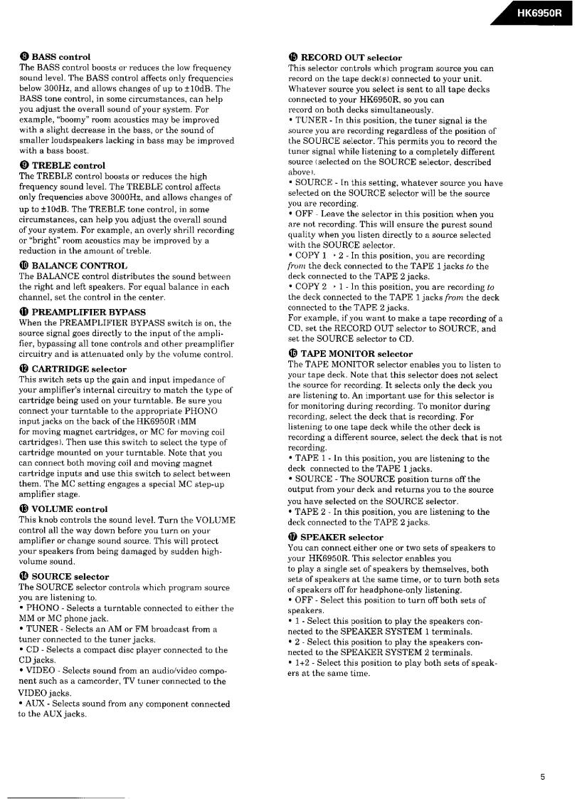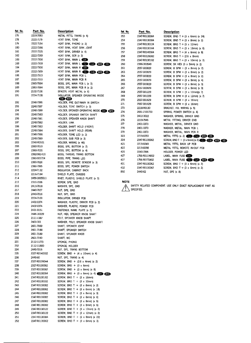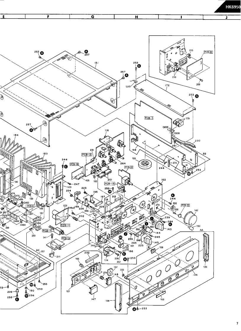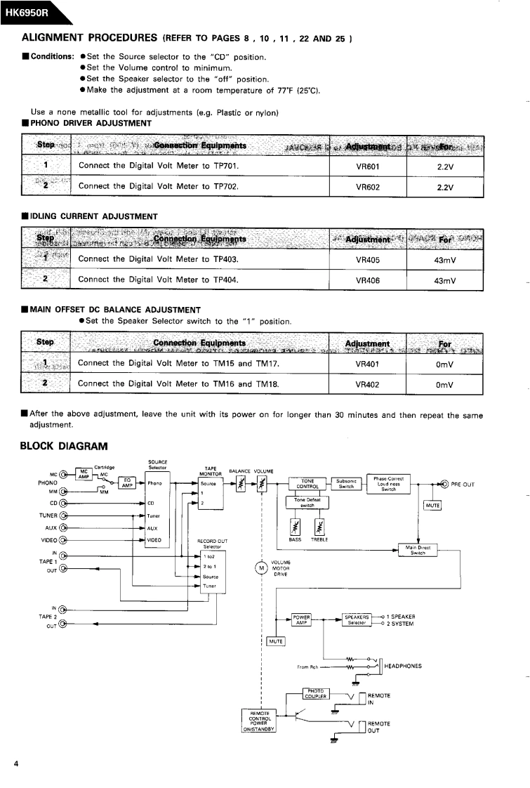 The Harman KardonModel HK6950RManual 187AINTEGRATED AMPLIFIERTechnical Manualh3 rman kardon HK行sThe following marks found in the parts list of this manualidentify the models as follows.North America area model Black versionGerman model68German model Black version⑧:International model Black versionWBAsia/Oceania model Black versionCONTENTSSPECIFICATIONS…2GENERAL UNIT PARTS LIST......................................6LEAKAGE TEST……2GENERAL UNIT…7DISASSEMBLY PROCEDURES........3P.C.B0A月DS4+4*…8POWER CORD REPLACEMENT.........3ELECTRICAL PARTS LIST...............12ALIGNMENT PROCEDURES..........4SCHEMATIC DIAGRAMS…21BLOCK DIAGRAM4444…4VIRING DIAGRAM…26CONTROLS FUNCTIONS..................5harman/kardonParts and Service Office240 Crossways Park West,Woodbury,N.Y.117971112-0250A152P.0792061500 Printed in J8p8nHK6950R