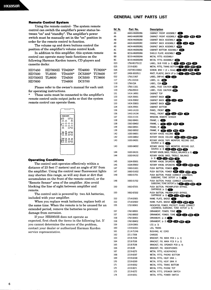 The Harman KardonModel HK6950RManual 187AINTEGRATED AMPLIFIERTechnical Manualharman kardon HK6g5时The following marks found in the parts list of this manualidentify the models as follows.North America area model Black versionGerman modelG3German model Black versionInternational model Black versionAsia/Oceania model Black versionCONTENTSSPECIFICATIONS…2GENERAL UNIT PARTS LIST......................6LEAKAGE TEST…2GENERAL UN|T…7DISASSEMBLY PROCEDURES.....3P.C.B0ARDS…8POWER CORD REPLACEMENT.........3ELECTRICAL PARTS LIST....12ALIGNMENT PROCEDURES..................................4SCHEMATIC DIAGRAMS............................21BLOCK DIAGRAM…4VIRING DIAGRAM…26CONTROLS FUNCTIONS.....................5harman/kardonParts and Service Office240 Crossways Park West,Woodbury,N.Y.117971112-0250A152P.0792061500 Printed in J8panHK6950R
